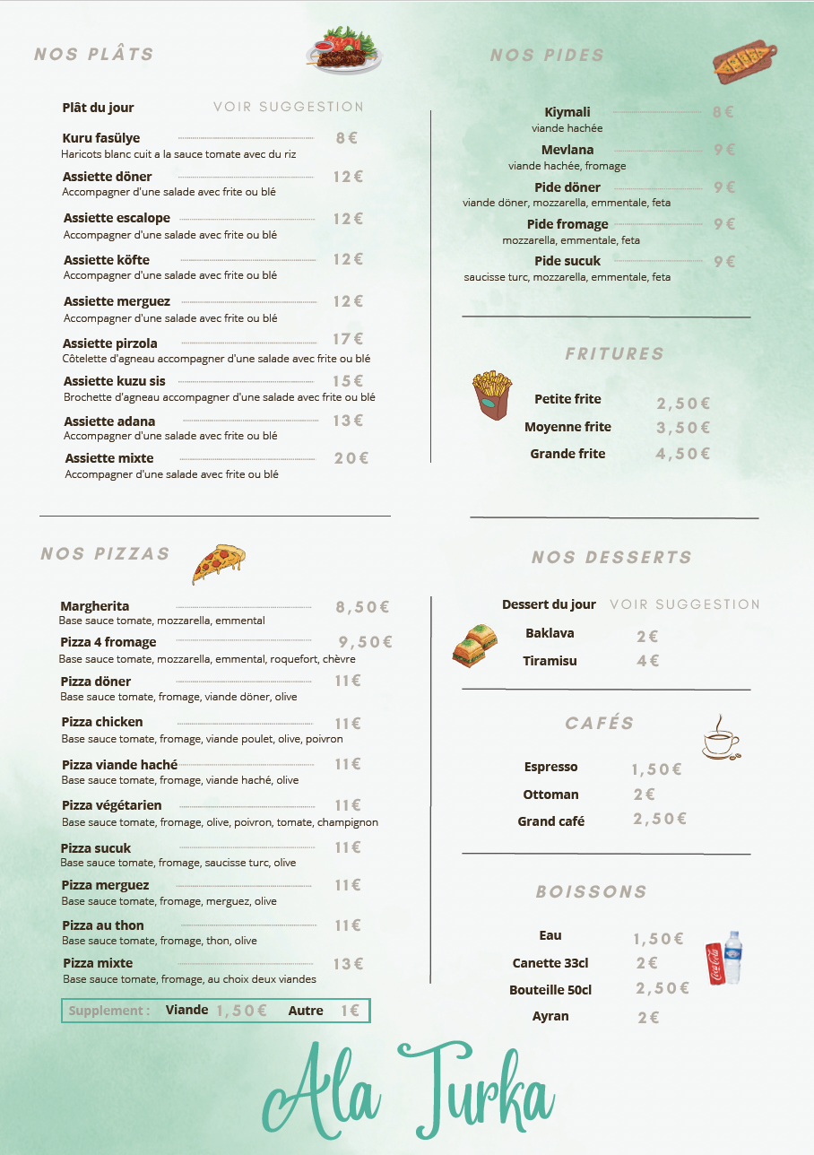 Il y a encore quelques mois, je pensais naïvement que la perfection n'existait pas et puis j'ai découvert AlaTurka. À première vue, on pourrait croire que c'est un simple snack générique... Mais c'est bien plus que ça ! Les plats proposés sont diversifiés et à des prix très accessibles. D'ailleurs, je vous conseille personnellement le Lahmacun Doner qui est à la fois gourmand et frais. Sans oublier le fameux thé turc qui est tout simplement le meilleur thé sur Terre. Le service est impeccable et les gérants toujours souriant. On s'y sent un peu comme dans une deuxième maison, comme si on était véritablement dans la ville de Konya. Finalement, Alaturka propose des repas délicieux et complets à des prix très honnêtes. Je vous recommande d'y manger absolument... C'est la meilleure cuisine turque de Colmar.