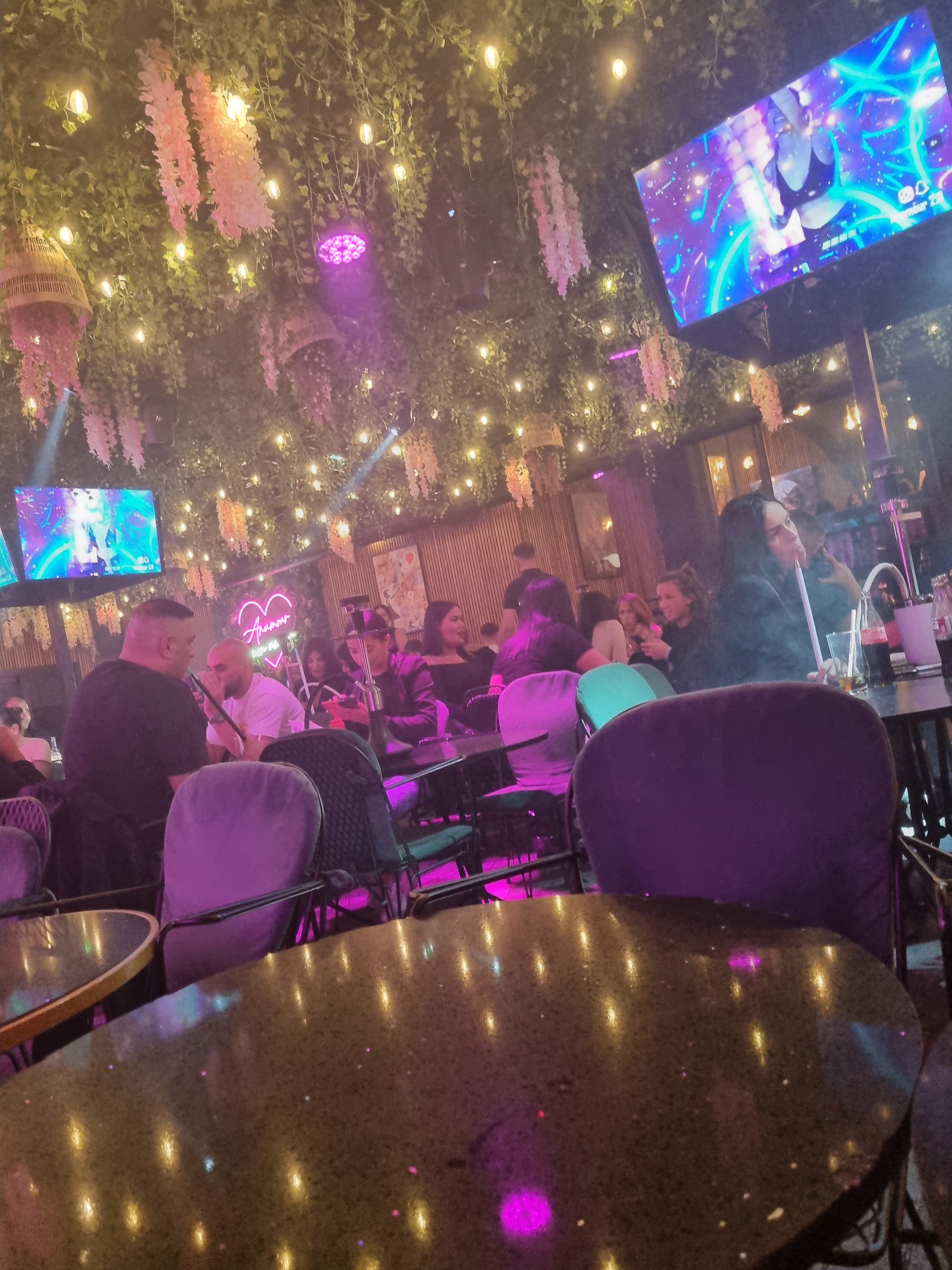 Bonne ambiance. Le dj quand j'y étais est juste énorme, j'y étais vendredi j'ai beaucoup apprécié l'ambiance. Il manque juste cette espace ou on peu se mettre debout pour apprécié la musique, c'est une chicha après tout pas un bar ambiance 🤣 mais c'est regrettable vu le taff du dj. Les serveurs sont à l'écoute et disponible j'ai apprécié