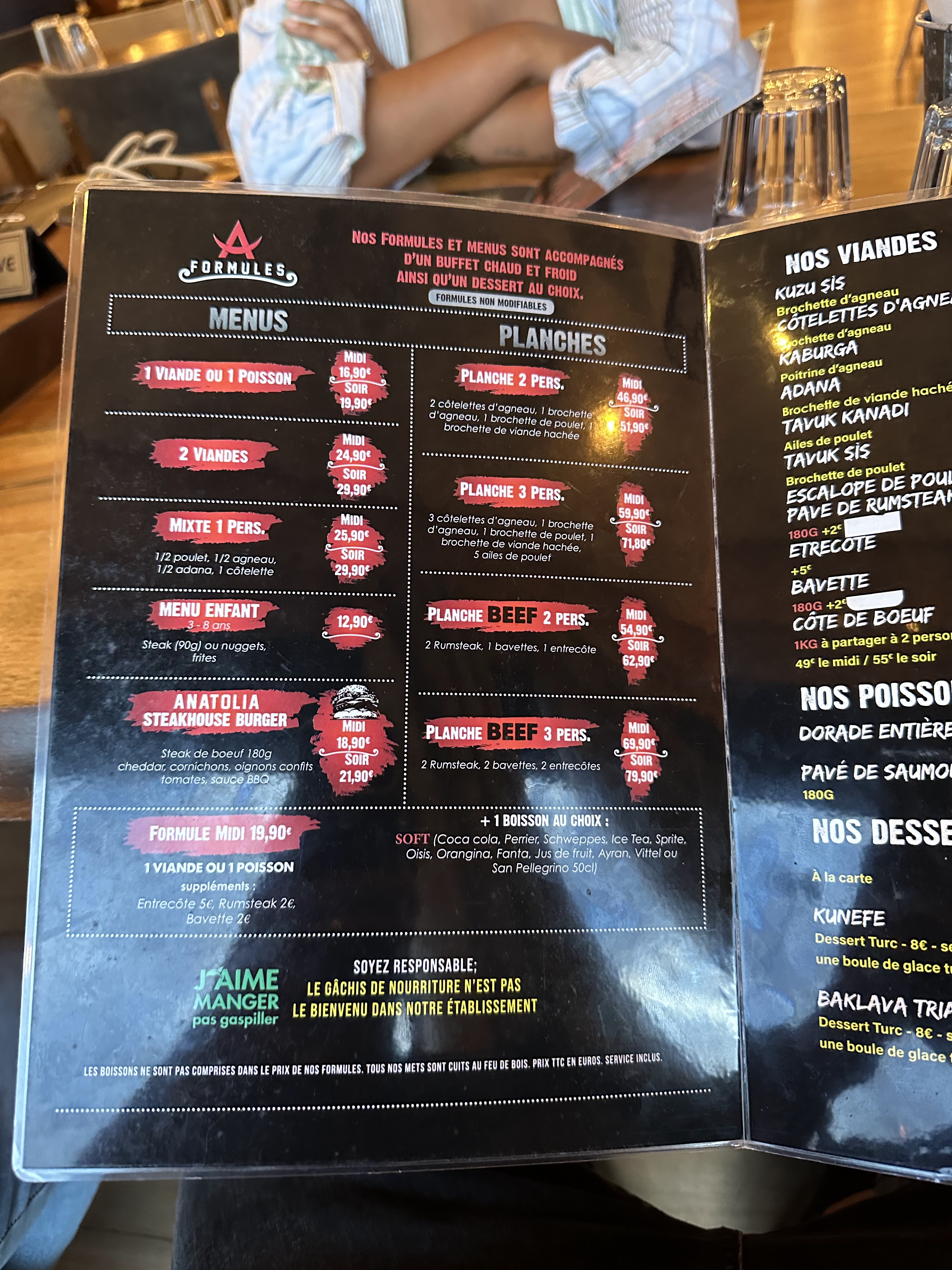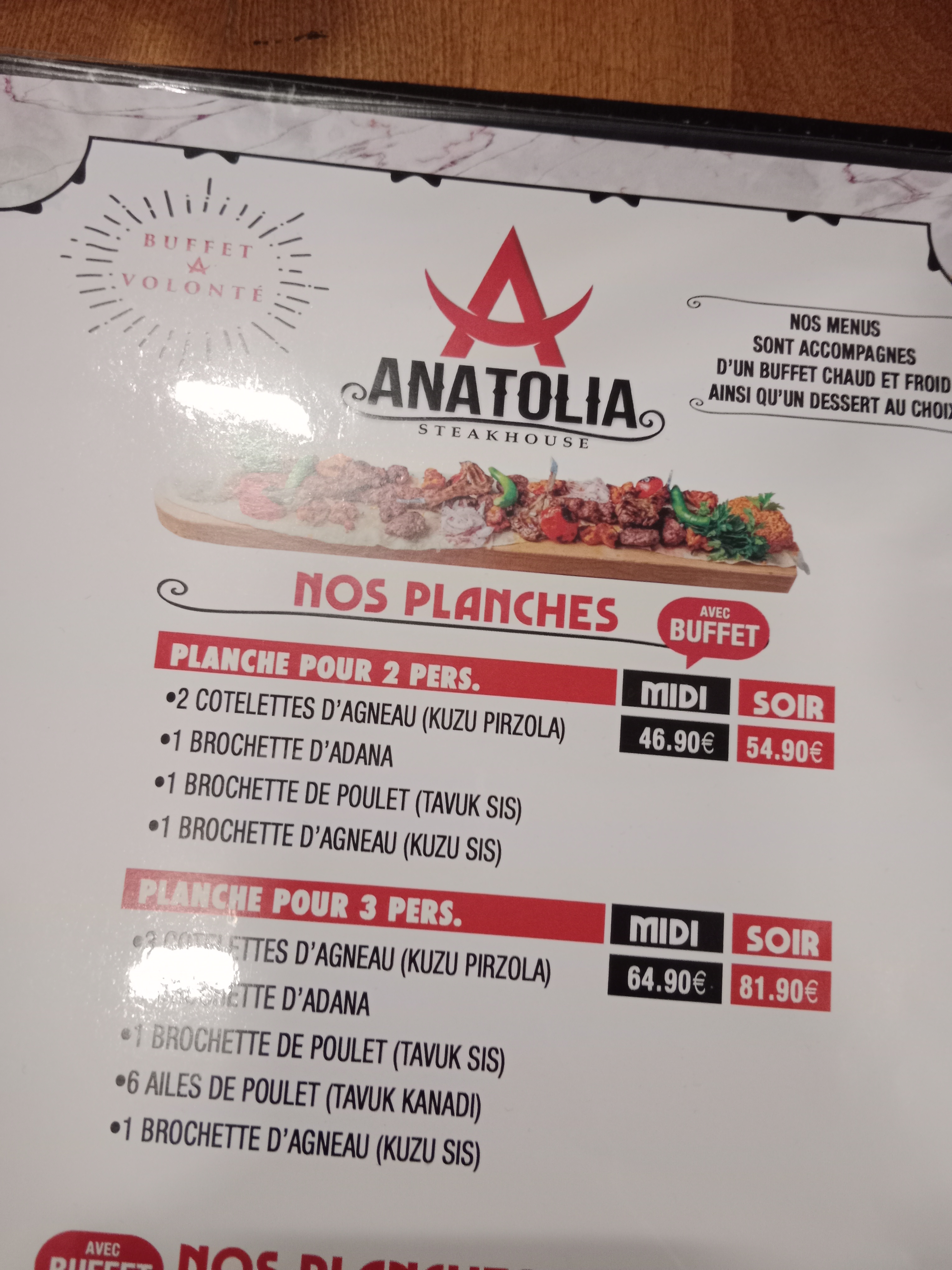 Je vous partager mon excellente expérience au Anatolia steakhouse, on y a dîner à plusieurs, une table de 15 et on a y super bien mangé, un buffet à volonté de spécialités turques très varié de plats chaud et froid excellent, en plus de ça les grillades ainsi que les Adana qui sont tellement bonne , la viande est bien tendre, sont accompagné de frites. J’ai pu goûter au Lahmacun que j’ai adorée 🥰 Le service était rapide que ce soit les boissons ou les plats. Un grand merci à la jeune femme qui nous a servi et qui s’est super bien occupé de nous du début à la fin, en plus d’être gentille, souriante, elle était au petits soins ce qui a rendu notre expérience plus agréable. Le petit thé turc à la fin un vrai délice, du thé à volonté 😁 qui dit mieux. En tout cas trop hâte d’y retourner avec mon mari. Un grand merci à toute l’équipe Anatolia steak house. Rim & Franck