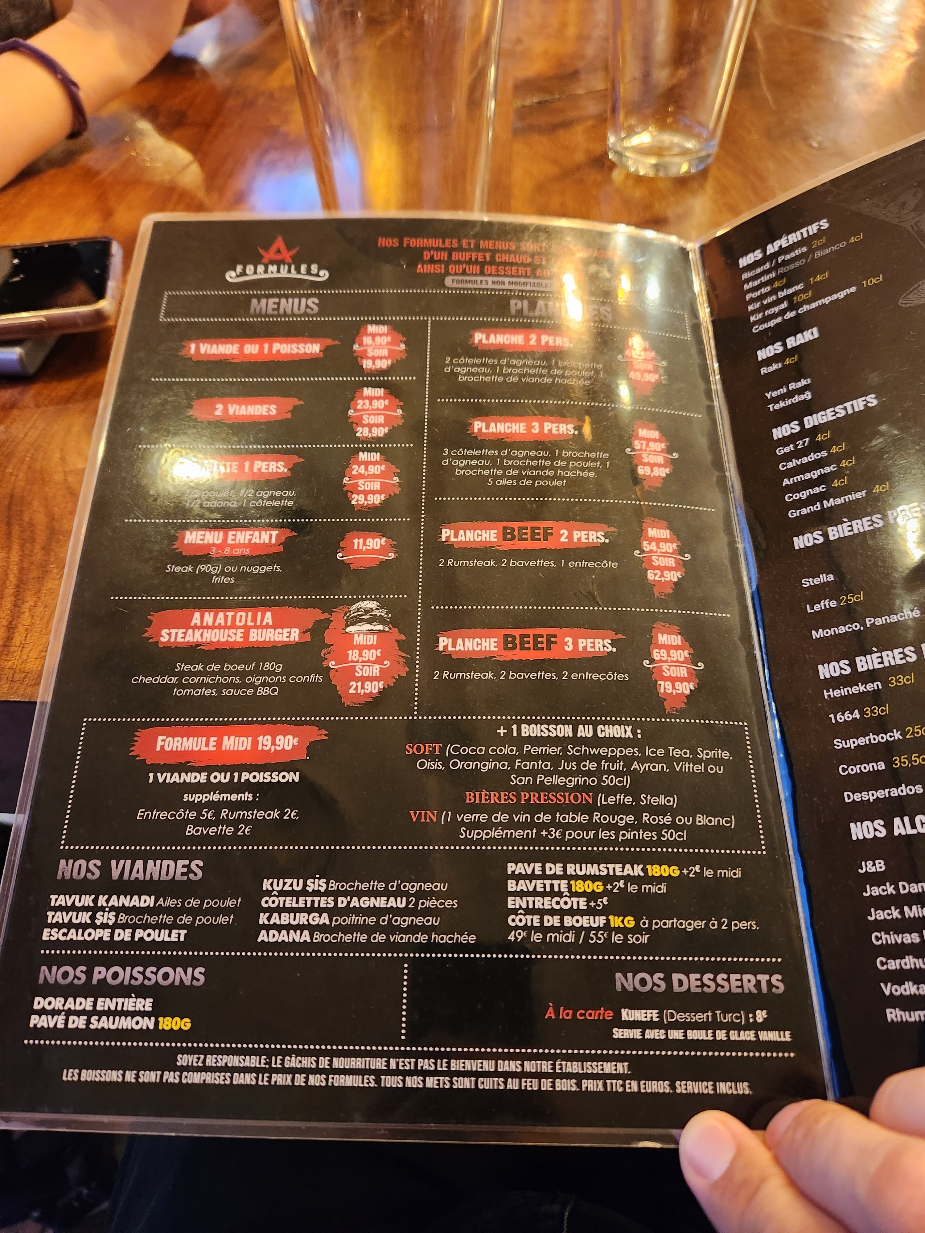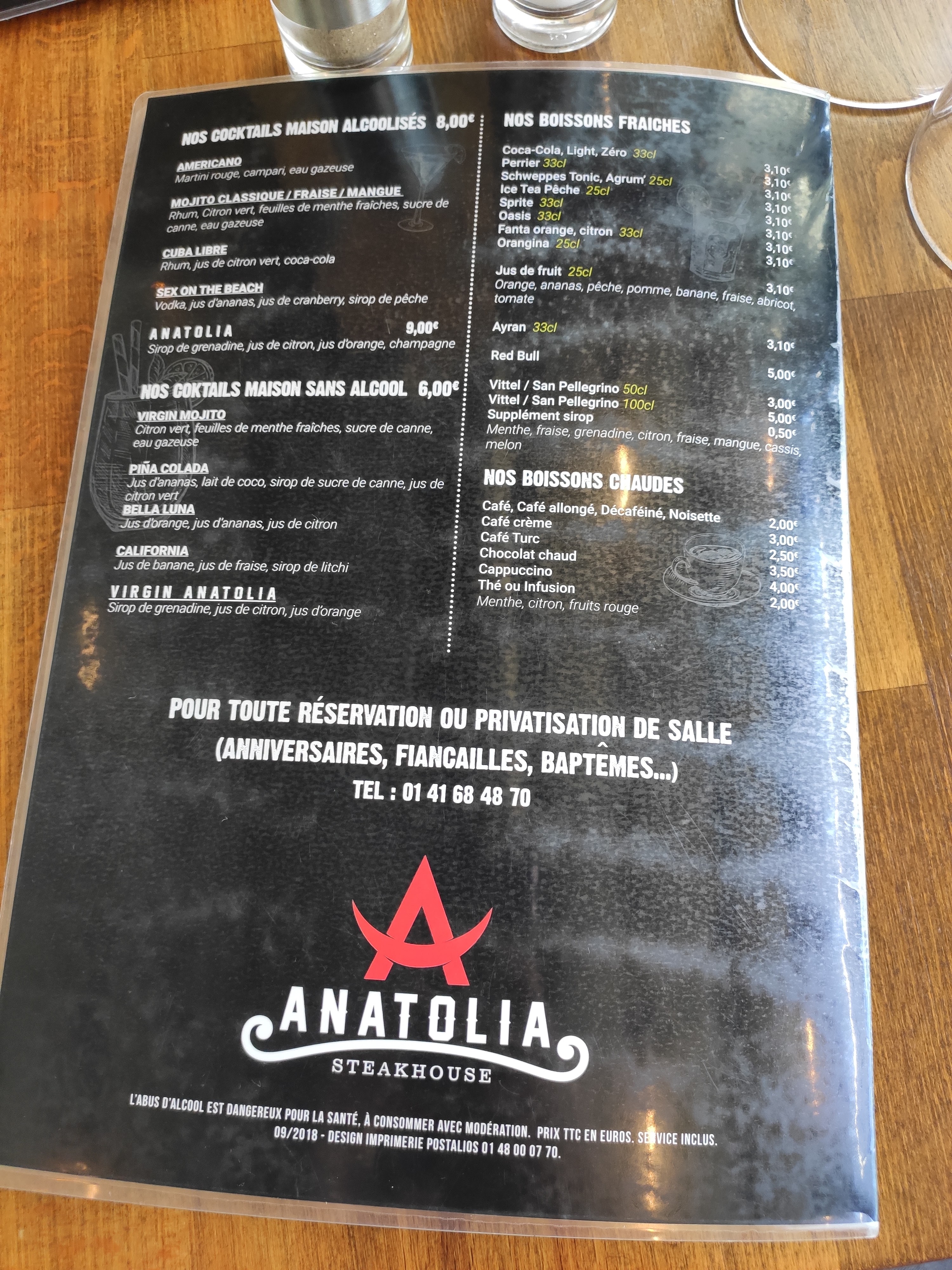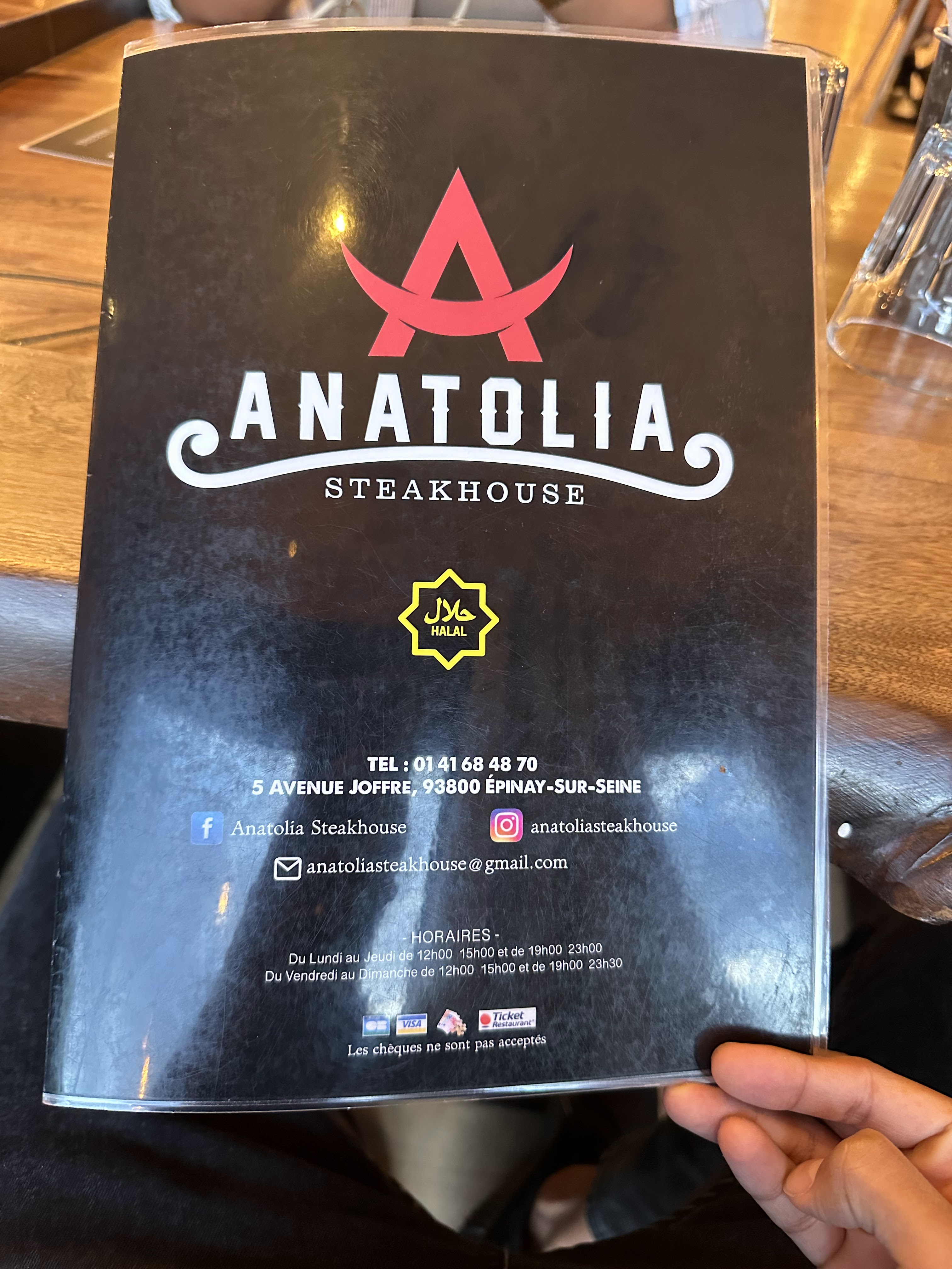 Bonjour M. Asdrubal, Nous pensons que vous vous trompez d’établissement. A l’Anatolia Steakhouse à Epinay-Sur–Seine (93800), l’accueil du client à son arrivée se fait par un(e) serveur(se) qui a déjà le nombre de menu correspondant au nombre de personne qu’il/elle leur donne à leur table. Le serveur prend le temps d’expliquer le concept aux nouveaux clients et prend ensuite leurs commandes. Le fait de dire que vous n’avez pas reçu le menu à votre arrivée, nous indique bien que vous n’étiez pas chez nous. Prenez le temps d’aller sur notre site: https://anatoliasteakhouse.fr/ Nous serions plus que ravis de vous accueillir dans notre restaurant. Cordialement, L’equipe Anatolia Steakhouse