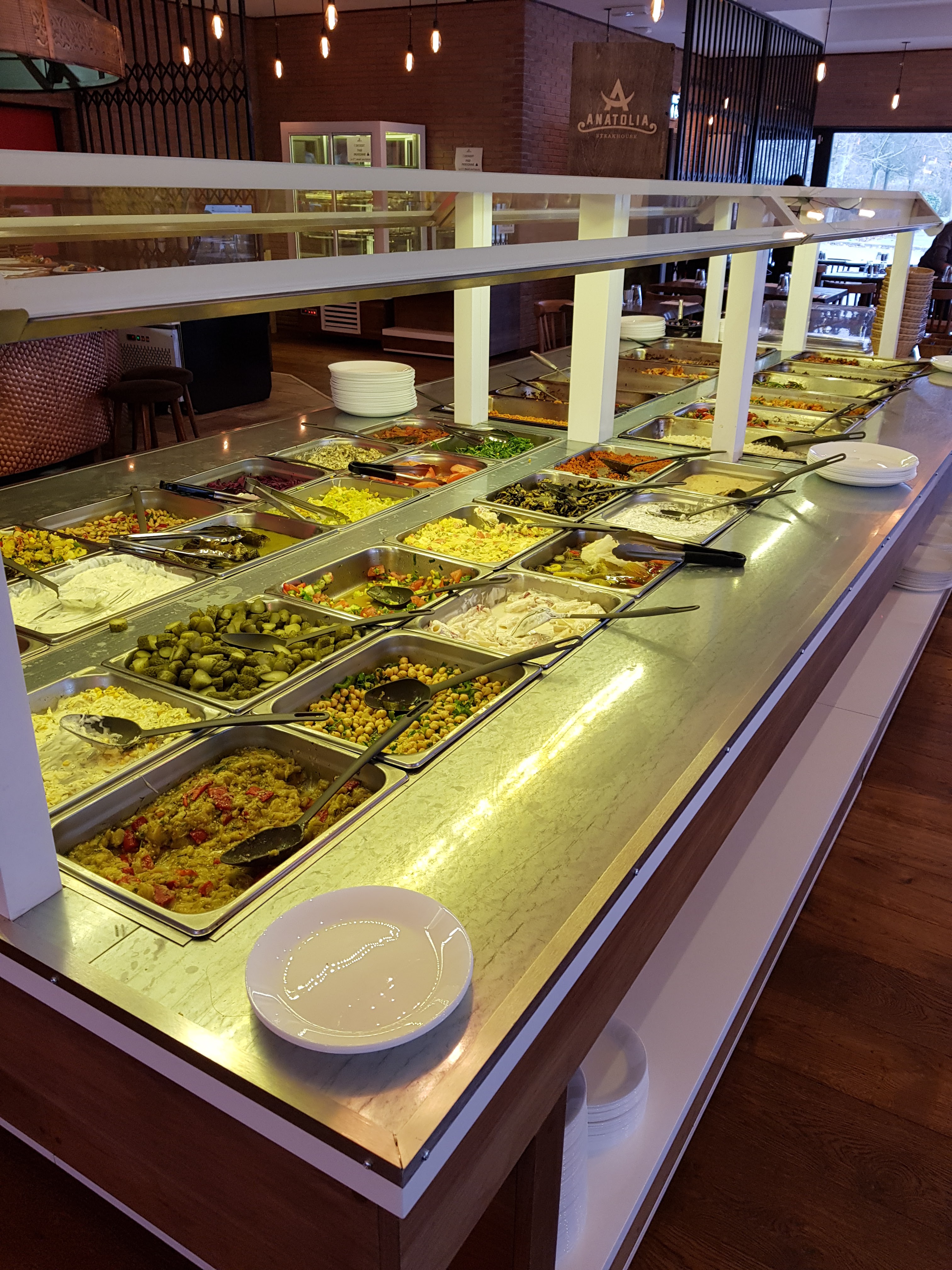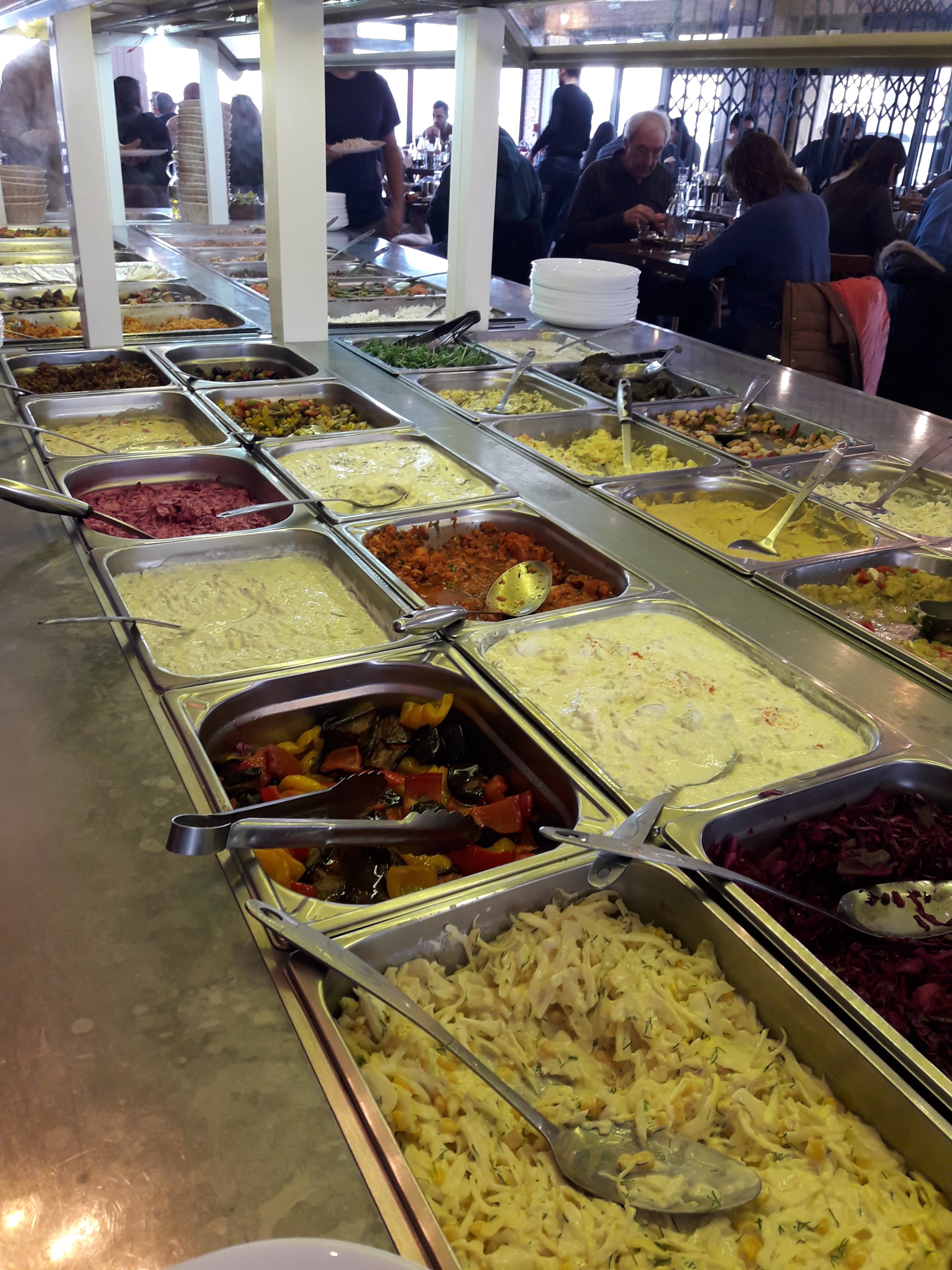 Endroit agréable en soit mais extrêmement bruyant. Les serveuses sont très agréables et compétentes. Cependant le temps d'attente était long, rien que pour nous indiquer notre table. Les prix sont beaucoup trop élevés pour ce qui est servi. Le buffet contient uniquement des légumes, assortiments de pâtes, du pain, des olives, des oignons et du riz. La qualité n'est d'ailleurs pas spécialement au rendez-vous. Pour les repas contenant la viande, elle n'est pas suffisamment goutue et la pizza turque est particulierement peu fournie en viande. Le rapport qualité/prix n'y est clairement pas, ce qui est dommage pour un si joli restaurant, bien placé qui plus est.
