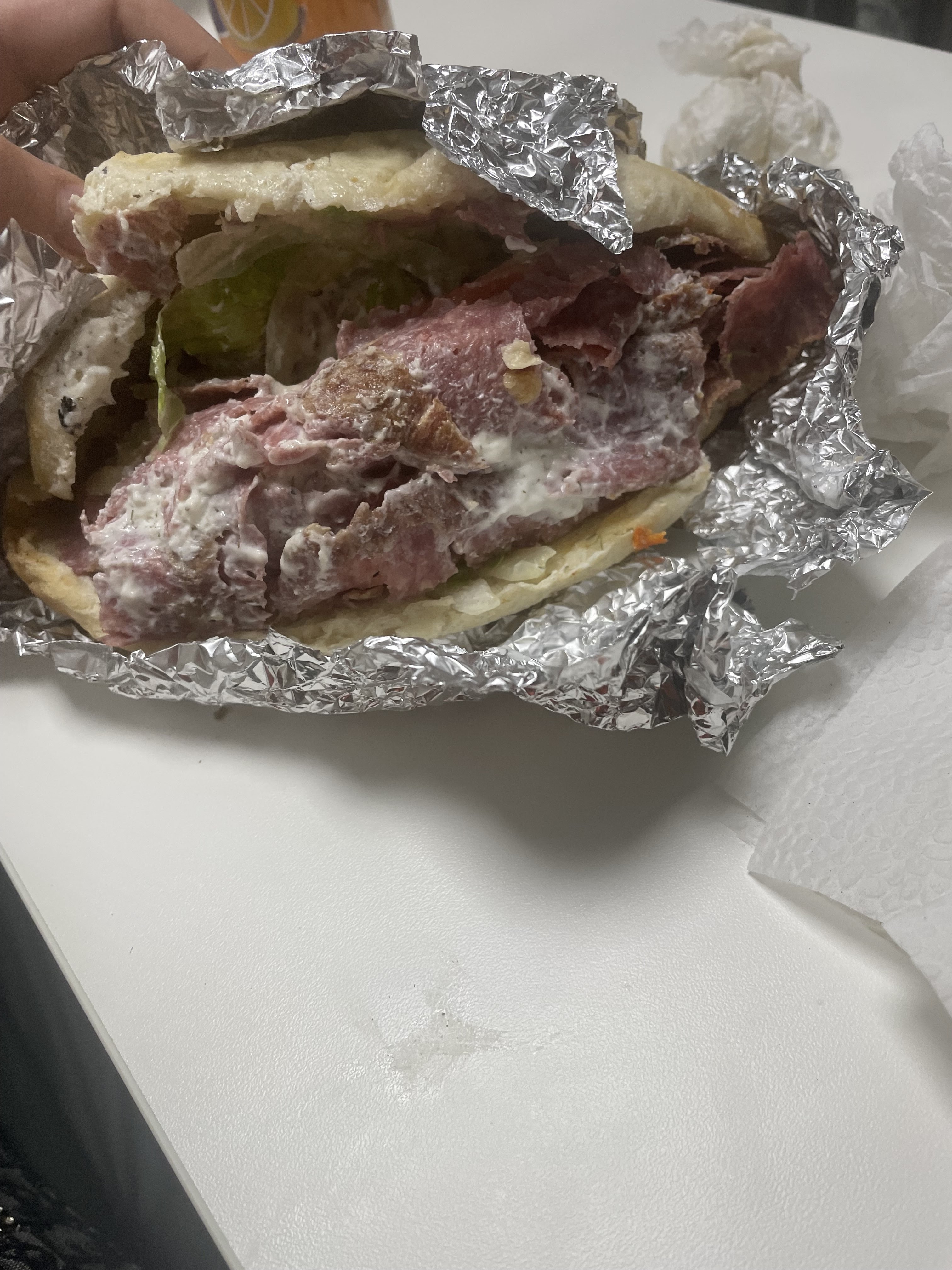 A première vu le kebab semblait excellent, une bonne odeur s'y échappait mais une fois ouvert, j'ai constaté que la garniture était logé davantage hors du pain qu'à l'intérieur. Une fois les doigts sales, j'ai entamé une première bouchée et j'a cru avoir un steak tartare dans la bouche, une viande pas cuite et une sorte de crème à l'aneth en guise de sauce blanche, et très radin sur les légumes par dessus le marché (salade, tomates, oignons ne veut pas dire que des rondelles d'oignons recroquevillé au fond du pain). En outre, le pain était mou comme de la brioche, pas très appétissant quoi ! Mais je ne vous en veut pas du tout ! Essayez de vous améliorer a l'avenir ! Bonne continuation !