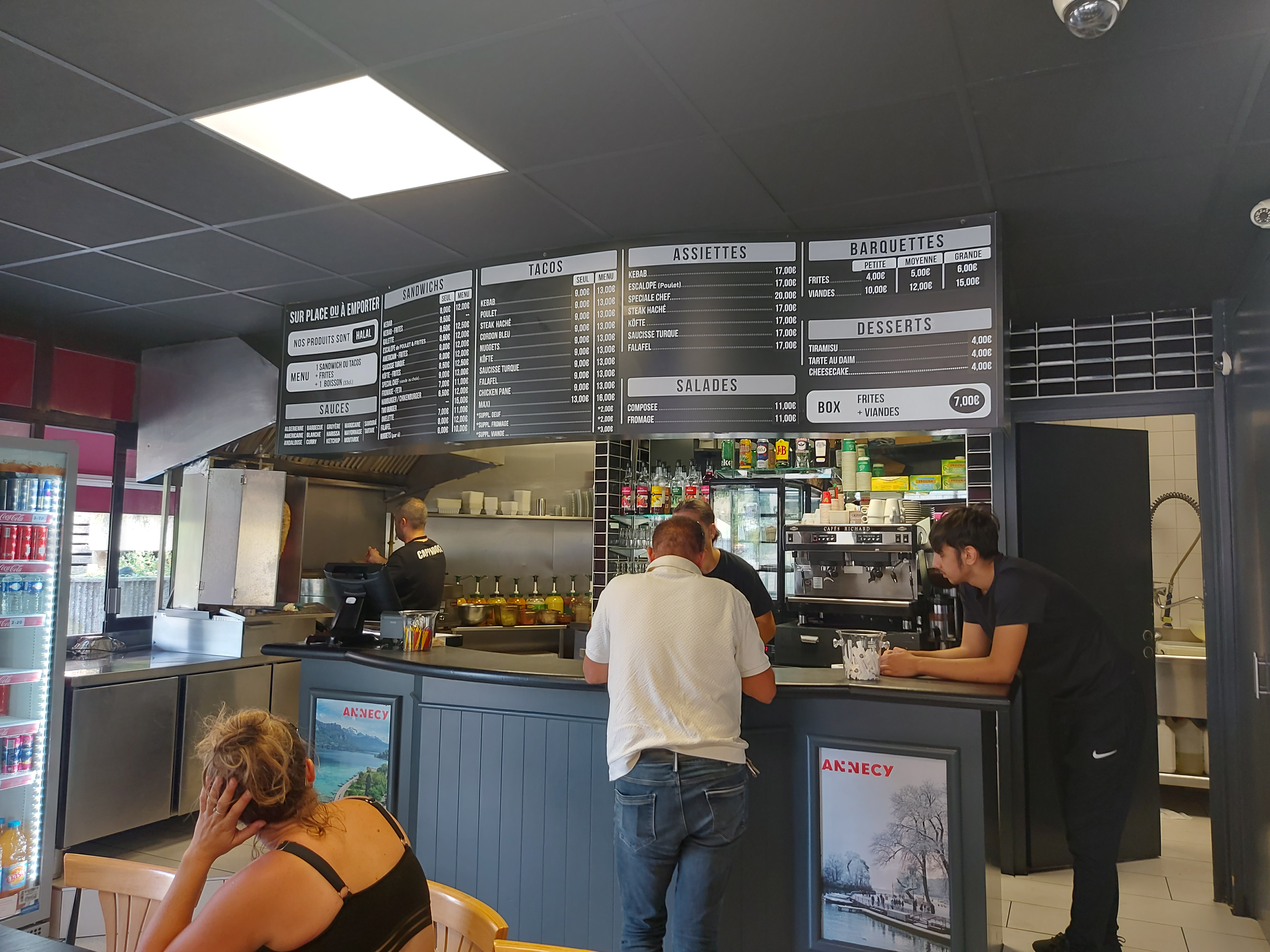 C'est ma première fois à Annecy et franchement pour un repas copieux et rapide c'est l'idéal. J'ai vu les différents commentaires négatifs et je les trouve vraiment injustes. Pour les frites, c'est une petite barquette mais extrêmement suffisante car le sandwich/l'assiette est gigantesque. Les employés sont très sympas et accueillants. Malgré que la brochette ne soit pas faite-maison, elle est très bonne. Niveau prix c'est assez abordable. Je recommande !