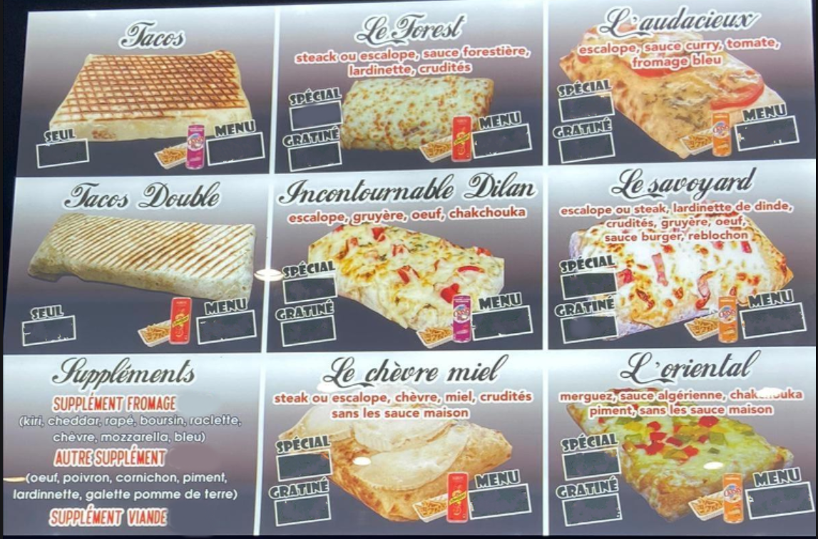 Je ne recommande pas du tout nous arnaque sur les prix a la base c'était 28€ pour 4 tacos et au final il nous demande 35€
