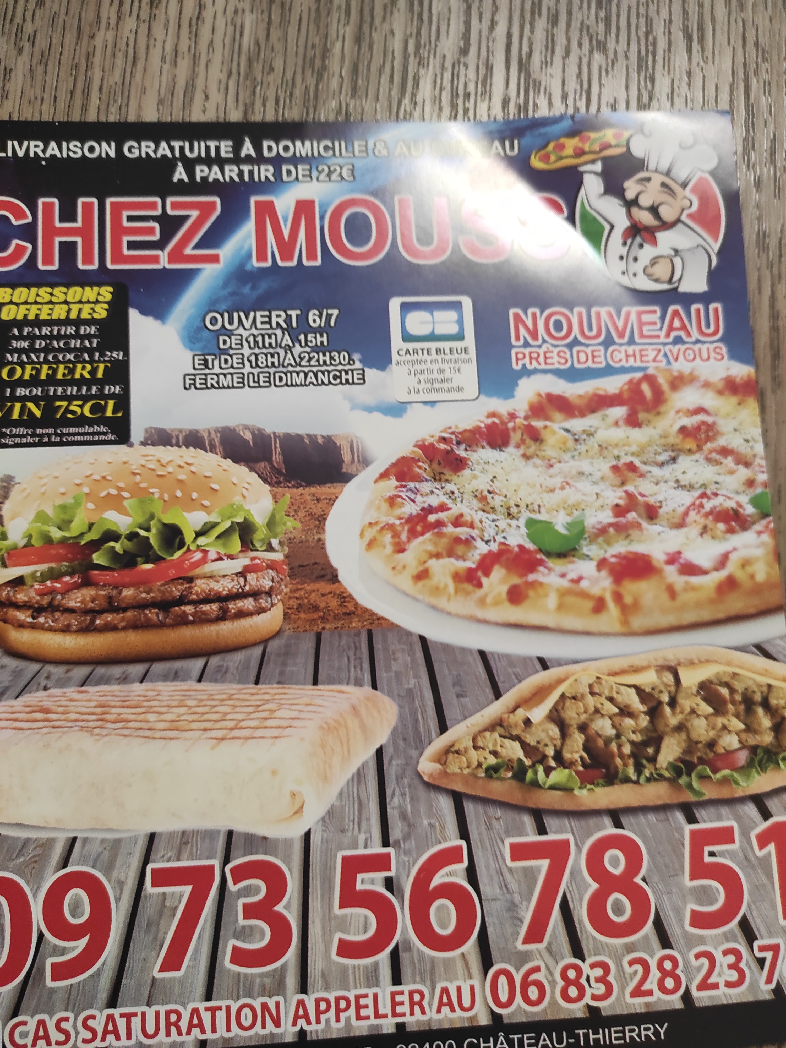 Bonjour nous vous remercions de votre visite et espérons vous revoir prochainement. Cordialement L'equipe Chez Mouss 🌮🍔🥙