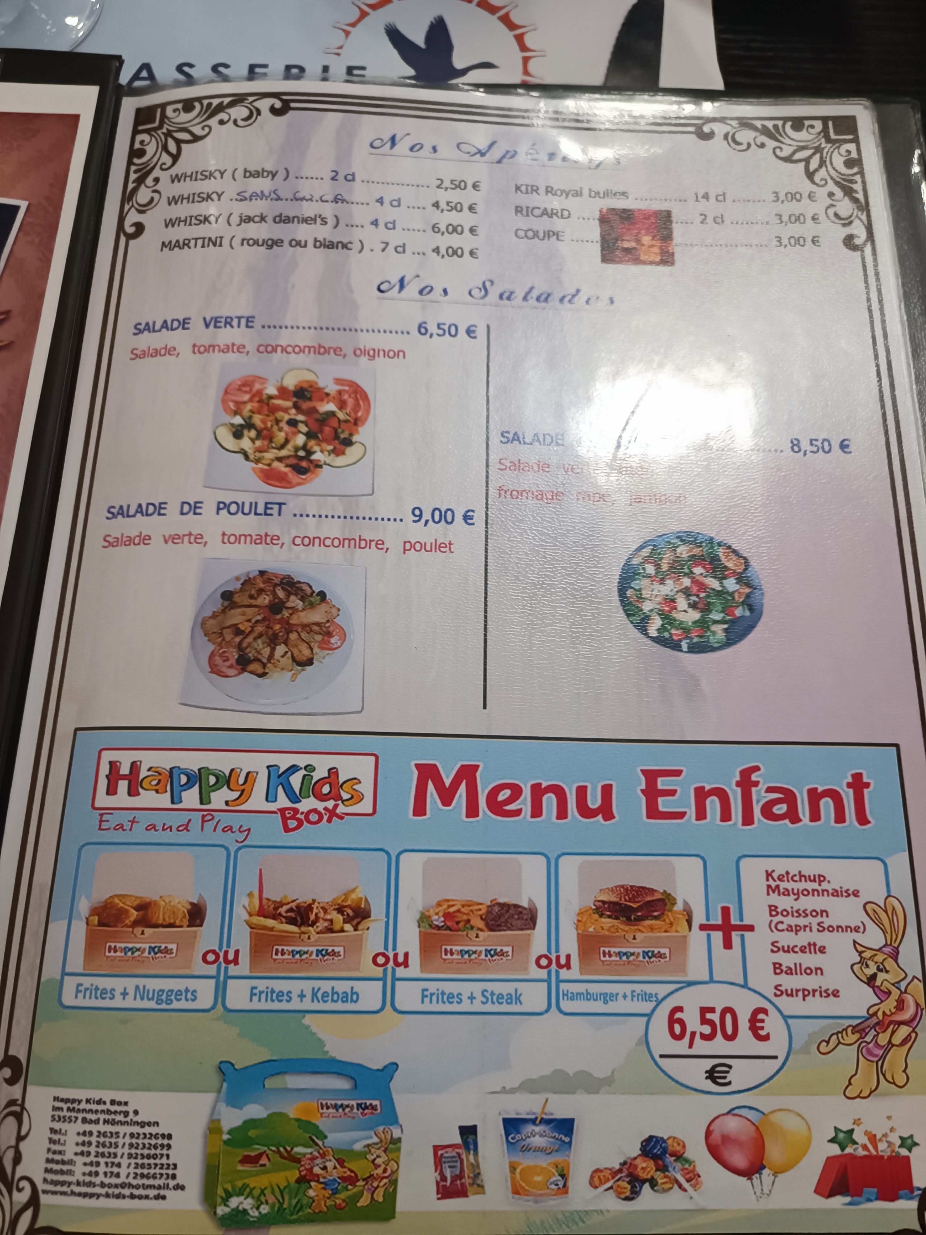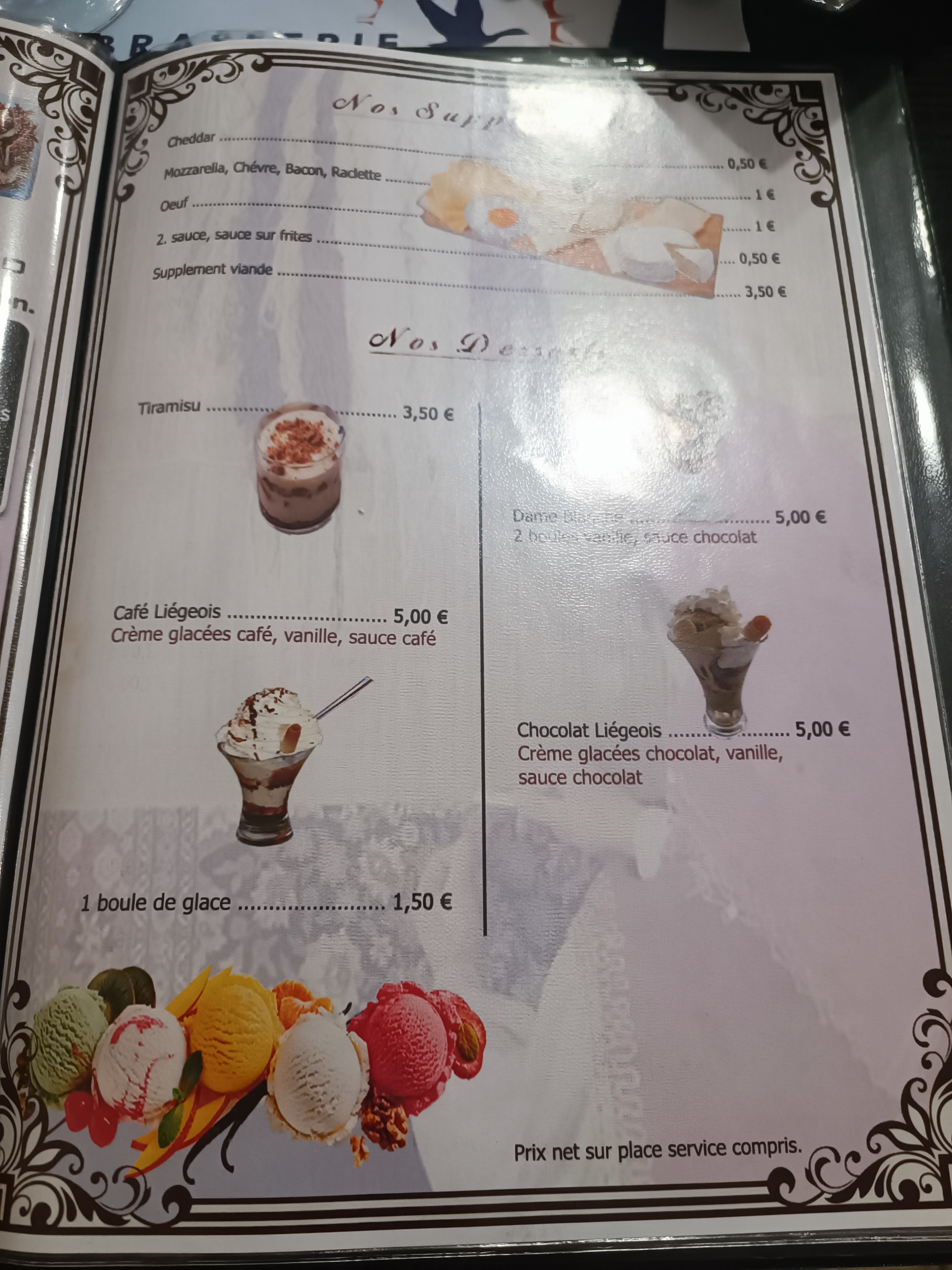 2 menus enfts (sans dessert car pas compris je vois pas l'intérêt du menu ) 1 sandwich burger 1 coca 19€50 . Prix excessif. Je n'y retournerai plus 1ere et dernière fois