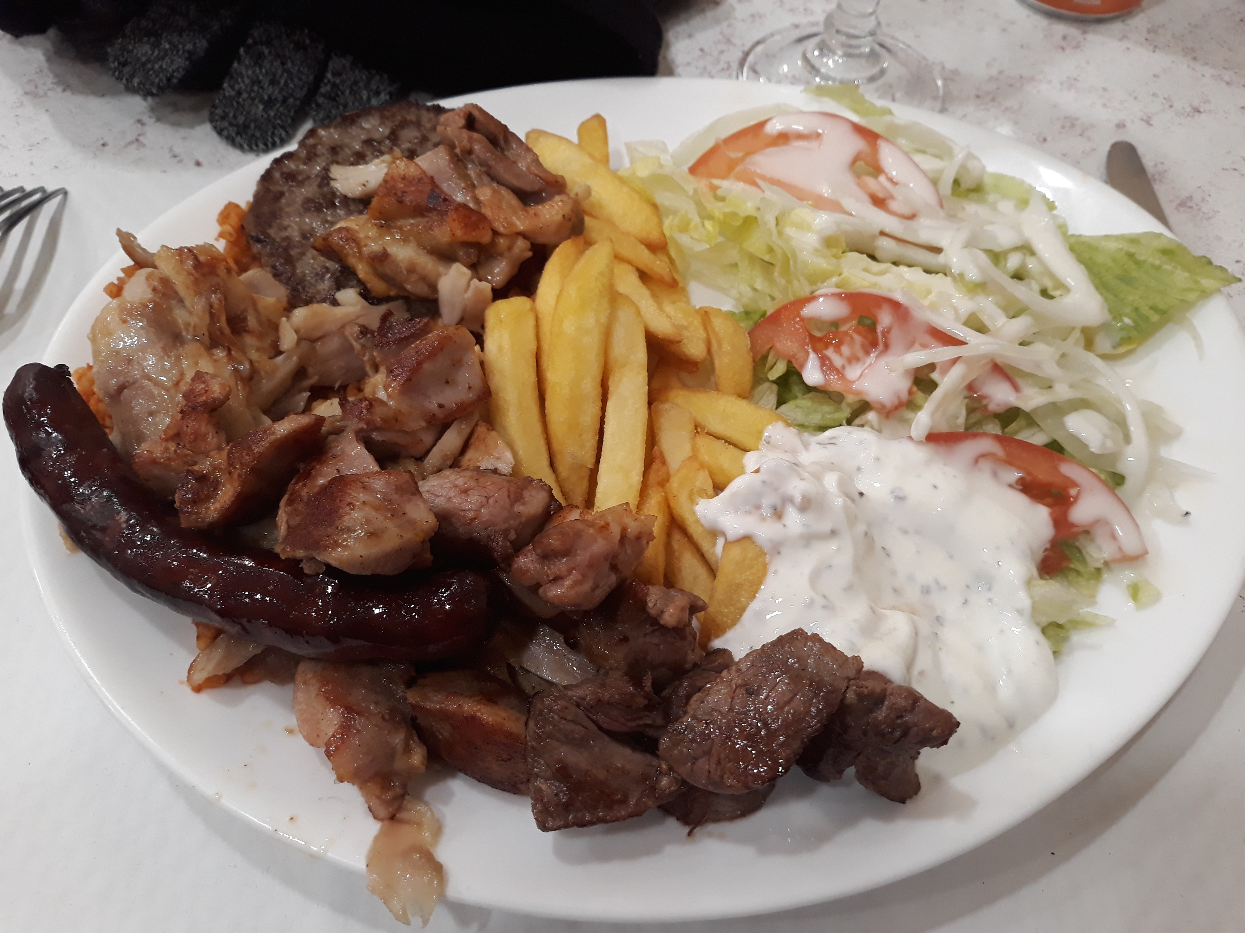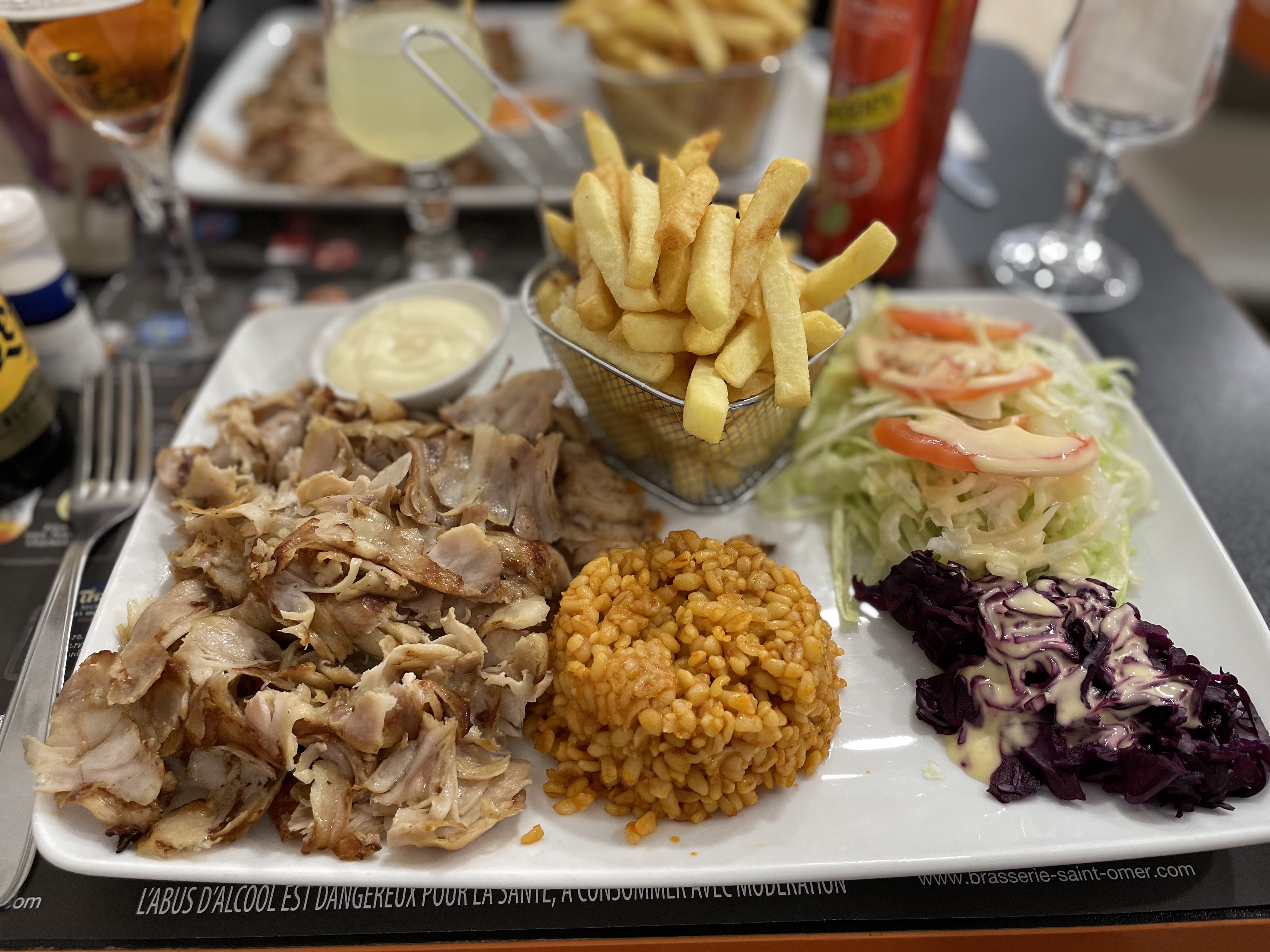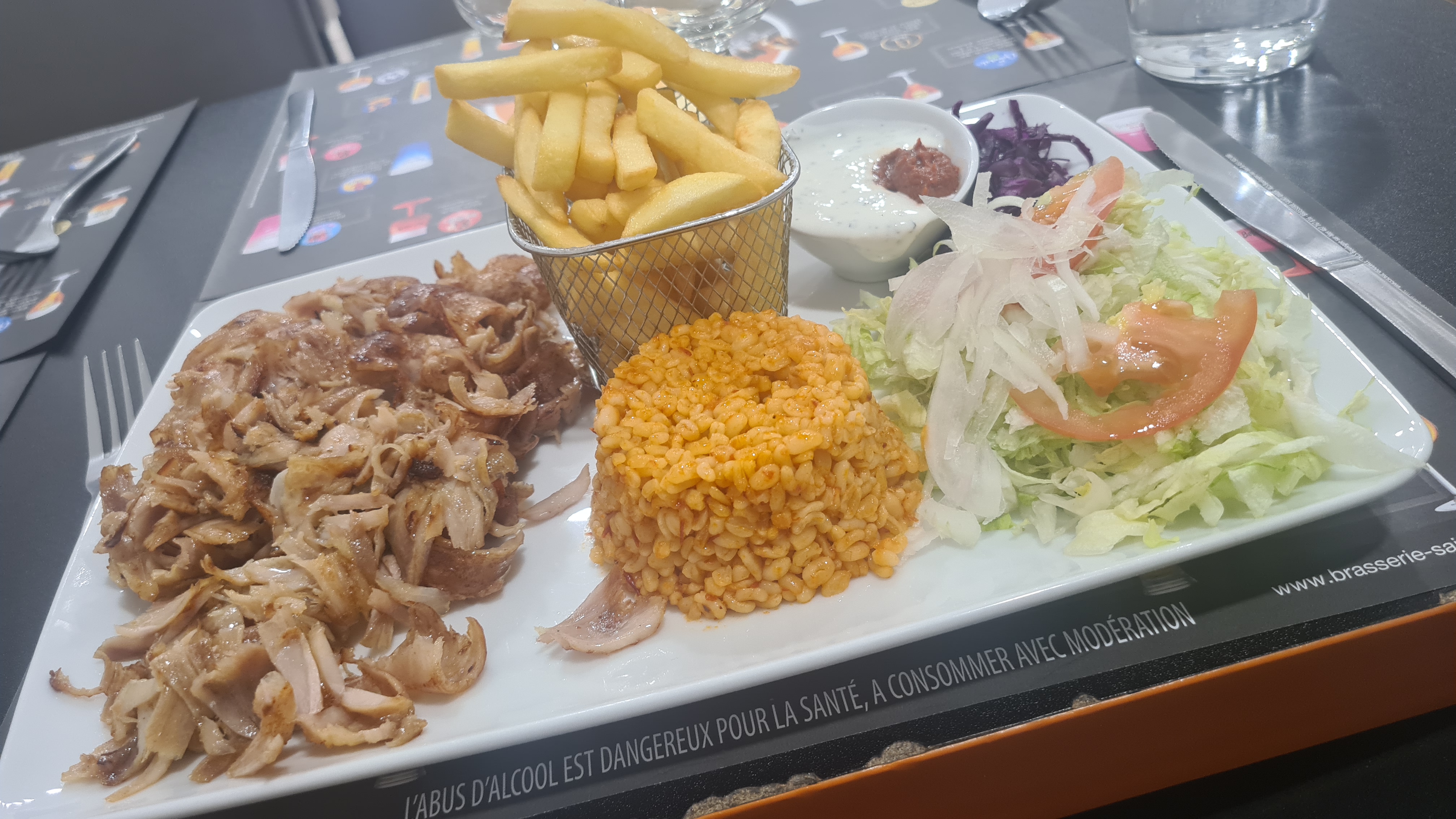 La viande (excepté la merguez cuite ds l'huile donc tres dur..)était bonne mais les frites pas top. Le lieu kebab standard pas grand monde à midi et les patrons ont passé leurs temps à s'engueler en turc..😂😂. 13.90 avec une boisson un peu chère.