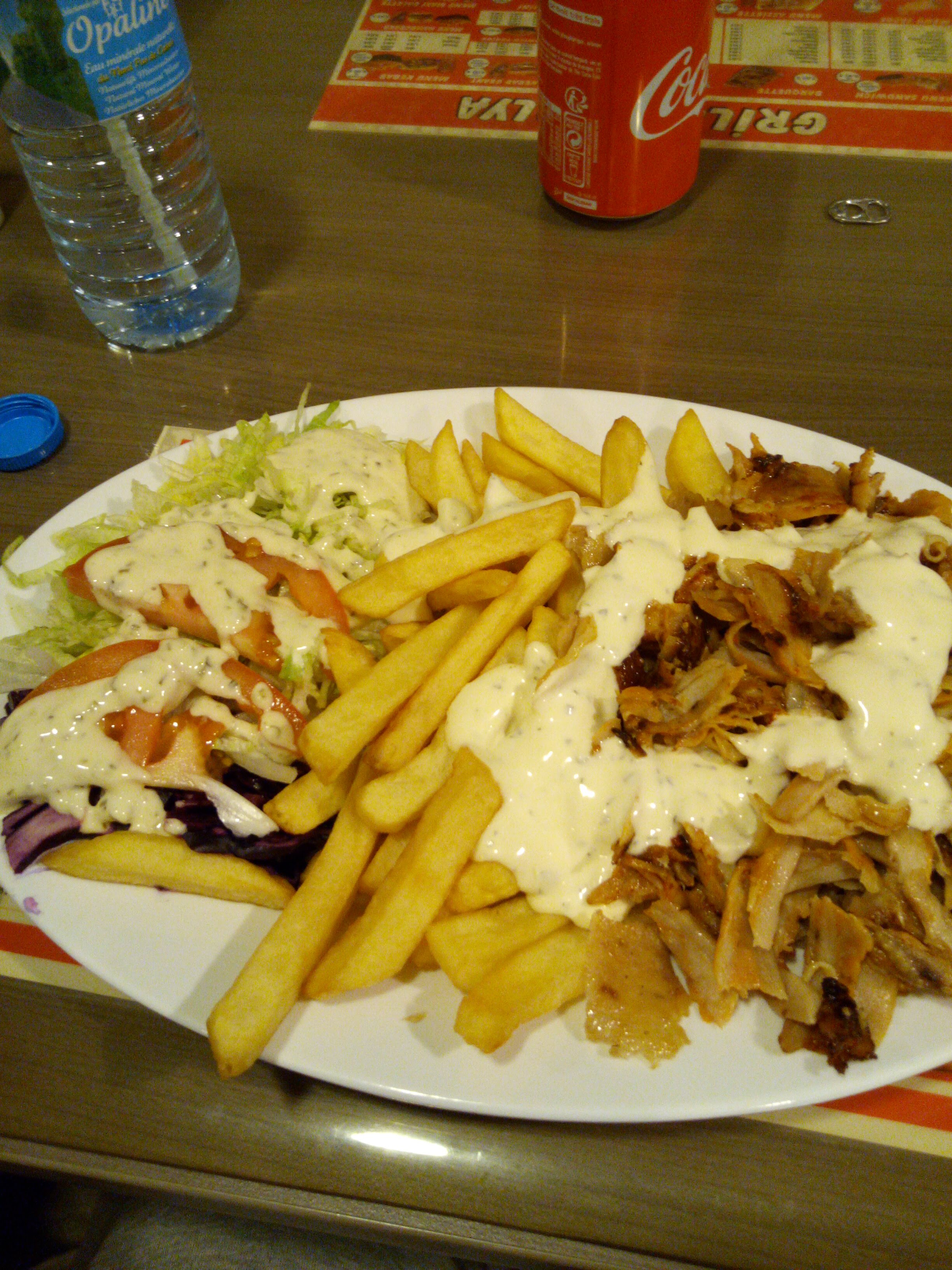 C'est la dernière fois, la qualité de la viande est tellement aléatoire sauf que la j'ai eu de la viande tellement archi-cuite que c etais de la semelles en caoutchouc, la viande est jamais coupée sur broche c'est toujours dans un réchaud du coup elle a du y être pendant des heures.... Le pain lui aussi change, une fois il est rond une fois c'est un espèce de pain hotdog qui se délie comme un pain de la Veille, bref merci pas et au revoir.