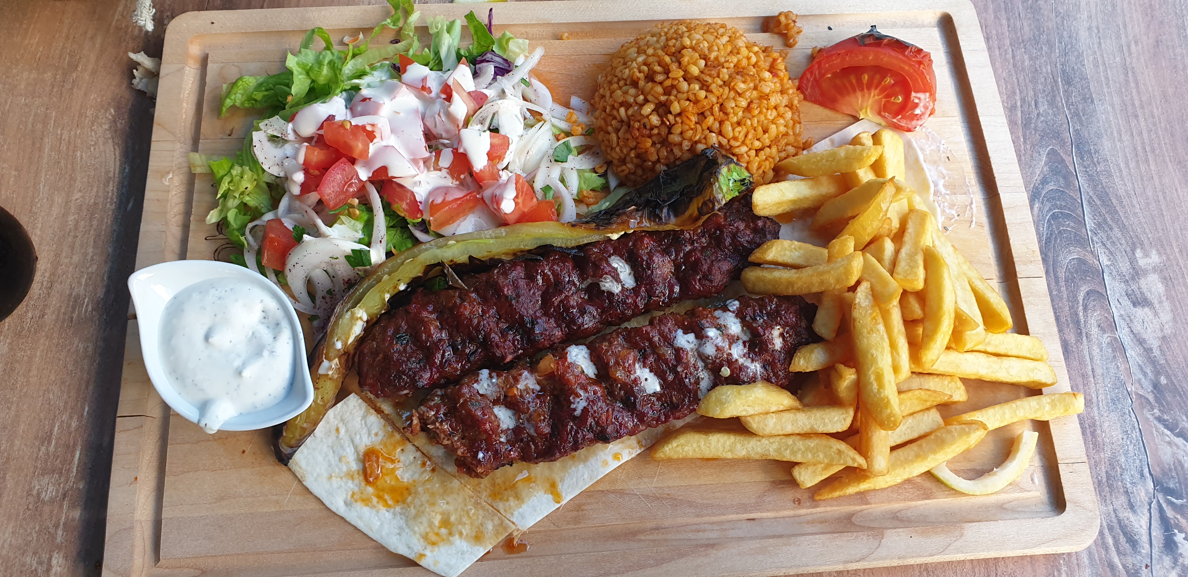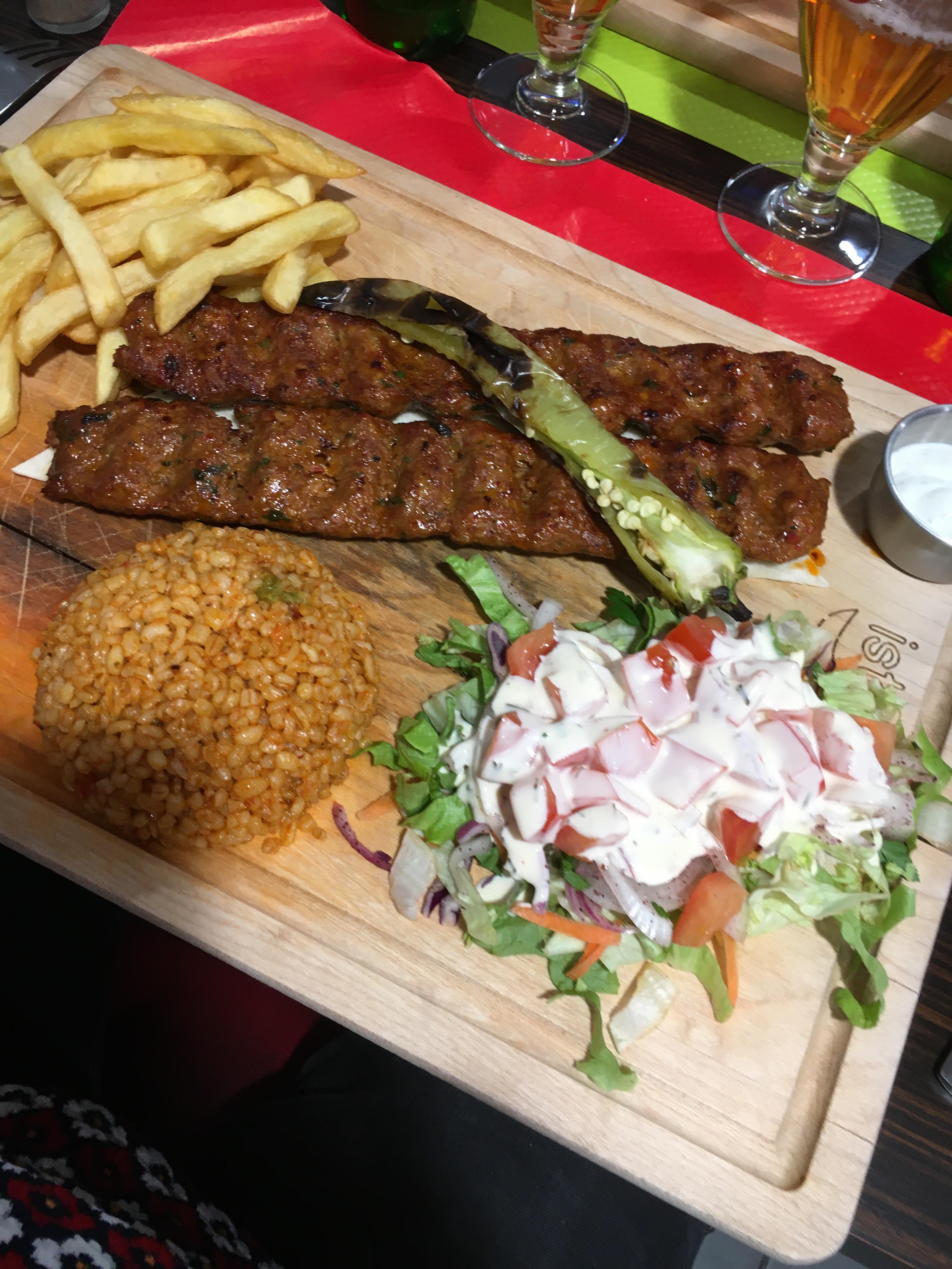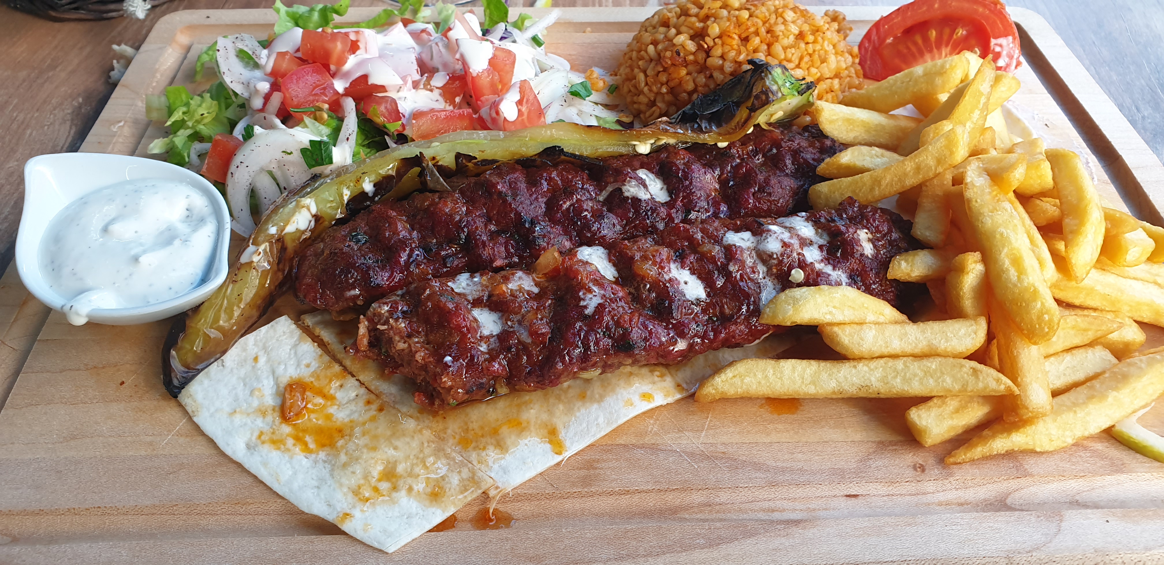 Un très bon apriori car c'est un vrai restaurant avec une cuisson sur des braises des viandes. MAIS des frites à l'odeur et au goût rance et du blé fade peut être tourné. Bref. Déception.