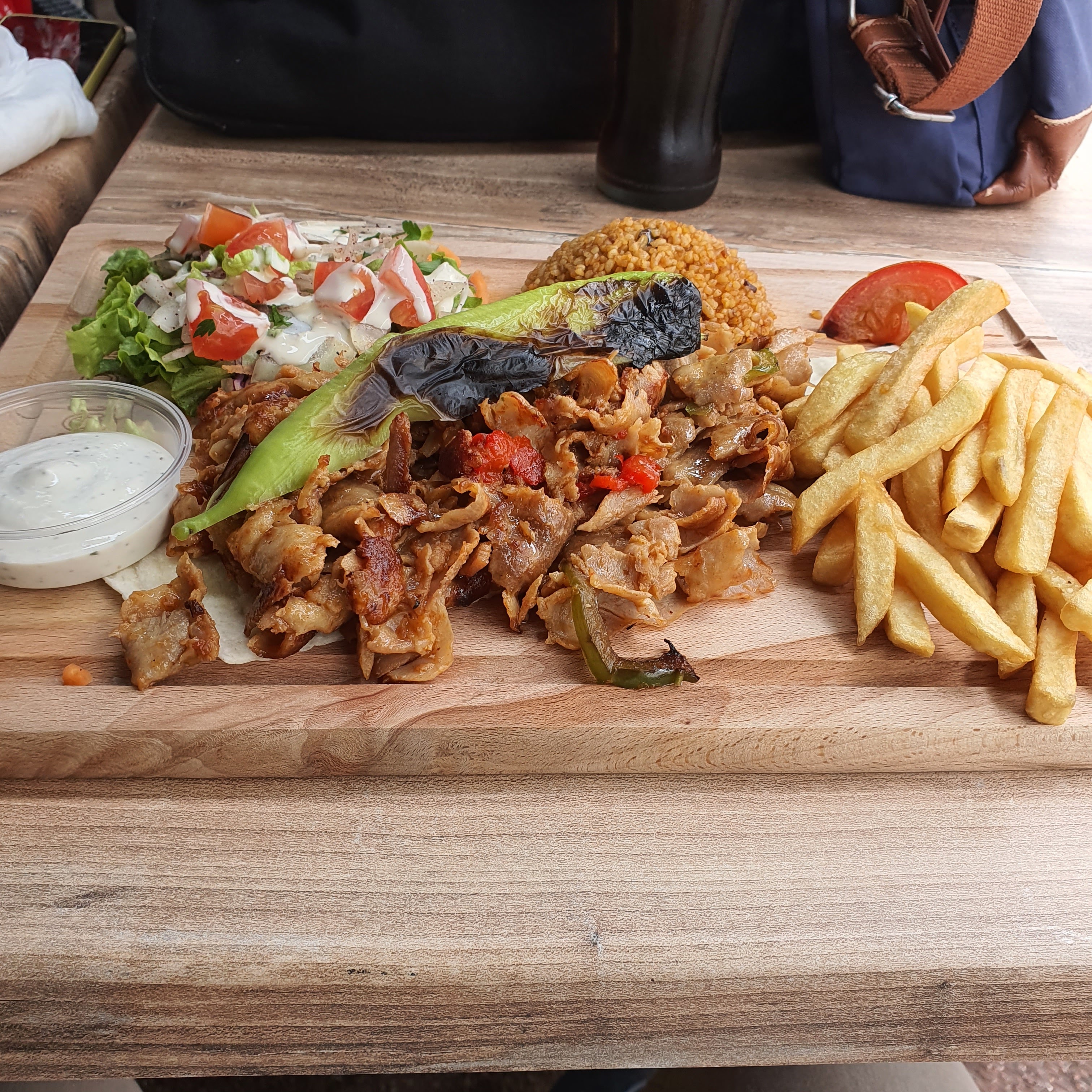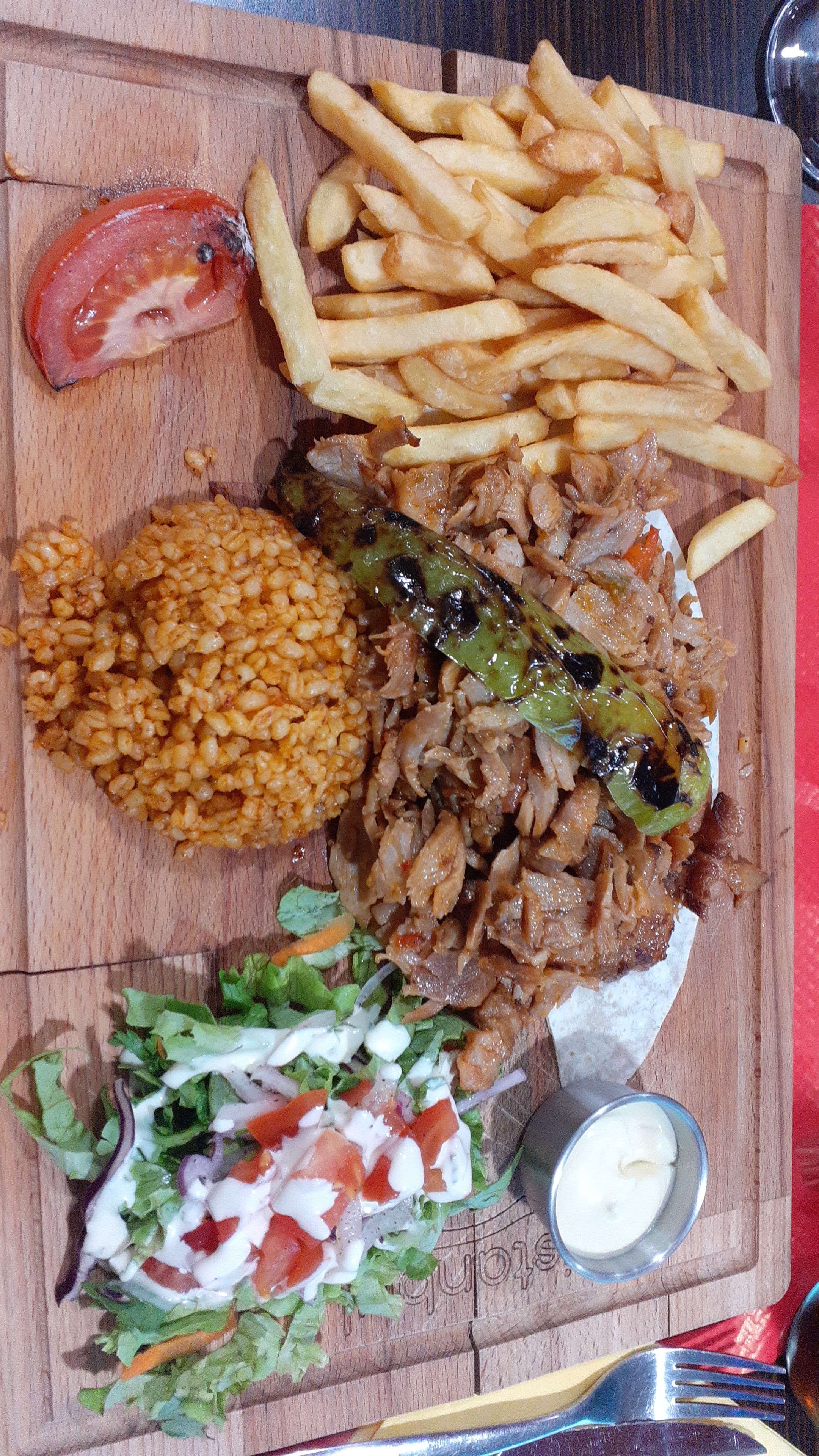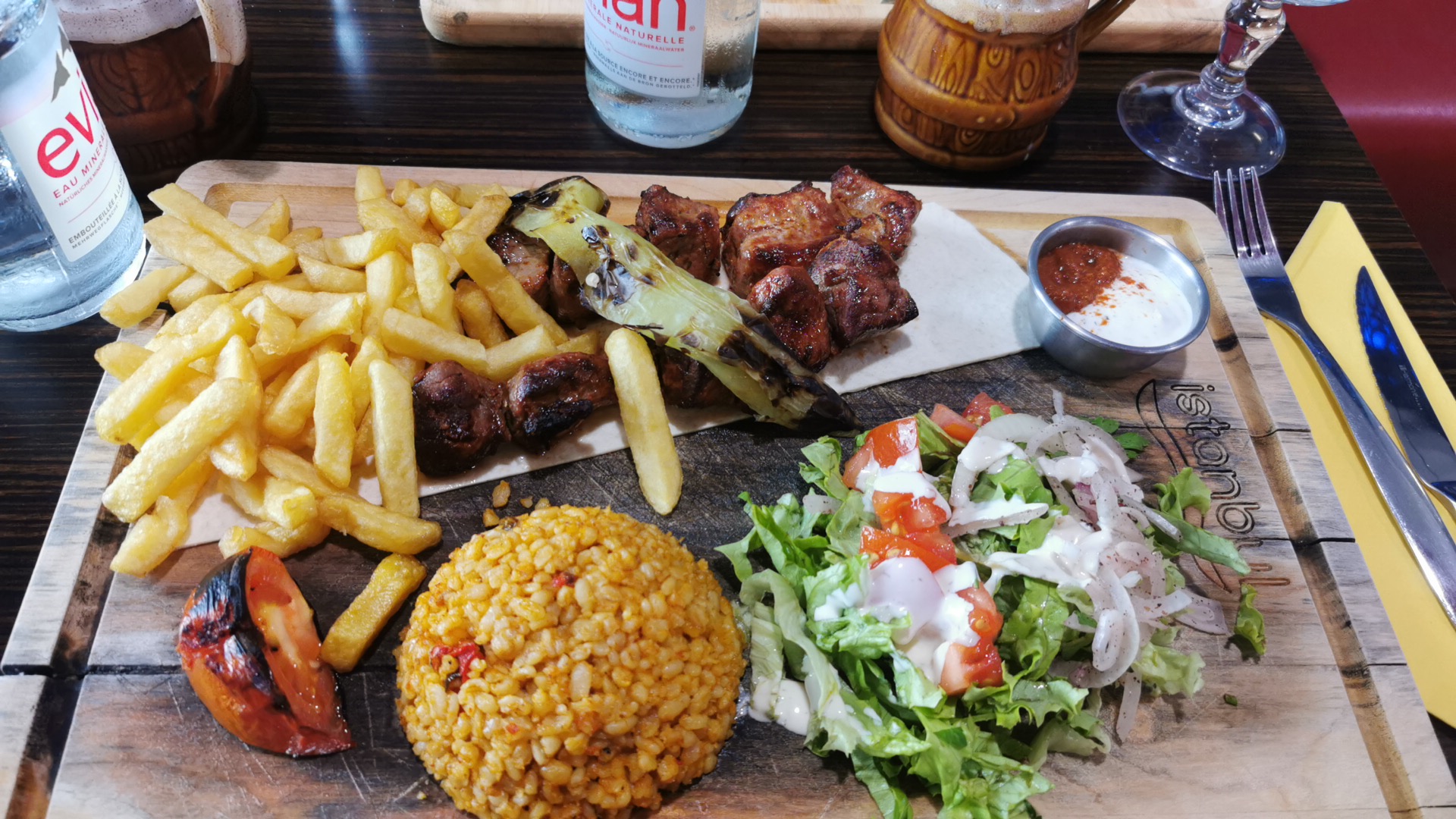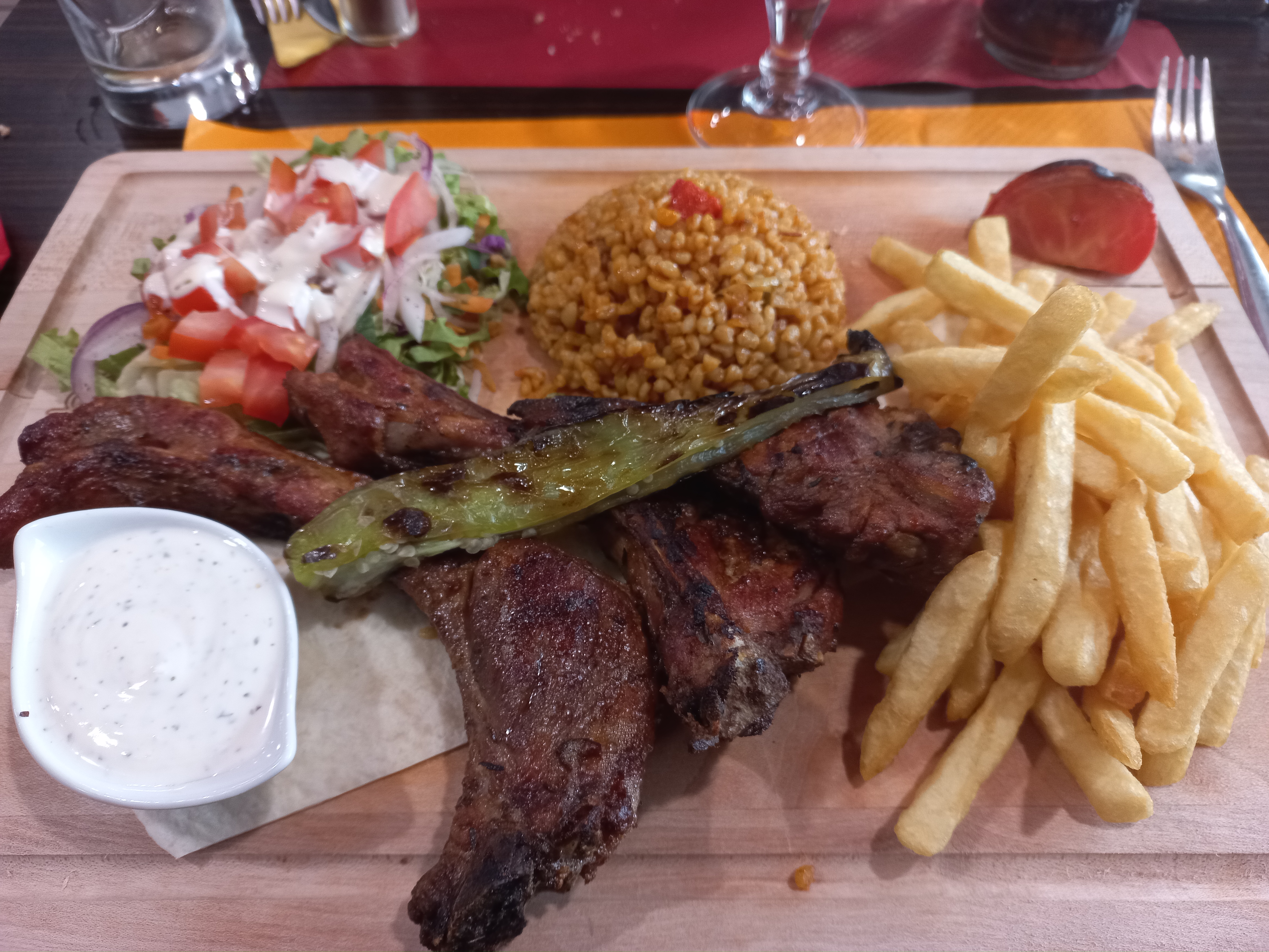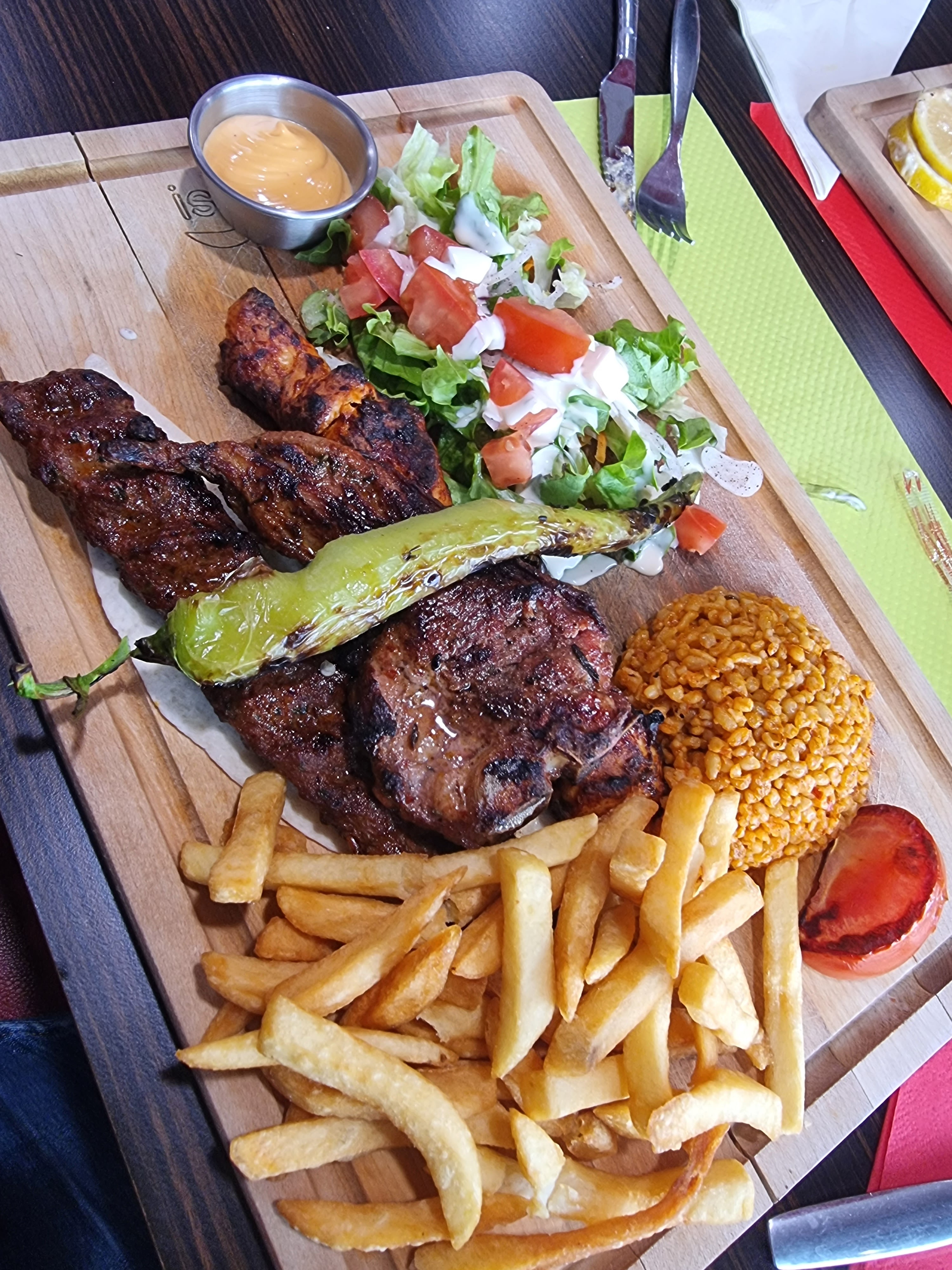 Frite tiède, la viande commandé était de l’agneau, finalement pas beaucoup le goût d’agneau, j’ai même le doute si c’était de l’agneau .. pas beaucoup de frite dans l’assiette, on est sorti de là obligé d’aller dans un fast food pck on avait encore faim. La qualité pas ouf par rapport au prix, 10€ l’assiette tu as même pas de sauce, faut la demander à côté ..