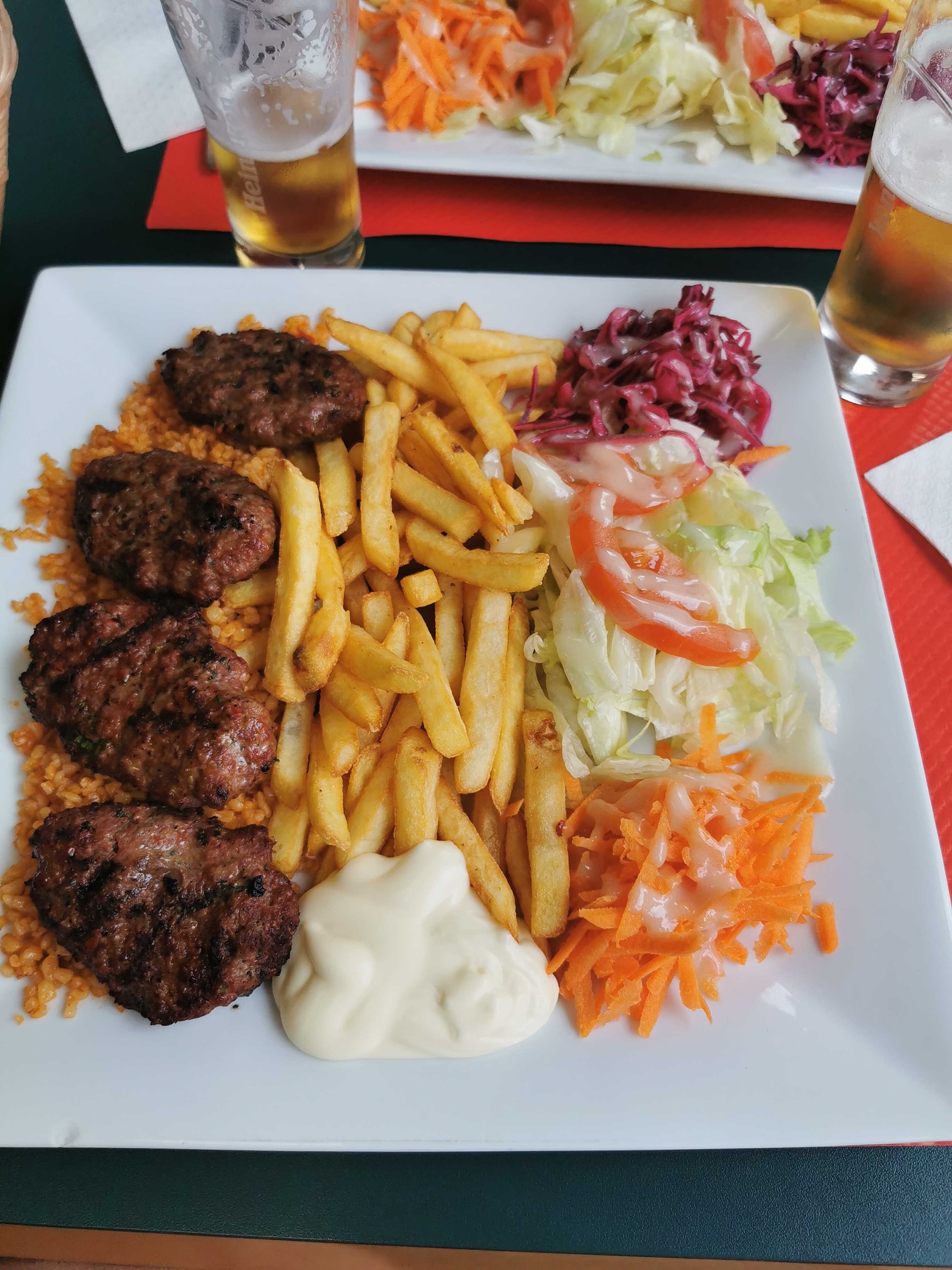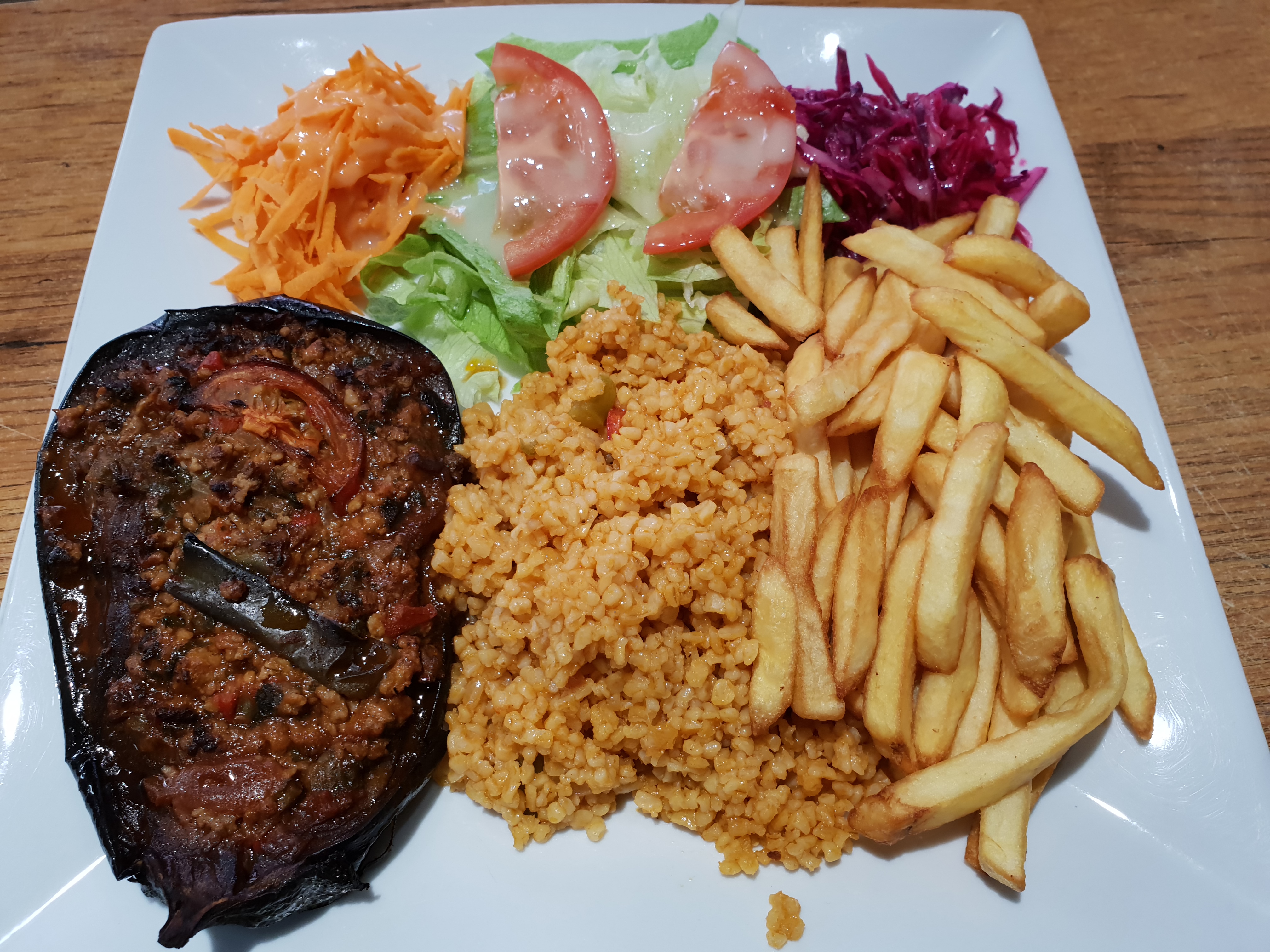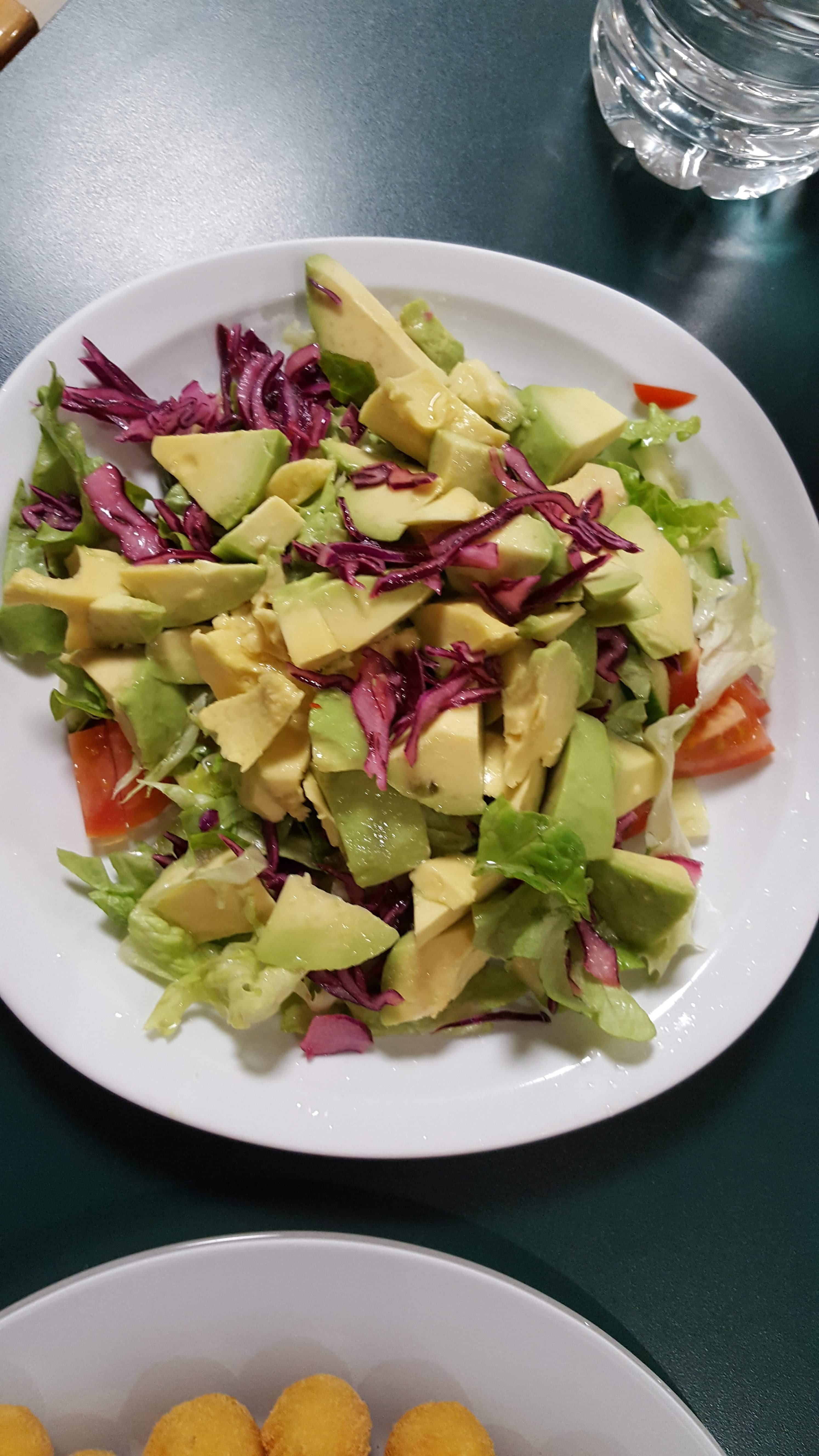 Nous avons tous mangé des entrées végétariennes. Ouf... Le tzatziki n'était pas frais et il était étiré, le houmous n'avait pas le goût de pois chiches, de petits pains gras, d'aubergines cuites très grasses... le meilleur était la simple salade. Tout est bien trop cher pour ça !