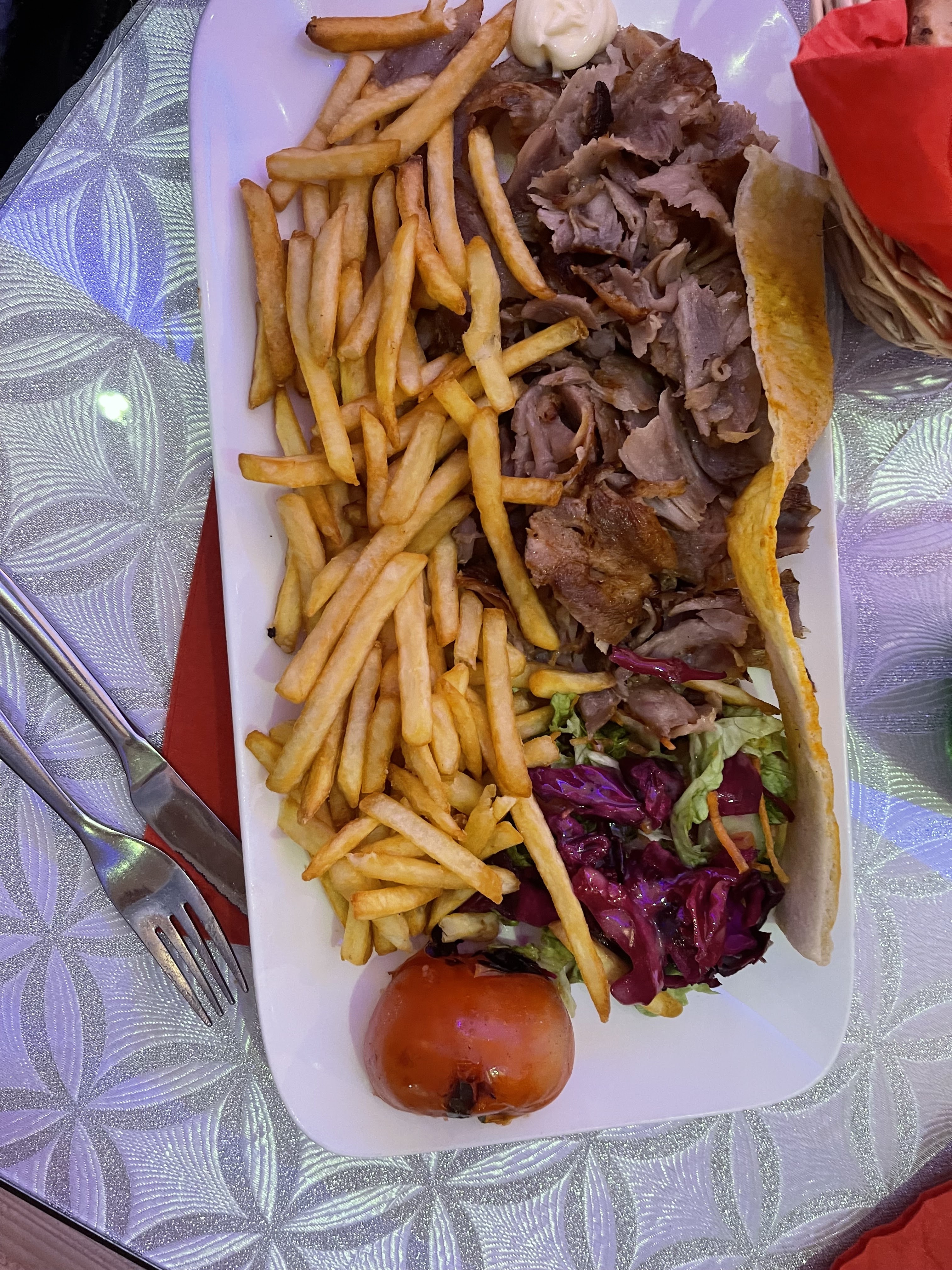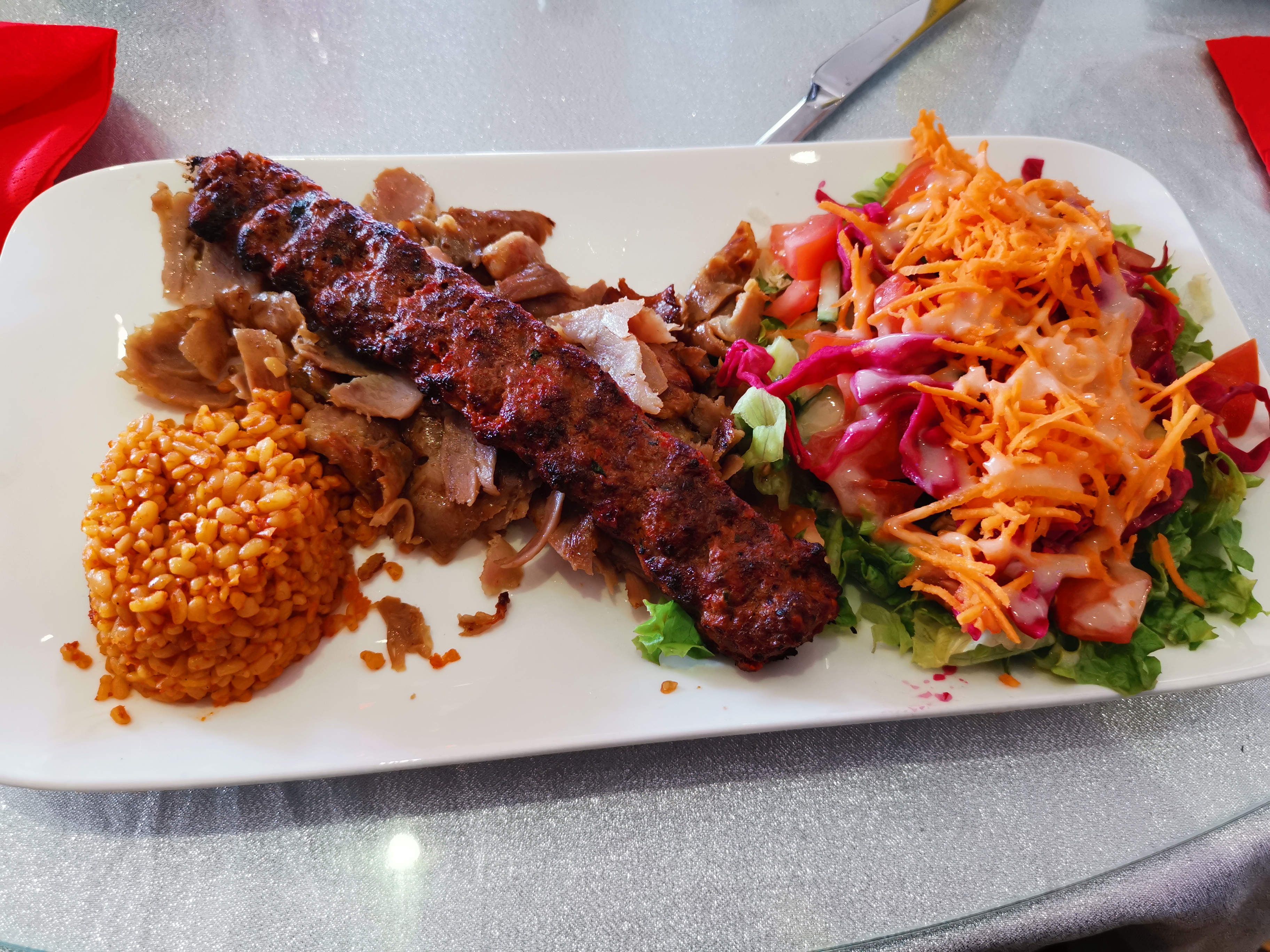 C’est la deuxième fois que je viens ici donc testée 2 fois avant de donner mon avis. - La viande de kebab était mal cuite (cramé pour certains et d’autre crue), - Lors du service je demande si je pouvais avoir un durum (fait par eux) et non du pain de pide, je reçois 1 wrap de chez action mdr - La salle est coupée en deux en fonction de se que tu mangera (assiette ou sandwich). La décoration c’est dommage y’a des choses pas mal mais côté assiette tout est à revoir, - Qualité et prix des plats à revoir, - Les serveurs devraient être plus avenants et souriants c'est dommage. Point positif: rapide et assiette bien garnis.