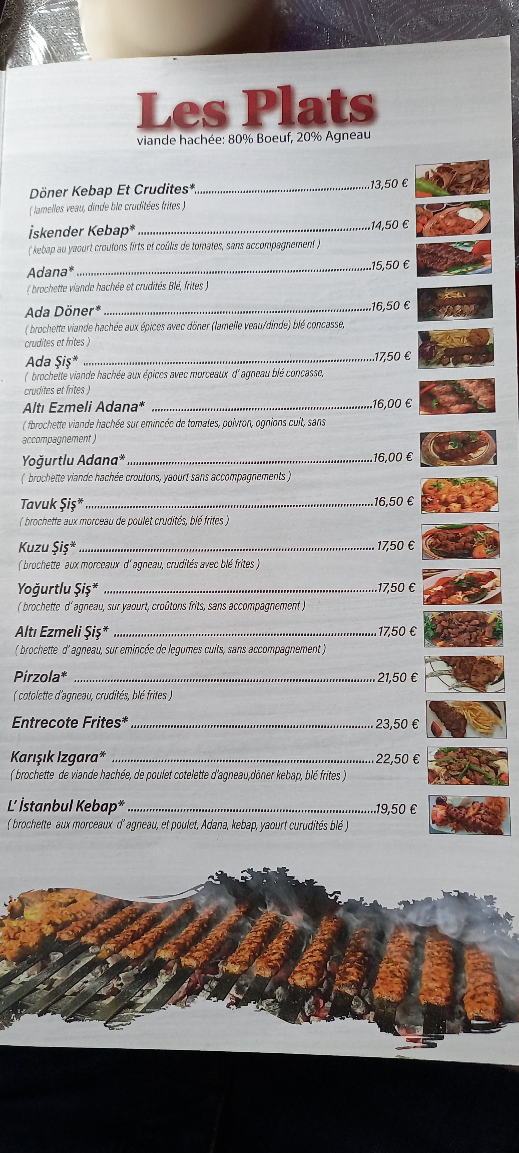 Déçu par la prestation présentée. Ma déception est dû à l'accueil, à la cuisson et à la qualité du Kebab ( surgelée). J'ai assisté avec ma famille environ 15 personnes. On a du manger une viande carbonisé pour la brochette d'agneau et cru pour celle de la viande kebab. Je penses que les prix sont excessif, niveau rapport qualité prix on est pas du tout dans le rythme. Le seul point positif c'est le Adana. Avant de lâcher mon commentaire, j'ai déjà été deux fois je ne fais pas un avis sur qu'une seule visite.