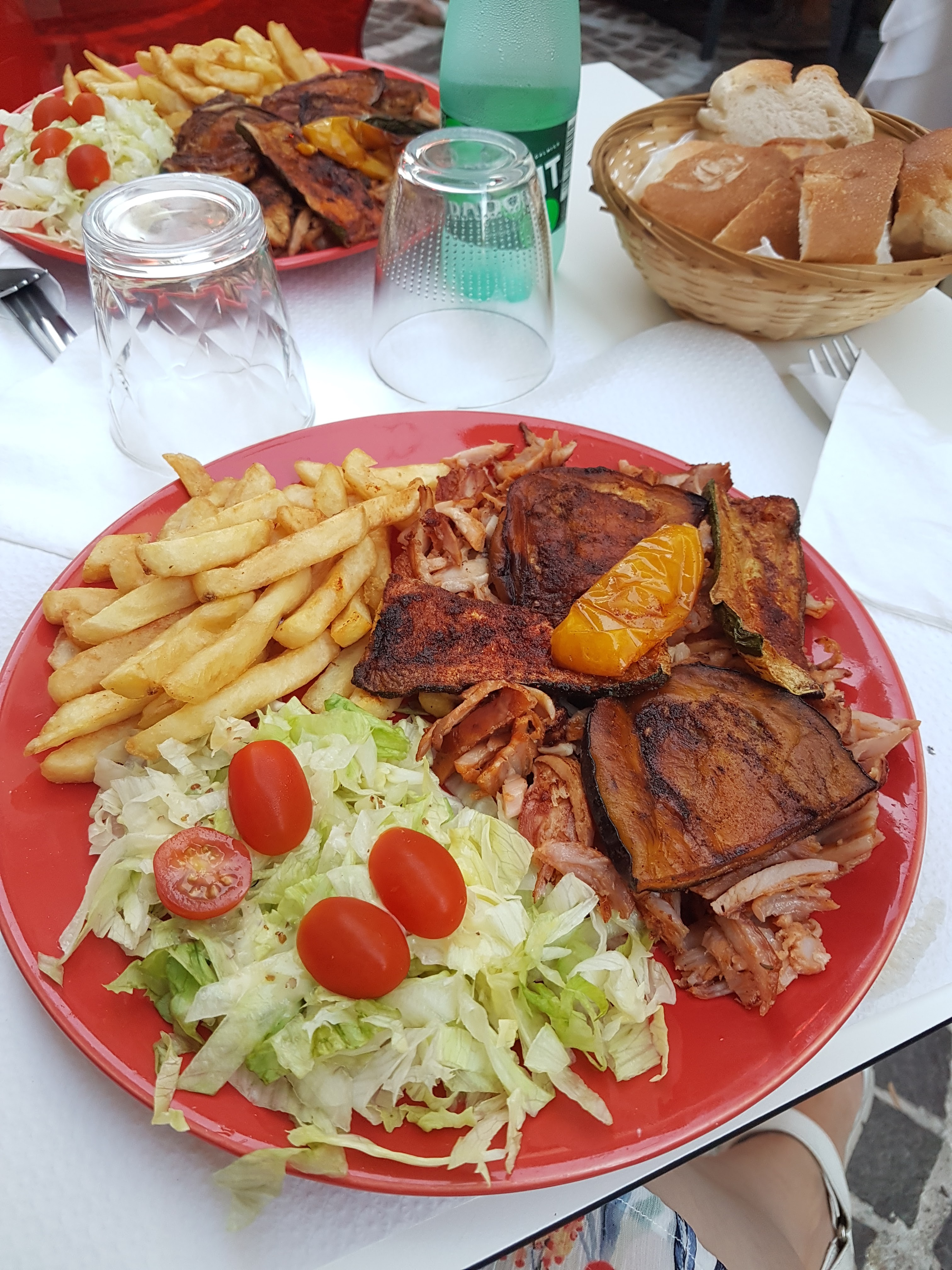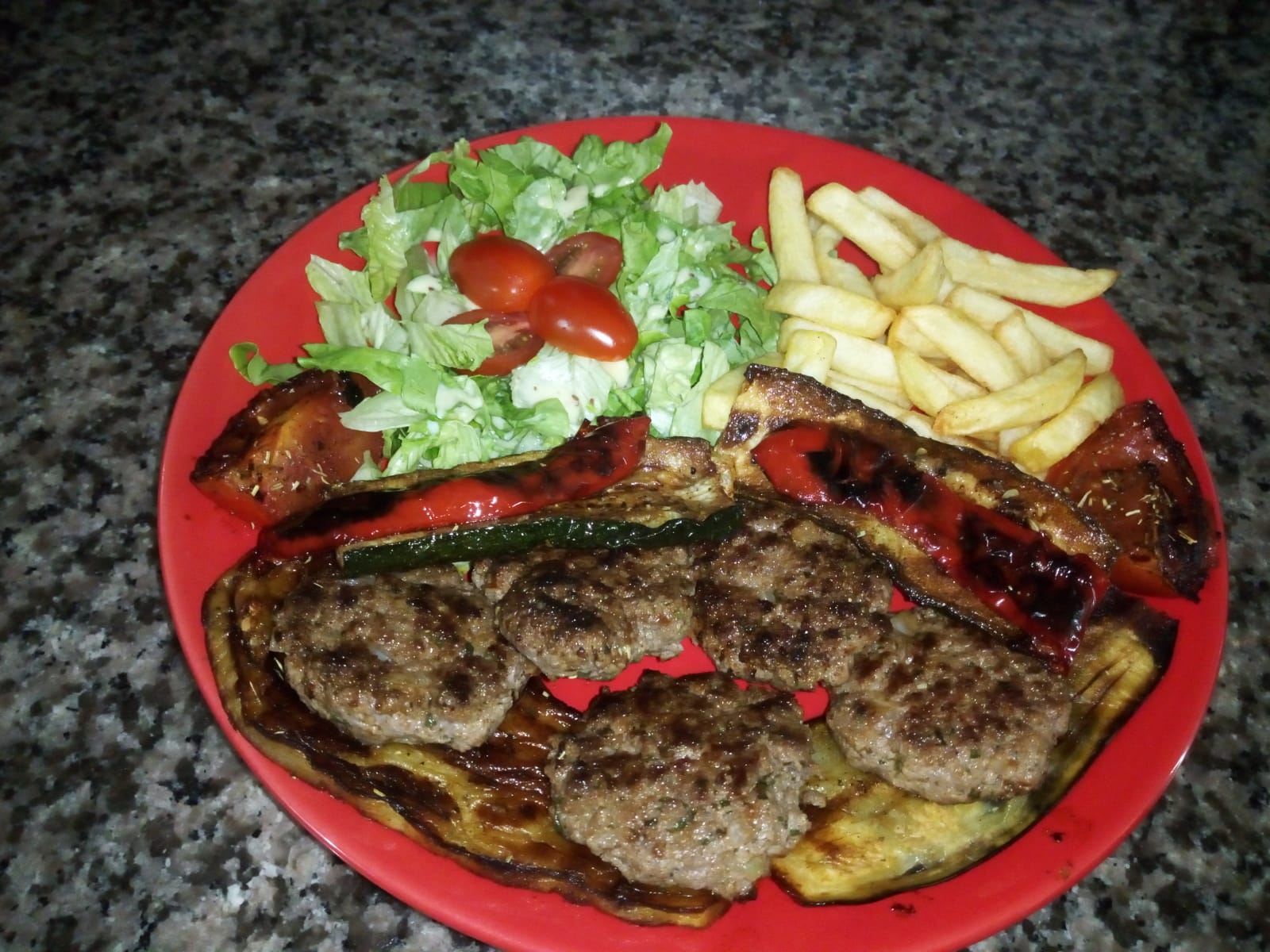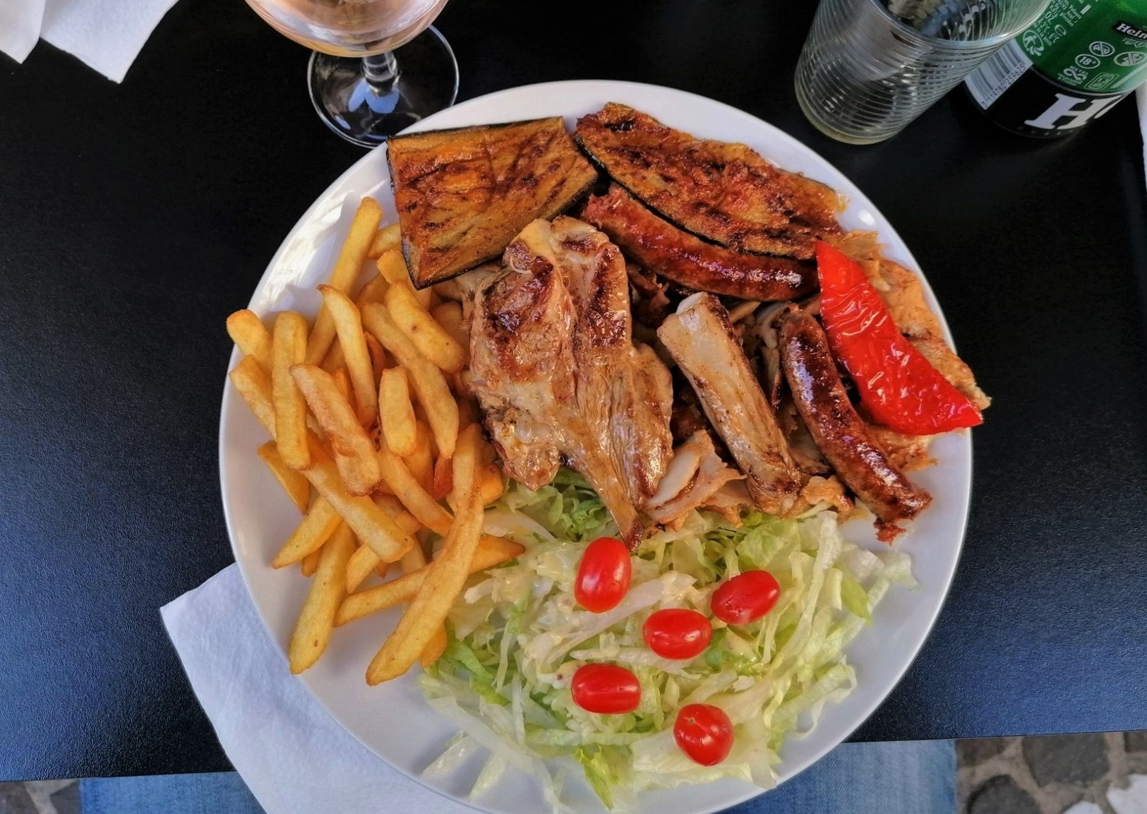 Assiette kebab très copieuse avec frites et salade. Les aliments sont frais et servis avec des courgettes et aubergines grillées un délice.... Restaurant tenu par un couple charmant et attentionné dans une petite rue pittoresque du vieil antibes A ne pas manquer si vous êtes sur Antibes un régal garanti