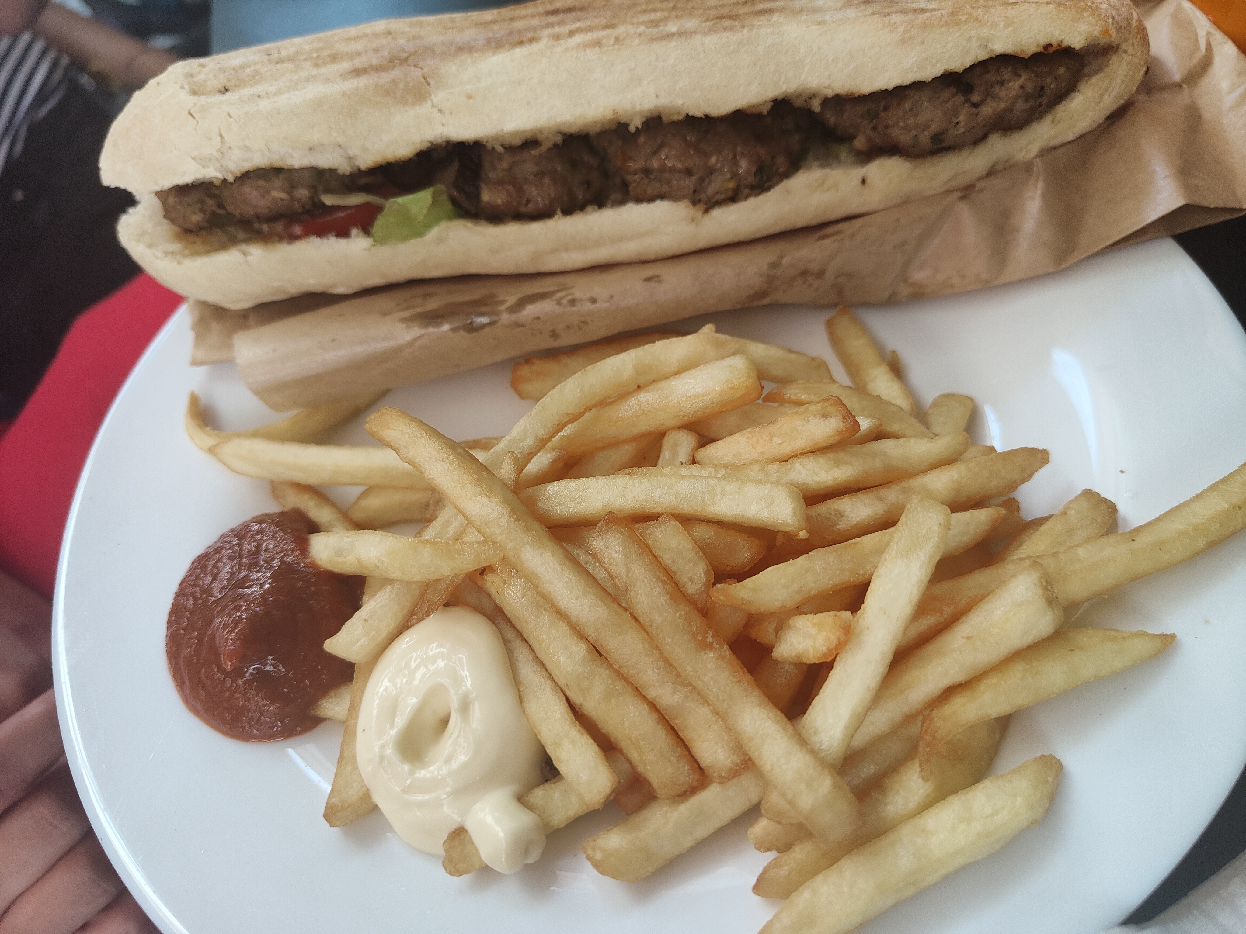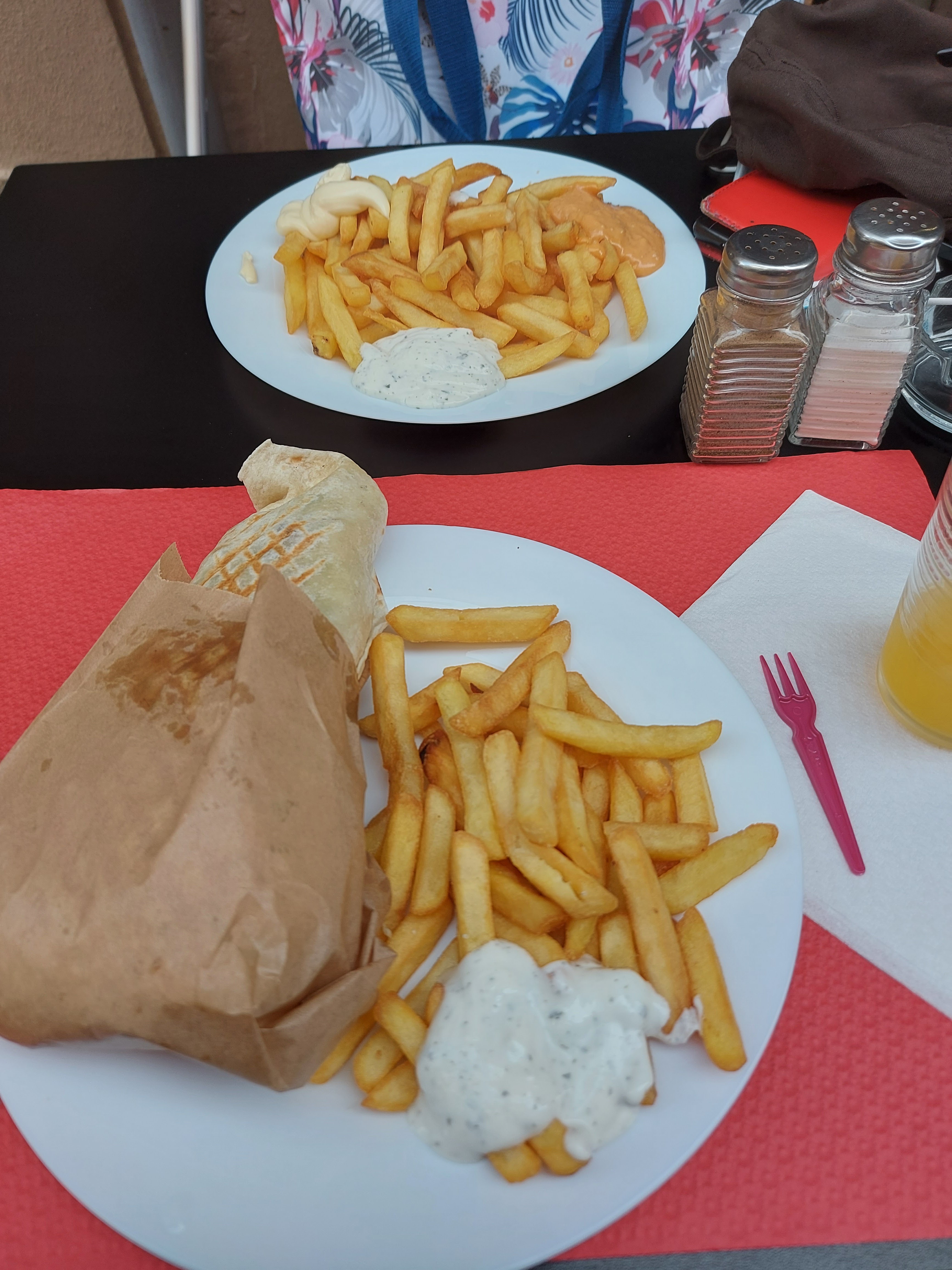 Malheureusement pour nous ce ne fus pas une bonne expérience dans tous les sens du terme.. Nous avons commander 2 menus simple (boisson-frite-kebab) vers 18h25. Lors de la commande, lorsque l’ont demande des informations sur les produits la réponse est « bah regardez la carte » bon.. Ensuite une fois installé nous attendons 15min, 20min, 25min, 30min… toujours aucune commande de prête. 15min après s’être installé un groupe de 6personnes se sont installés derrière nous, le serveur leur a donner directement verre, serviette etc.. nous 15min après nous n’avons rien sur notre table… Qui d’ailleurs leur a apporté leurs commandes (de 6 personnes) avant nous alors qu’ont attendait depuis 30min et que nous avions commandé 15min avant eux.. Pendant cette attente pour notre commande Il a commencé a pleuvoir donc nous avons demander d’ouvrir le parasol, le serveur est venu et a ouvert le parasol de la table a côté mais nous a laisser sous la pluie nous avons du redemander une 2eme fois 5min plus tard… Nous avons finalement décider de payer les boissons et partir 40min plus tard… Le Patron à eu le culot de nous sortir « oui mais c’est prêt maintenant » Nous n’avons finalement pas manger ici, et très déçu du comportement qu’ils ont eut…