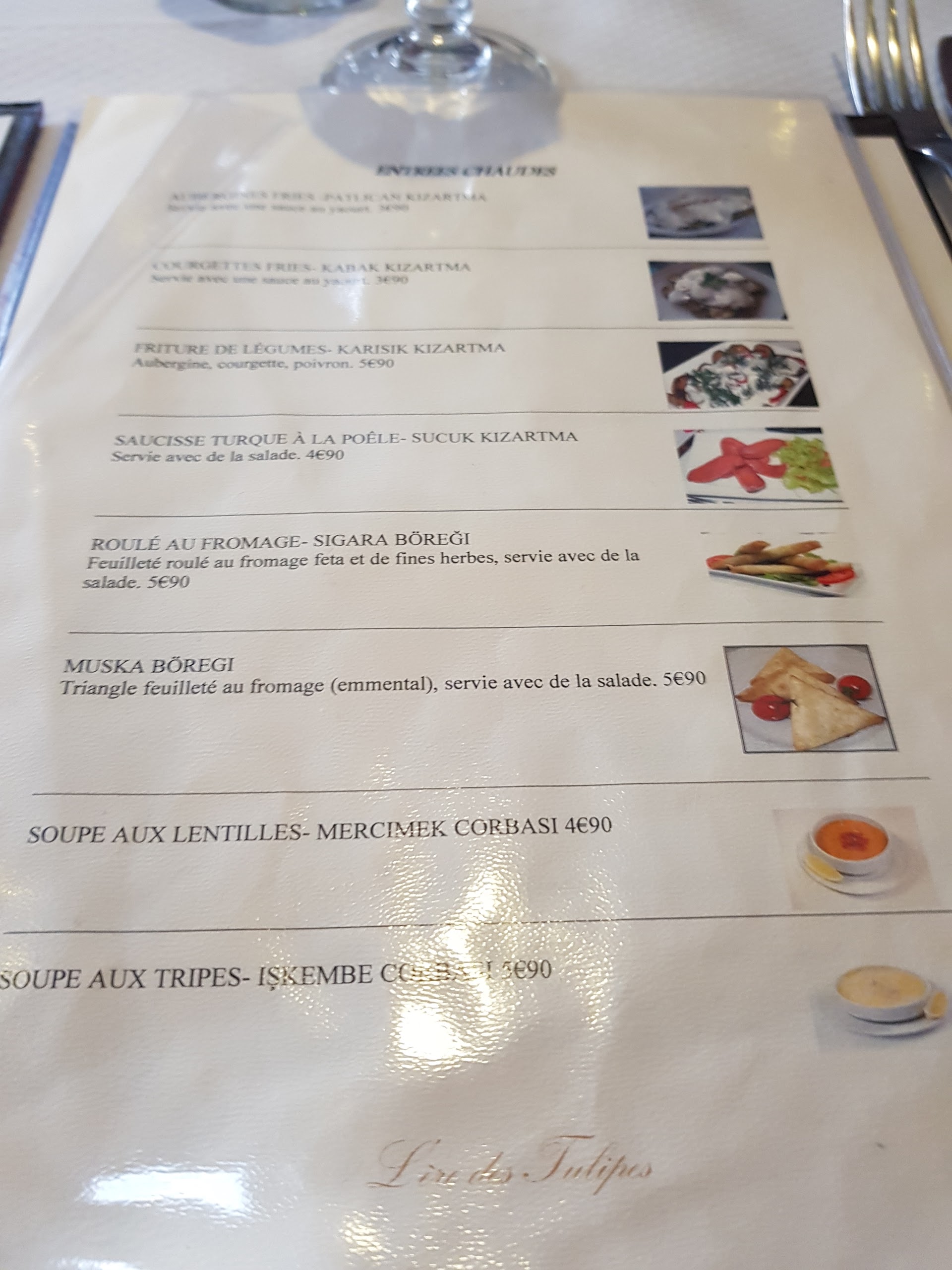 Jai été afin de faire découvrir la cuisine turc à une amie quel regret je passe le service,le prix etc le pire c'était une entrée de mezze à 11euros dont 2 produits périmés vraiment périmés ça ma piqué je demande à la gérante de goute elle me dit à oui ces possible et bien pas culotté et s'en gêne il nous l'ont fait payer jai eu honte pour eux auprès de mon amie et mon envie de faire découvrir la cuisine turc merci l'ère des tulipes