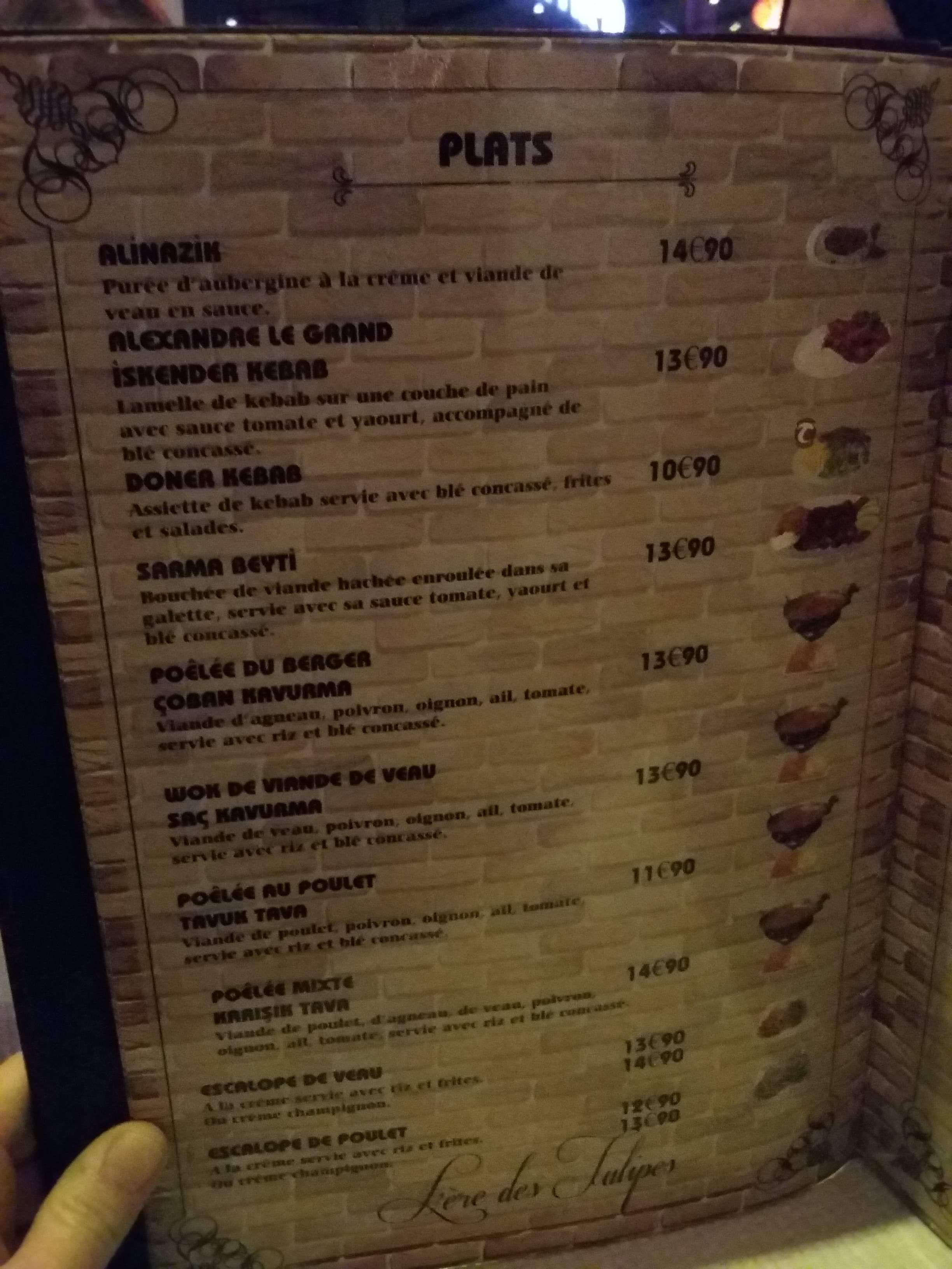 Le pire iskender que j’ai jamais manger la viandre etait tres sec et dure le yaourt etait verser sur la viande alors que dans un iskender la viande est a cote la viande doit etre coupe finement et la seule chose que l’on peut verser ou mettre sur la viande c’est lhuile ou des tomates cuits. Le kunefe etait encore plus petit que mon avenir. En bref c’est tout a par un restaurant turque. Un snack fait mieux. Pour au final payer 60€. Il est ecrit sur leur site que l’on peut dejeuner mais il s’avère qu’il ne le font plus. Décevant