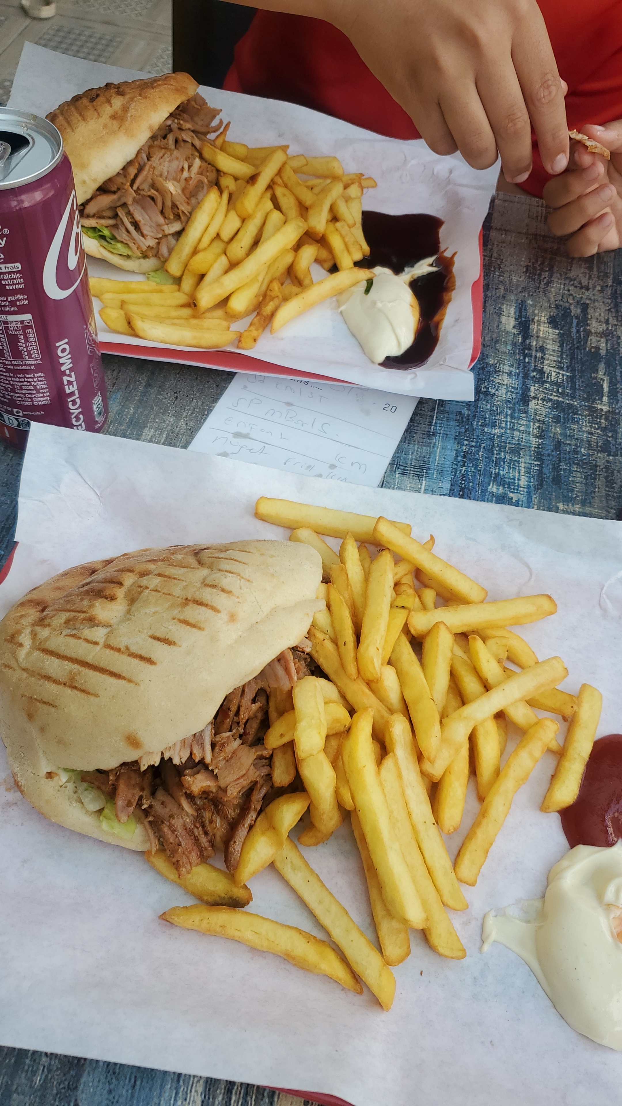 Du monde pour déjeuner le midi, nous avons attendu 15 min avant de pouvoir commander. Kebab 🥙 pomme vraiment très bon. Les frites sont classiques 🍟.