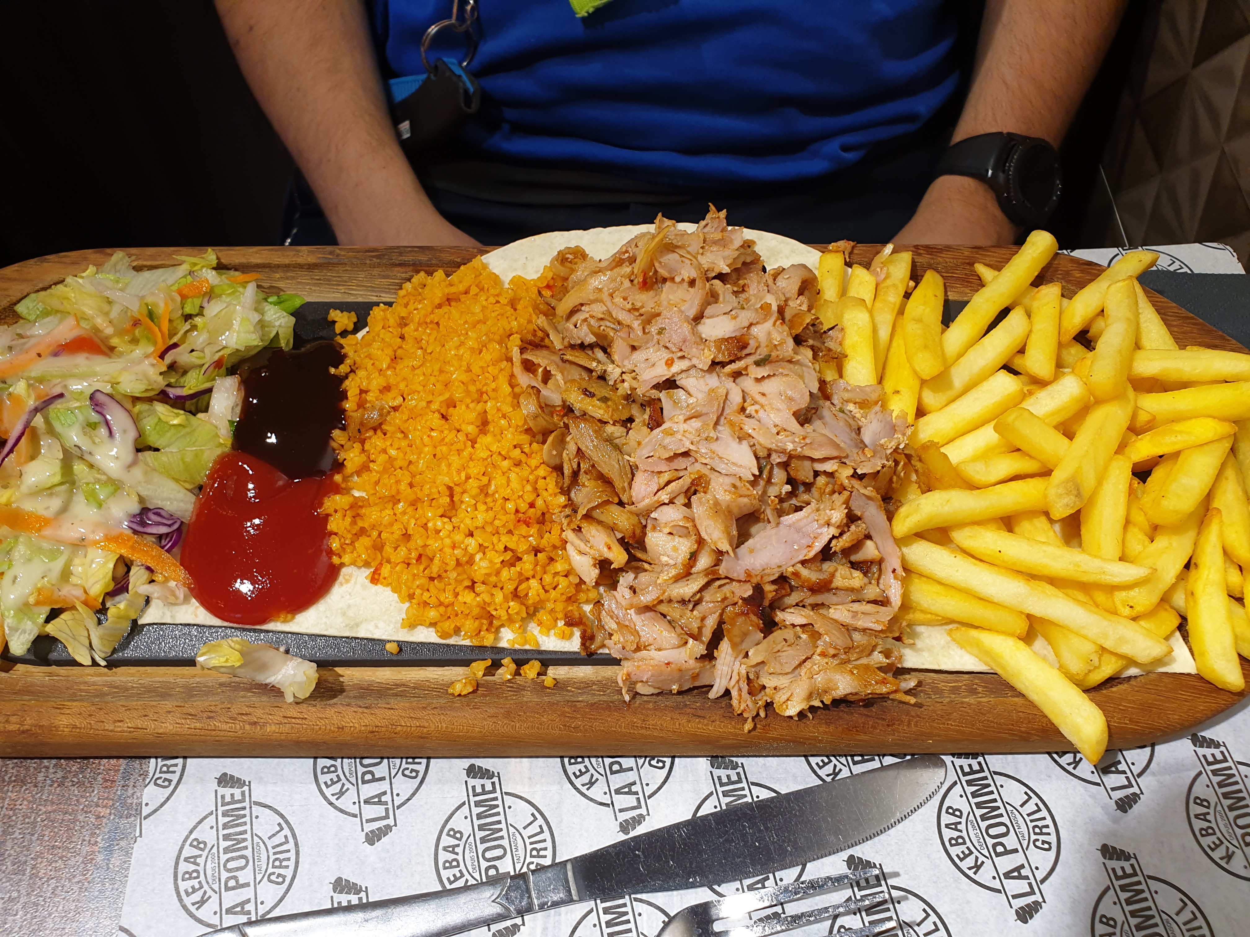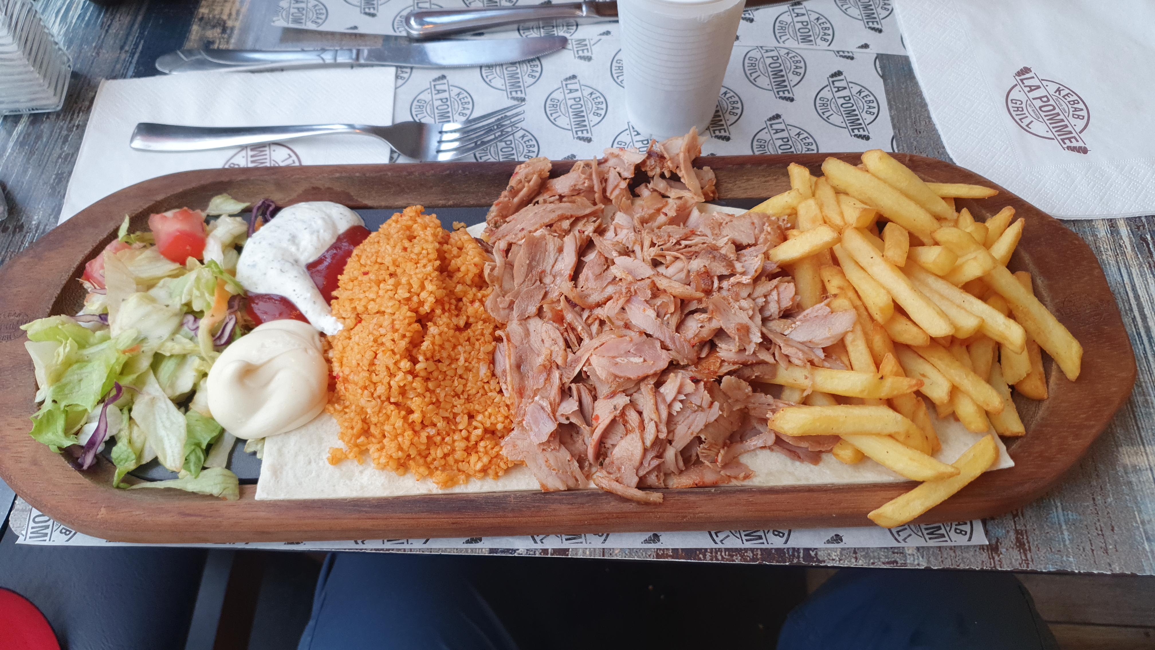 J'ai récemment mangé un kebab au restaurant La Pomme, et j'ai été un peu déçu. Que ce soit le veau ou le poulet, les deux étaient vraiment très gras. Les frites, quant à elles, ne sont pas faites maison, elles sont surgelés et bien grosses, ce qui n'ajoute pas de qualité au plat. Sauce blanche très goûteux et onctueuse. En revanche, le service est très rapide au vu du monde qu'il y a. On peut passé commande également par téléphone. Et la salle est vraiment grande et confortable pour s'installer.