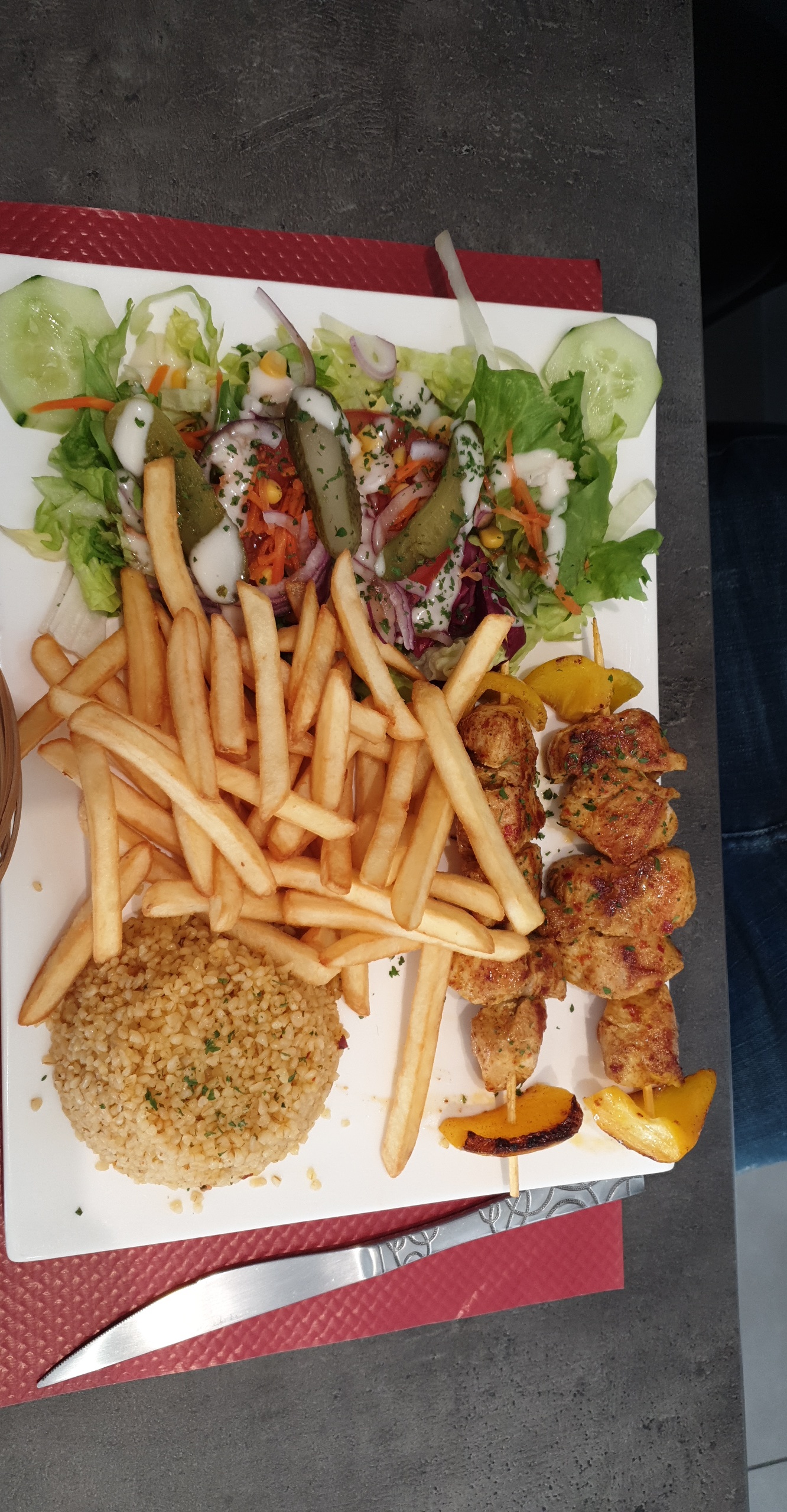 Il y a mieux comme restaurant ce qui m'a déplu c'est leur pratique d'encaissement qui est compliqué. Je souhaite payer en ticket restaurant mais ils le dise qu'il les prennent uniquement le midi et pas le soir et je paye par carte ont me confirme que la CB est accepté que à partir de 15 euros. Bref déçu. Mais le poulet mariné est bon le bulgur beaucoup moins il n'avais pas de goût et sec.
