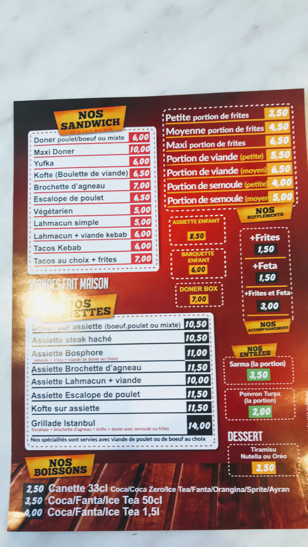 Première fois, commande sur place pour emporter à environ 18h30. - Petite portion de viande - Doner végétarien - Assiette à emporter Facture : 17€50. Accueil agréable mais pas de temps à perdre à parlementer, que 3 clients (dont un par commande tel)... Frites ne sont pas assez cuites (je n'ai jamais dit être pressée). J'ai demandé un ou deux piments verts en sus (je vous les mets dans l'assiette) pas de piments... la sauce de l'assiette à été mise sans demander sur la viande et la salade. Je trouve la portion de viande trop chère (4€) et la viande poulet et déjà assaisonée. Sinon les cruditées sont fraîches et le pain et bon.