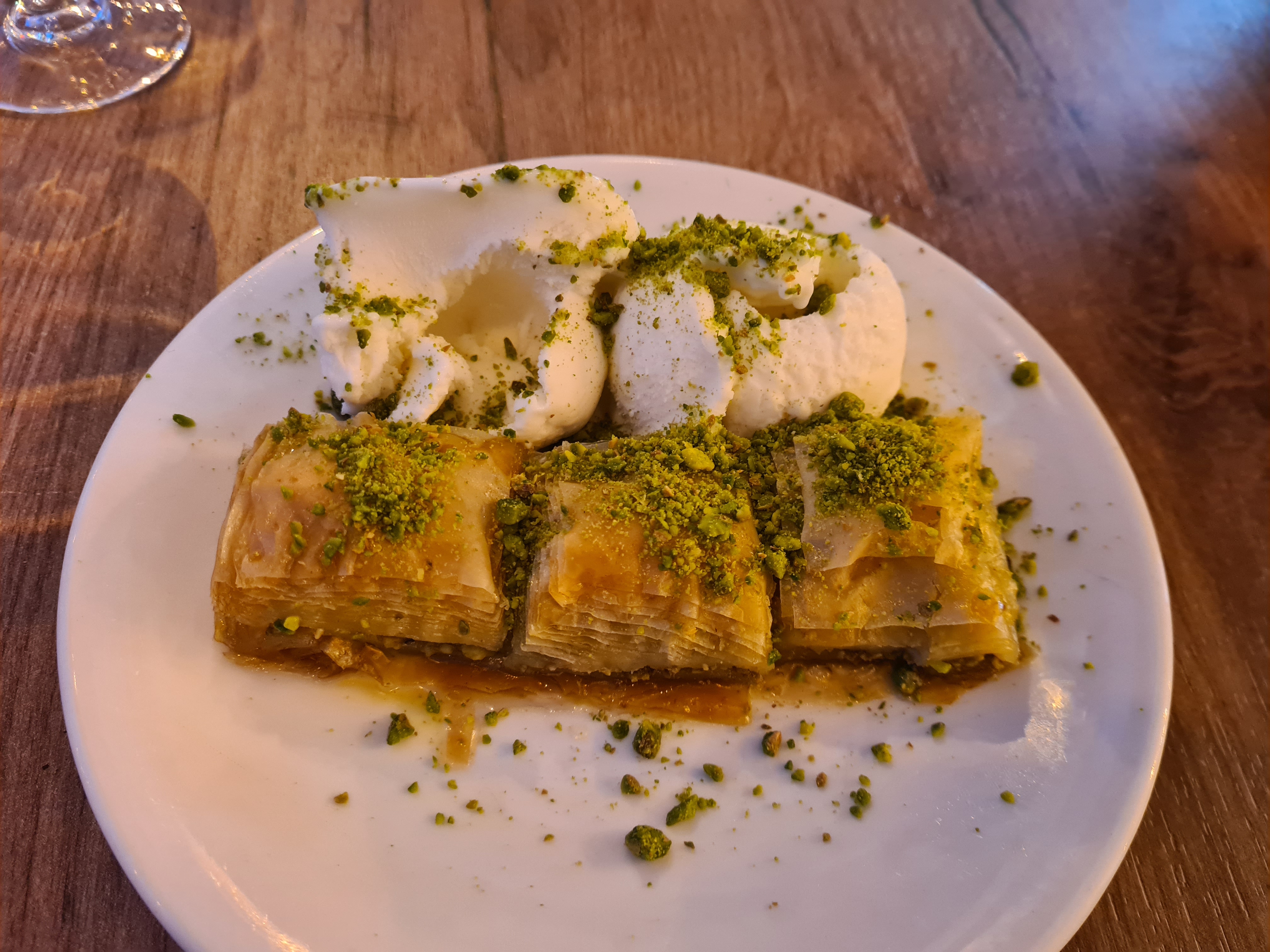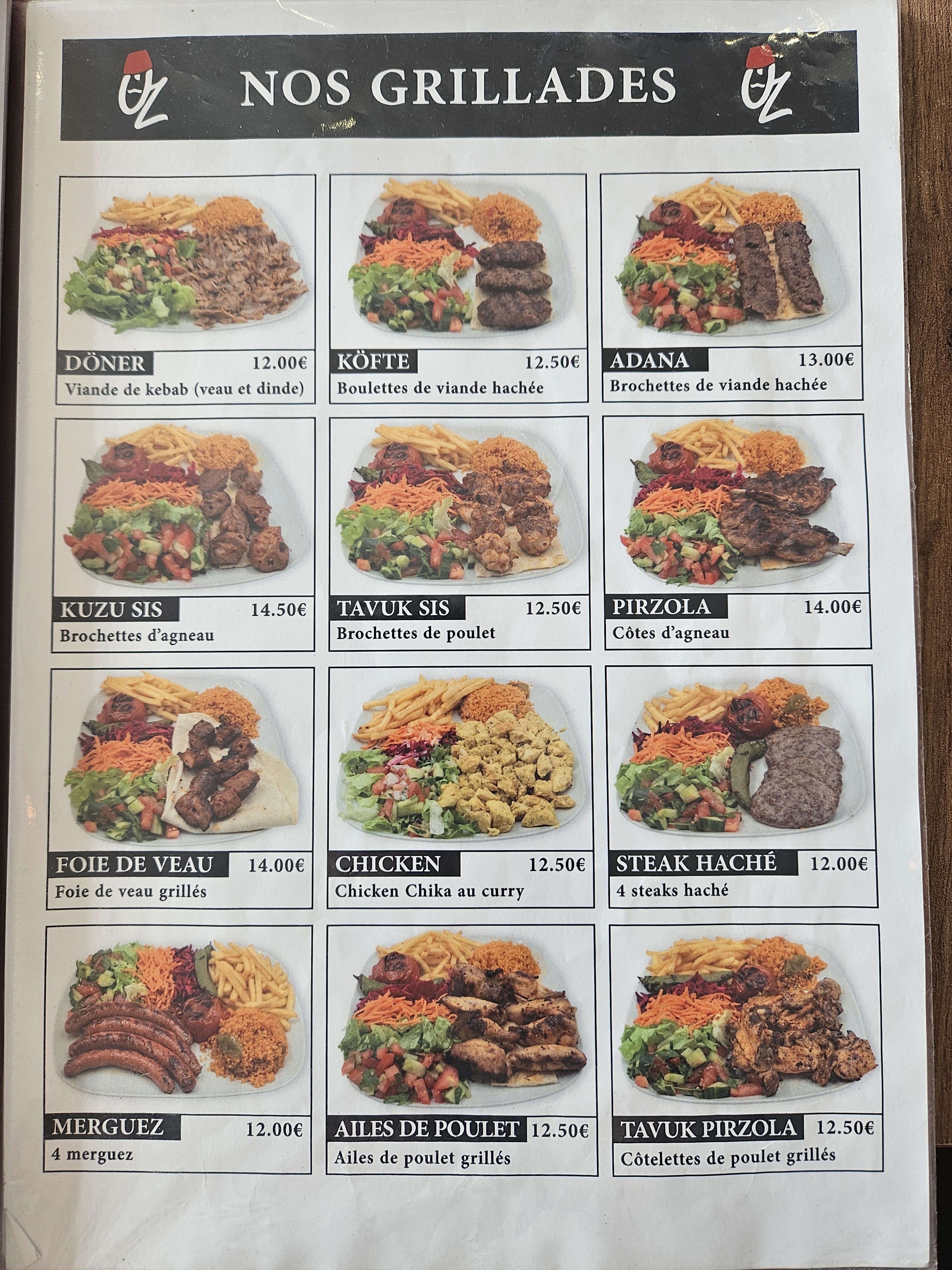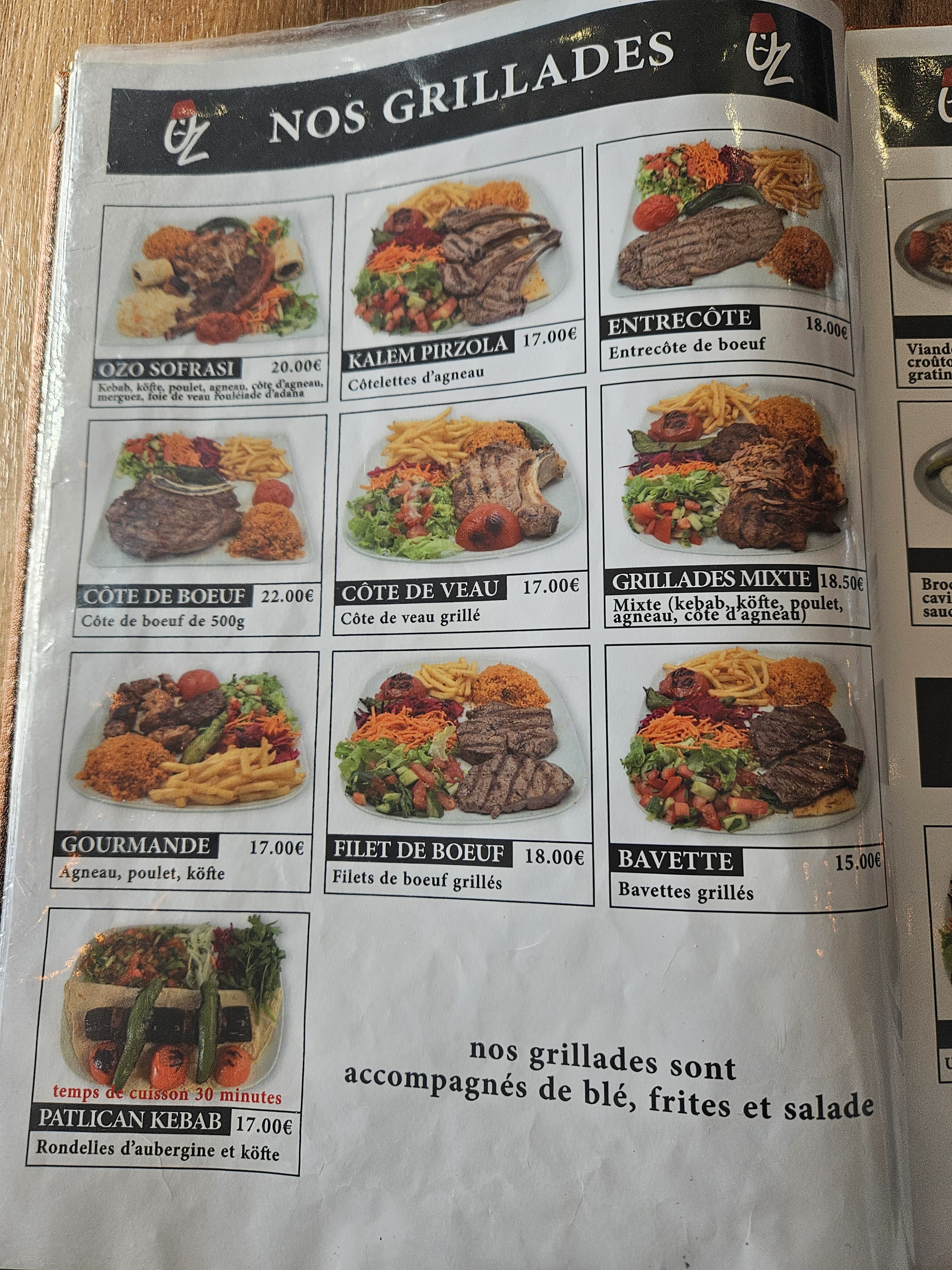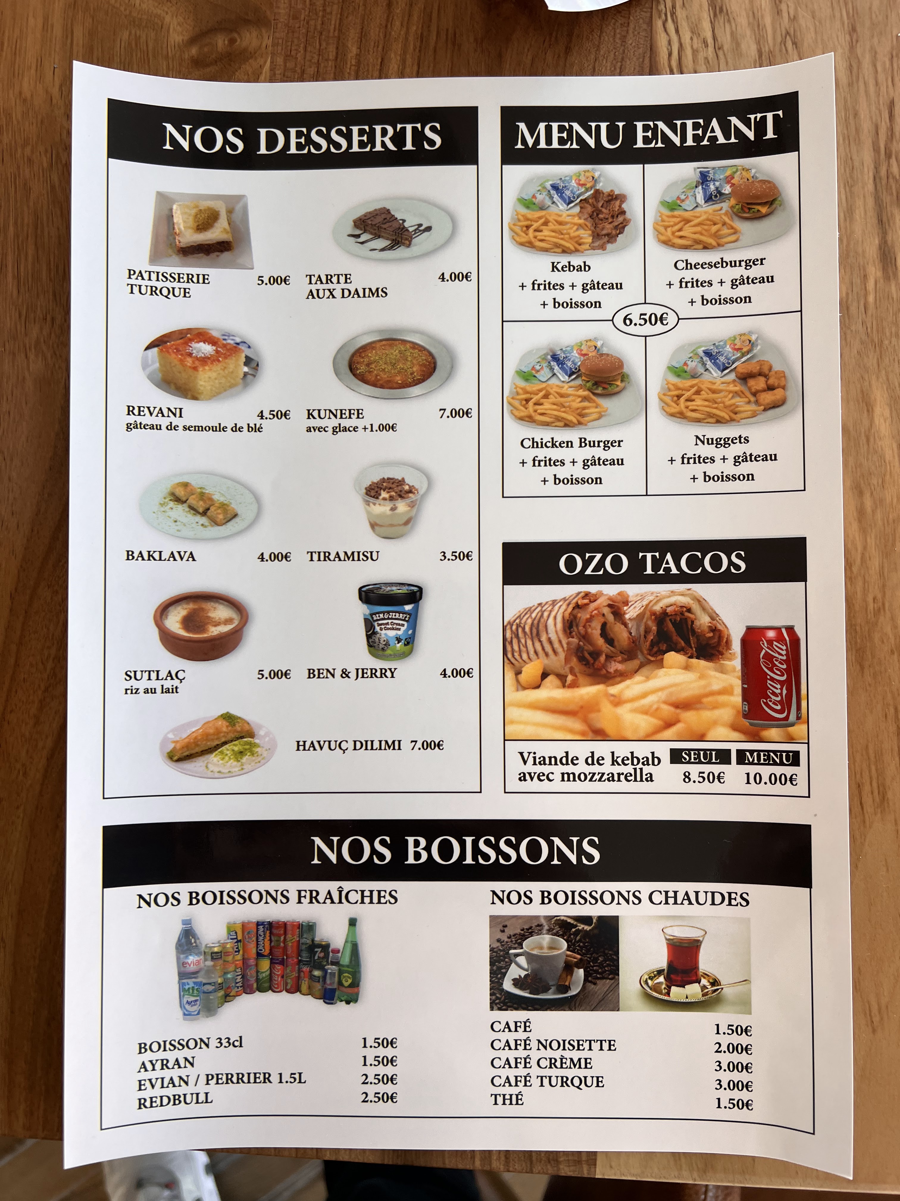 Le restaurant est en tout point très qualitatif. -Pour l'accueil, j'ai toujours été reçu avec le sourire et parfois on propose même du thé pour patienter. -Pour les plats, j'ai goûté plusieurs sortes de grillades et de sandwichs et je n'ai jamais été déçu. Notamment l'assiette « Oz Sofrazi » qui est un assortiment de plusieurs viandes, et rien à dire, c'est excellent. -Les desserts turcs sont excellents (certains sont assez sucrés mais restent très bons). Mention spéciale pour le kunefe qui, malgré le prix de 7 €, en vaut la chandelle. Jamais déçu. Je recommande.