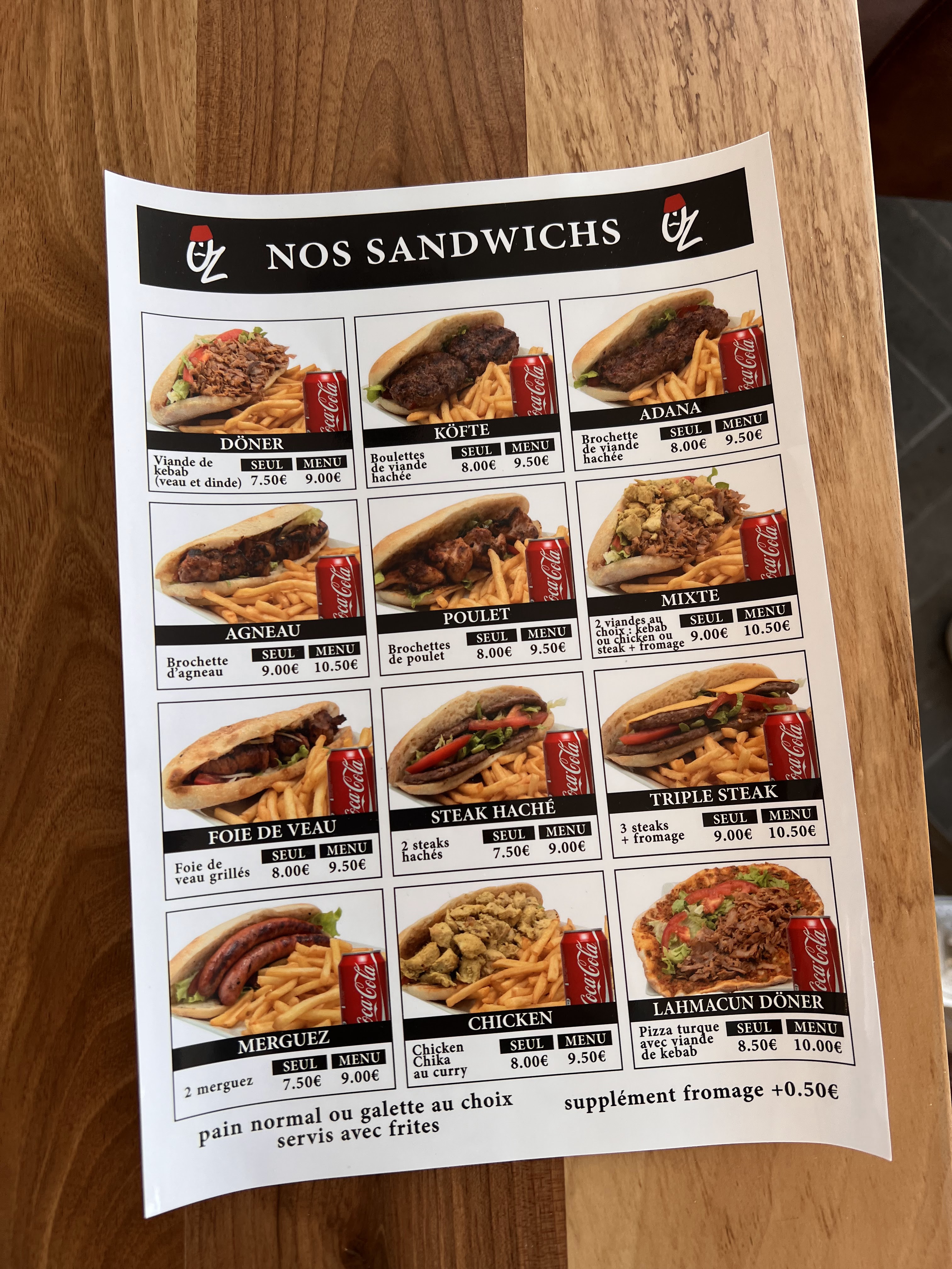 Lahmacun bon, Sandwich Adana très bon, grande quantité de frites même si c’est du congelé. Mais de côté service, nettoyage de sol en présence de client en faisant bcp de bruit avec les chaises et faire avec la balaie à côté de nos plats. Trop de bruit entre les employés. Oui c’est de la restauration rapide mais il y a un minimum de respect de clientèle.