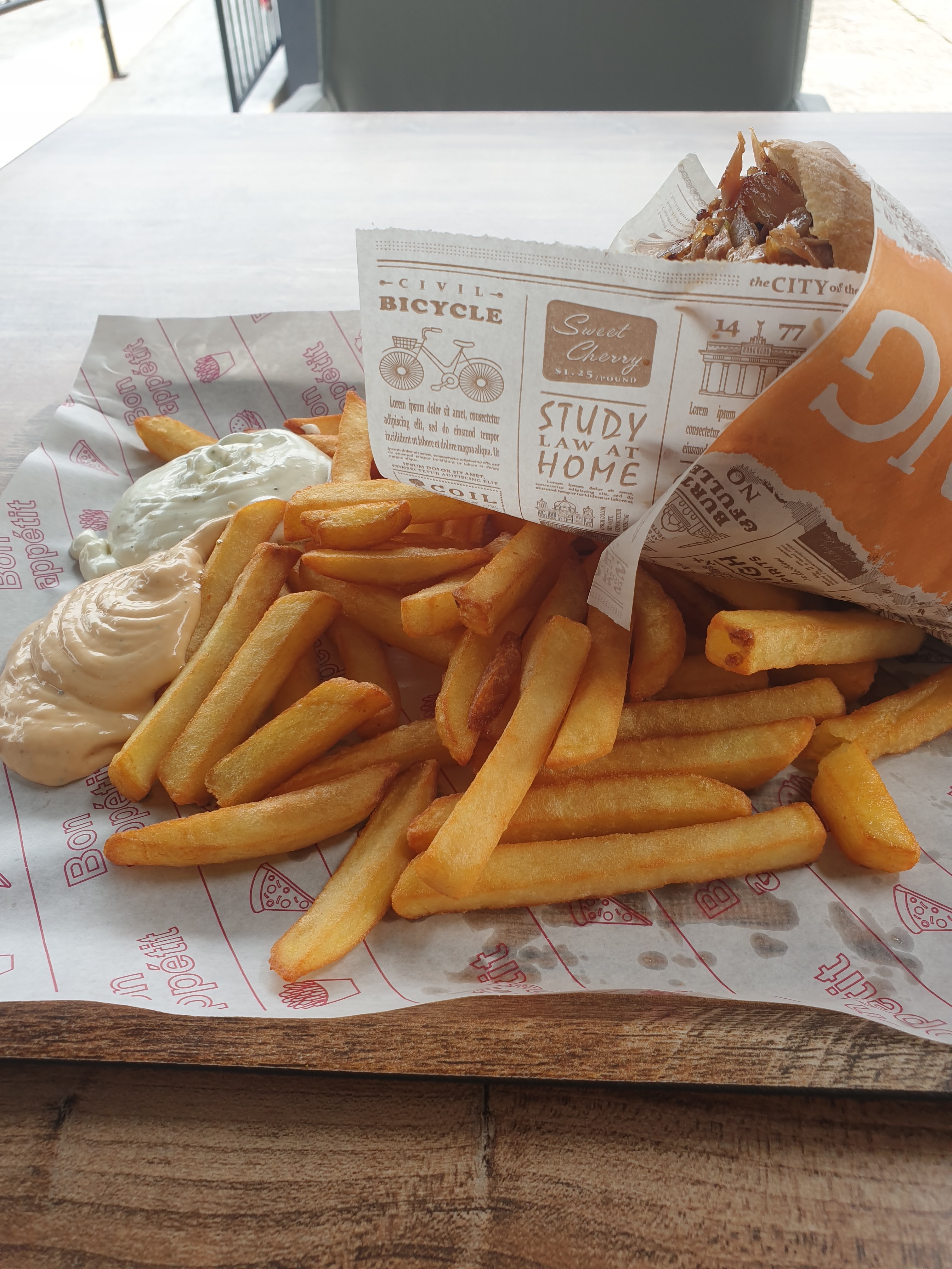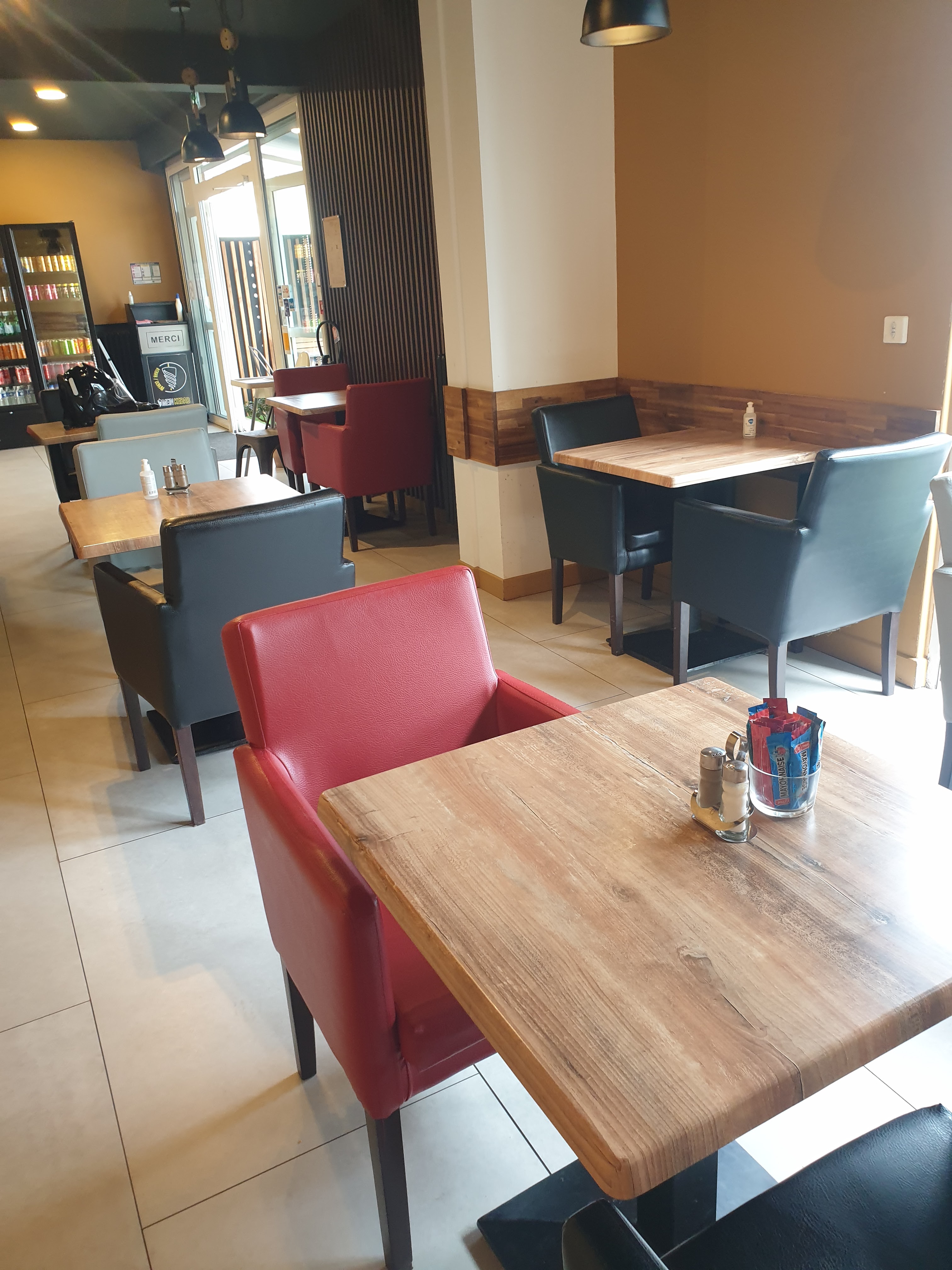 Désolé mais je n’ai vraiment pas aimé, je trouve que la pain n’est pas assez salé, la viande pas assez cuite, on ne peut pas choisir n’importe quelle sauce dans le pain et la portion en frite est trop petite. De plus les canapés sont sur des planches en bois, c’est pas confortable. J’ai été vraiment déçus