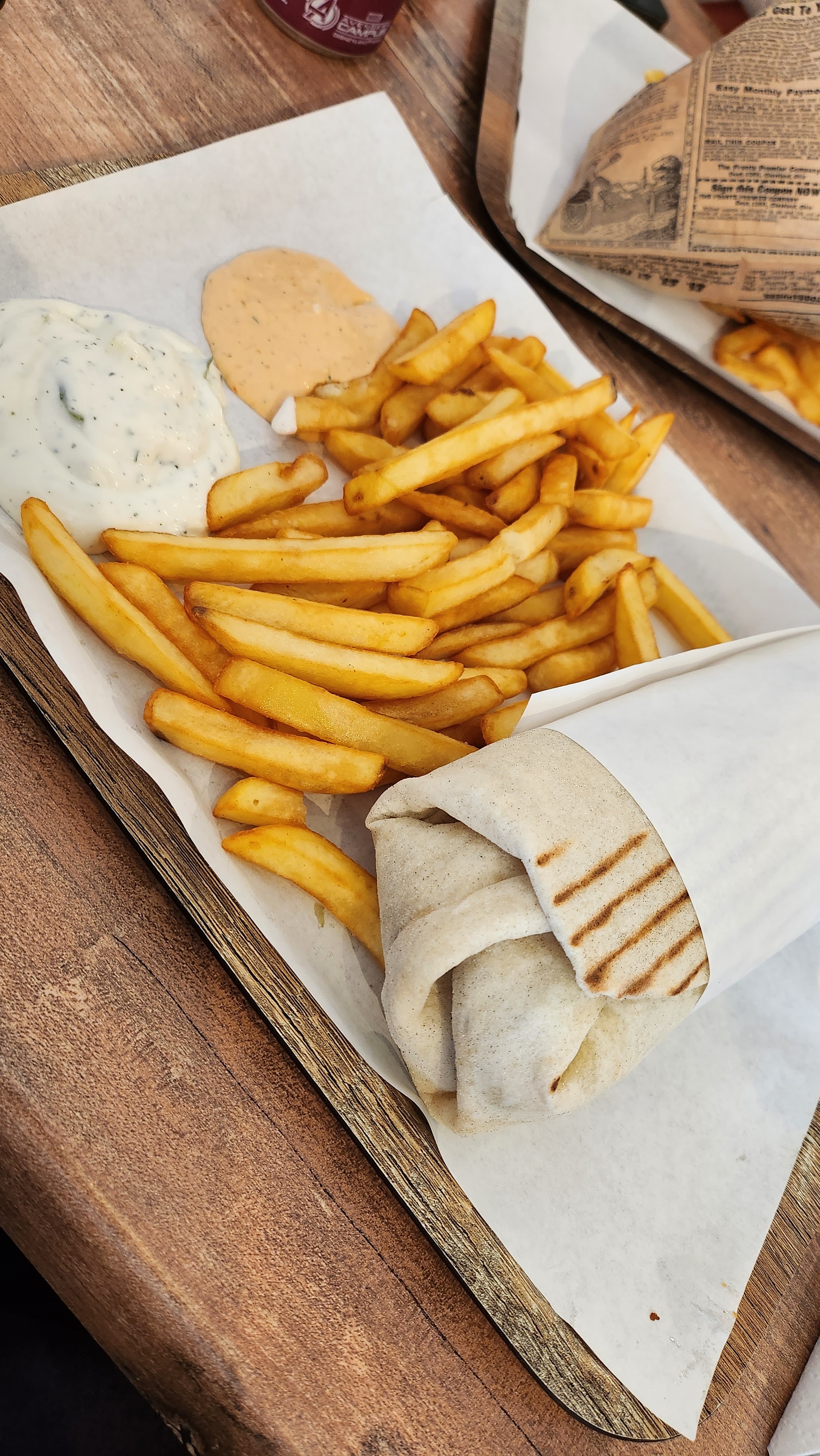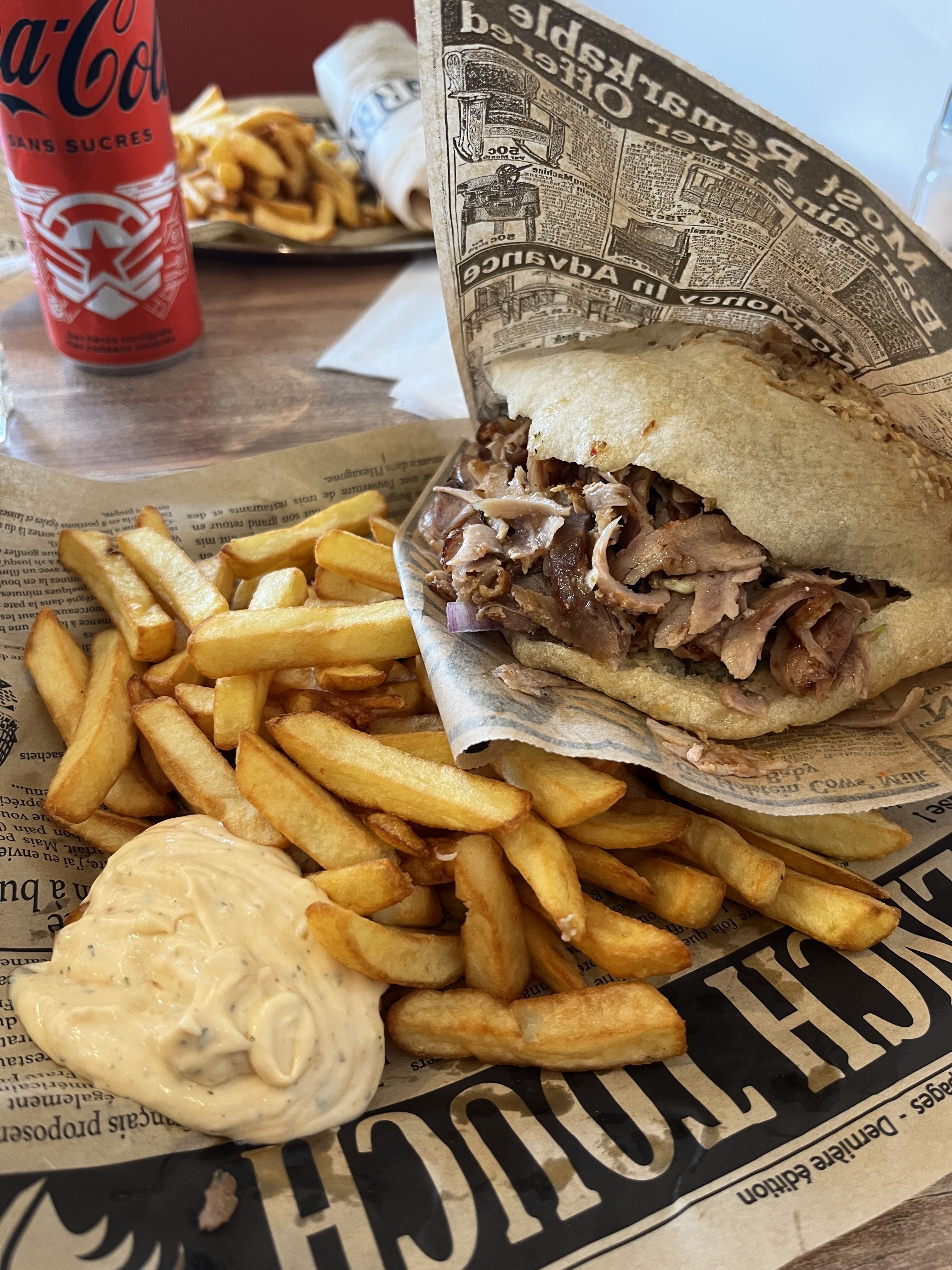 Durum maison très bon Viande de grec super bonne et portion correct, sauce et condiments tres bon ( Choux rouge / feta pas mal du tout ). Seul bémol le temps d’attente plus de 20 minutes pour un grec à emporter c’était abusé l’équipe en cuisine ils dorment ils ne sont pas du tout pas au niveau d’un grec qui débite. Gourmet ou pas la cuisson de la viande est la meme dans tout les grec, les condiments pareil, le pain est cuit d’avance et les frites sont congelées du coup je ne vois vraiment Pas ce qui justifie ce temps.