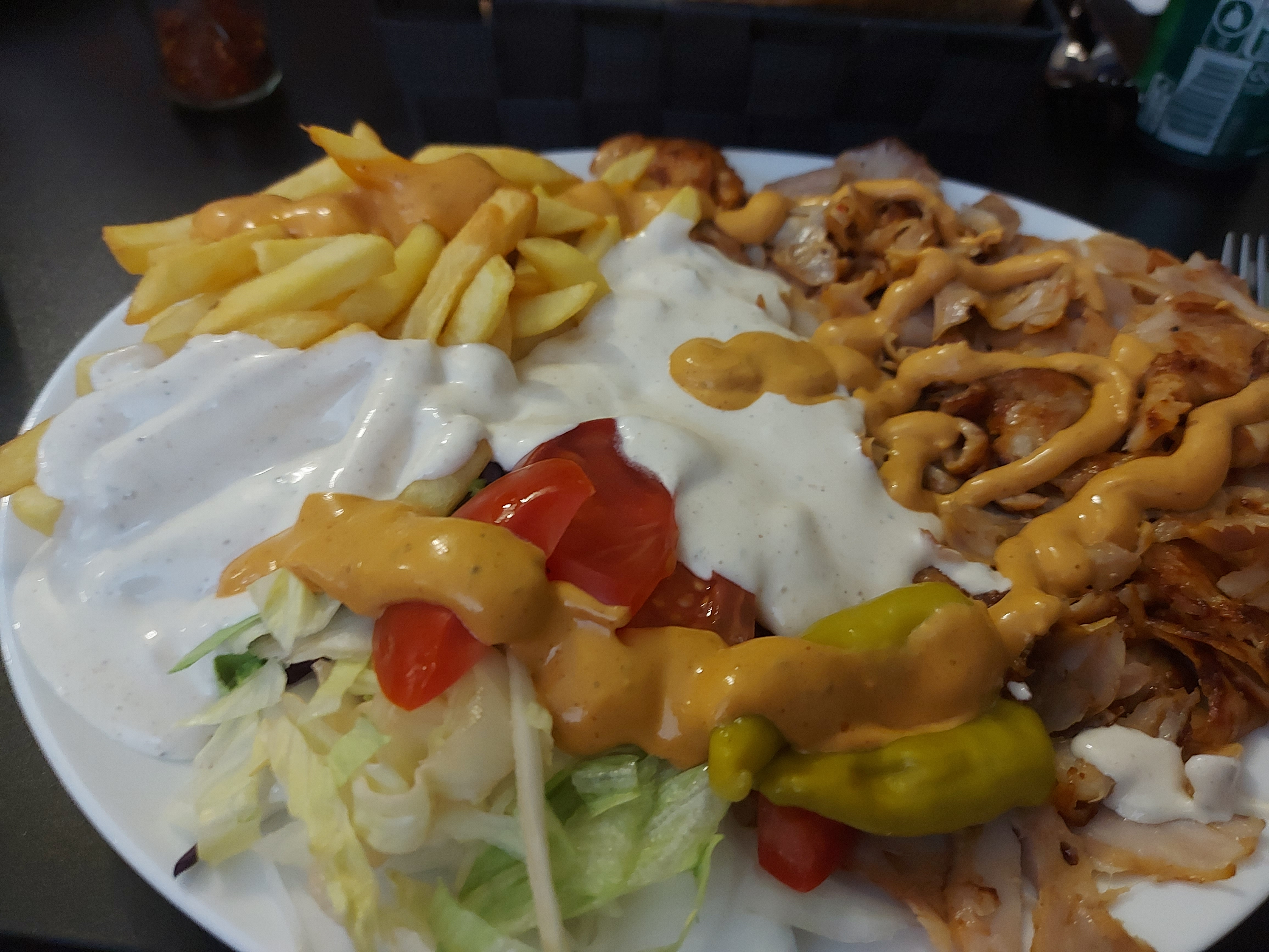 Service très rapide, kebab sur assiette très généreux, viande, accompagnements et frites excellents