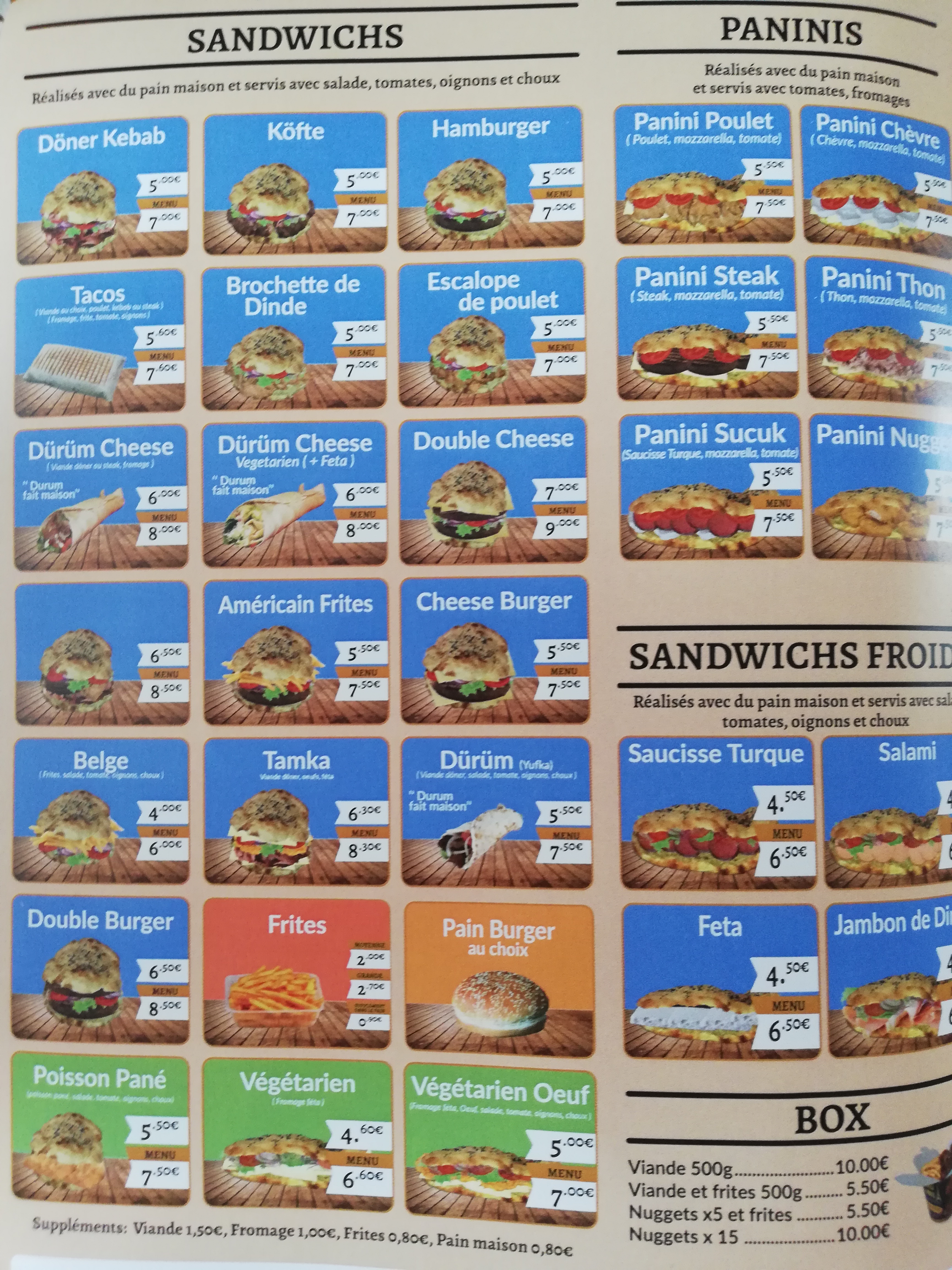 J ai passer une commande de 90 euro: Pizza poulet blindé d'olive, demande un supplément œuf qui n'y est pas au final. Deux panini ignoble sec zéro sauce. Un tacos, il devrais s arrêter au kebab c est mieux pour eux. Un box de nugget à 13 euro ! Dedans 4 nugget planquer au milieu de frite dégueulasse. Un kebab sans crudité est demander, évidement à l ouverture y a les crudité. Il faut changer de métier si vous n aimez pas ce que vous faites.