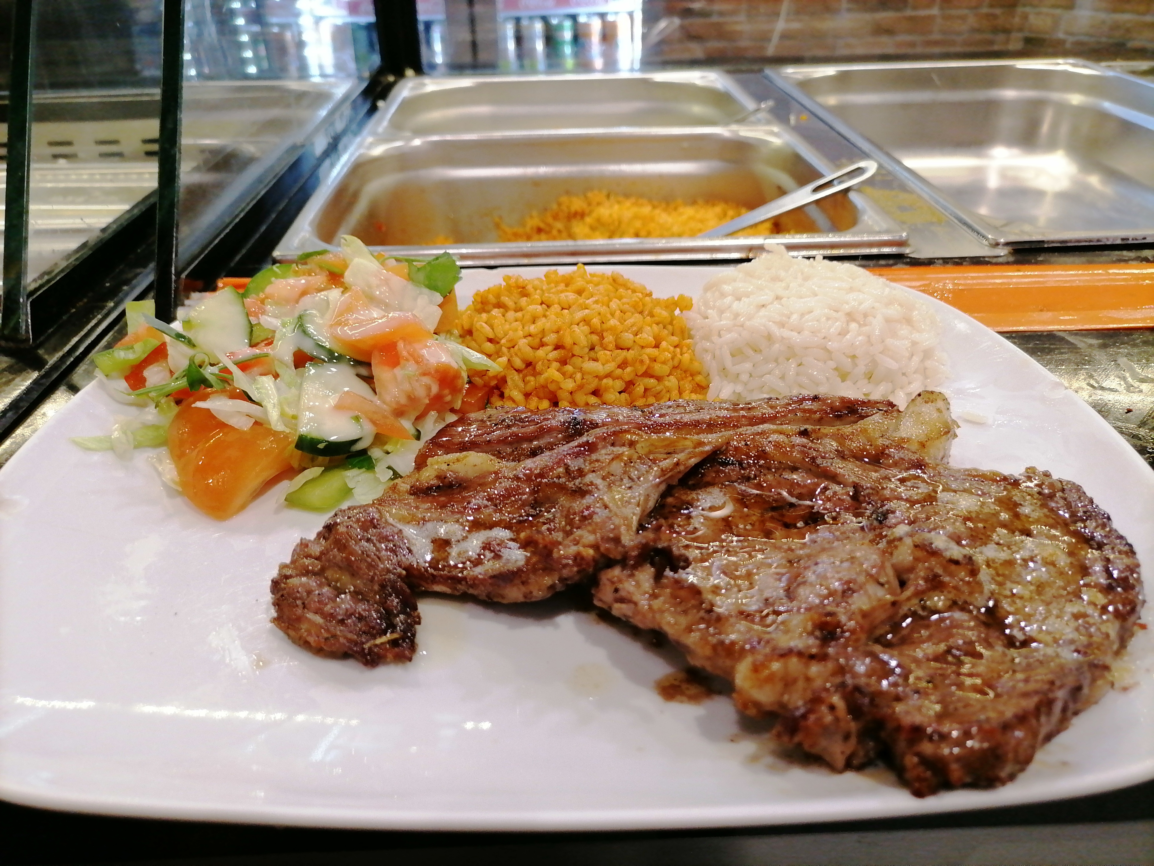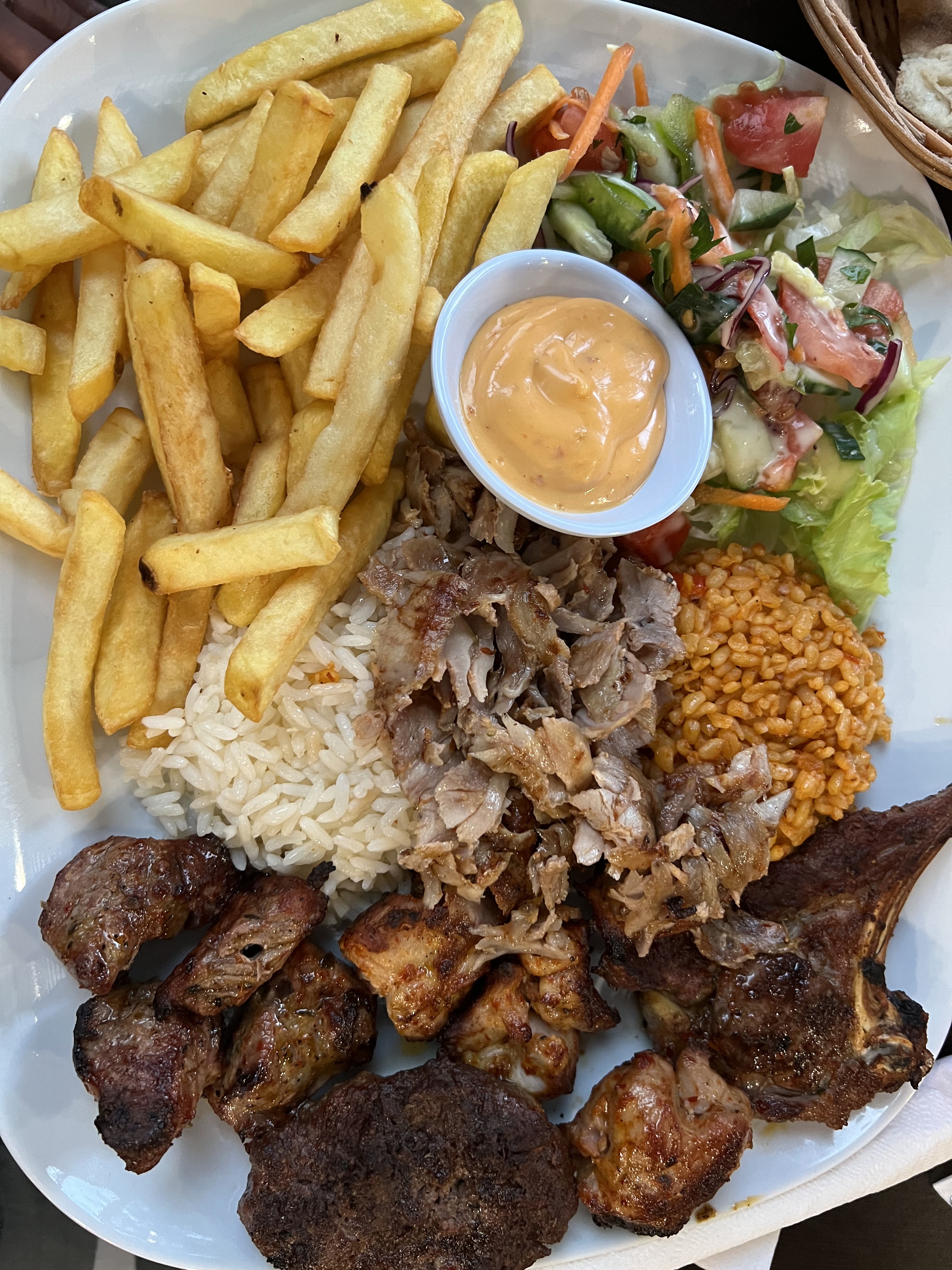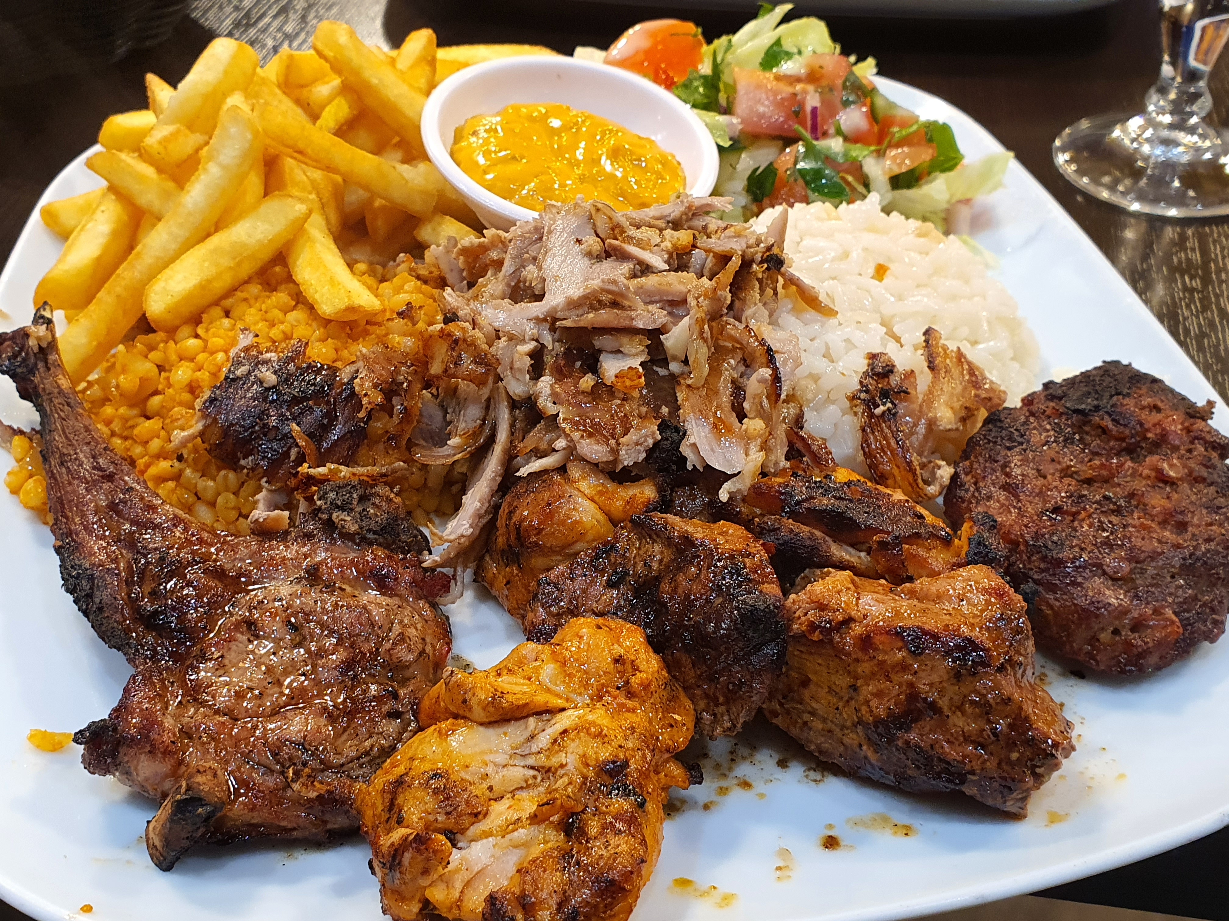 Assiette mixte parfaite, viande de grec, poulet, kefta, côte d'agneau, riz, boulgour, frites tout était très bon. Franchement super content pour ma première fois là-bas. Personnels sympathique et serviable. N'hésitez pas c'est super bon.