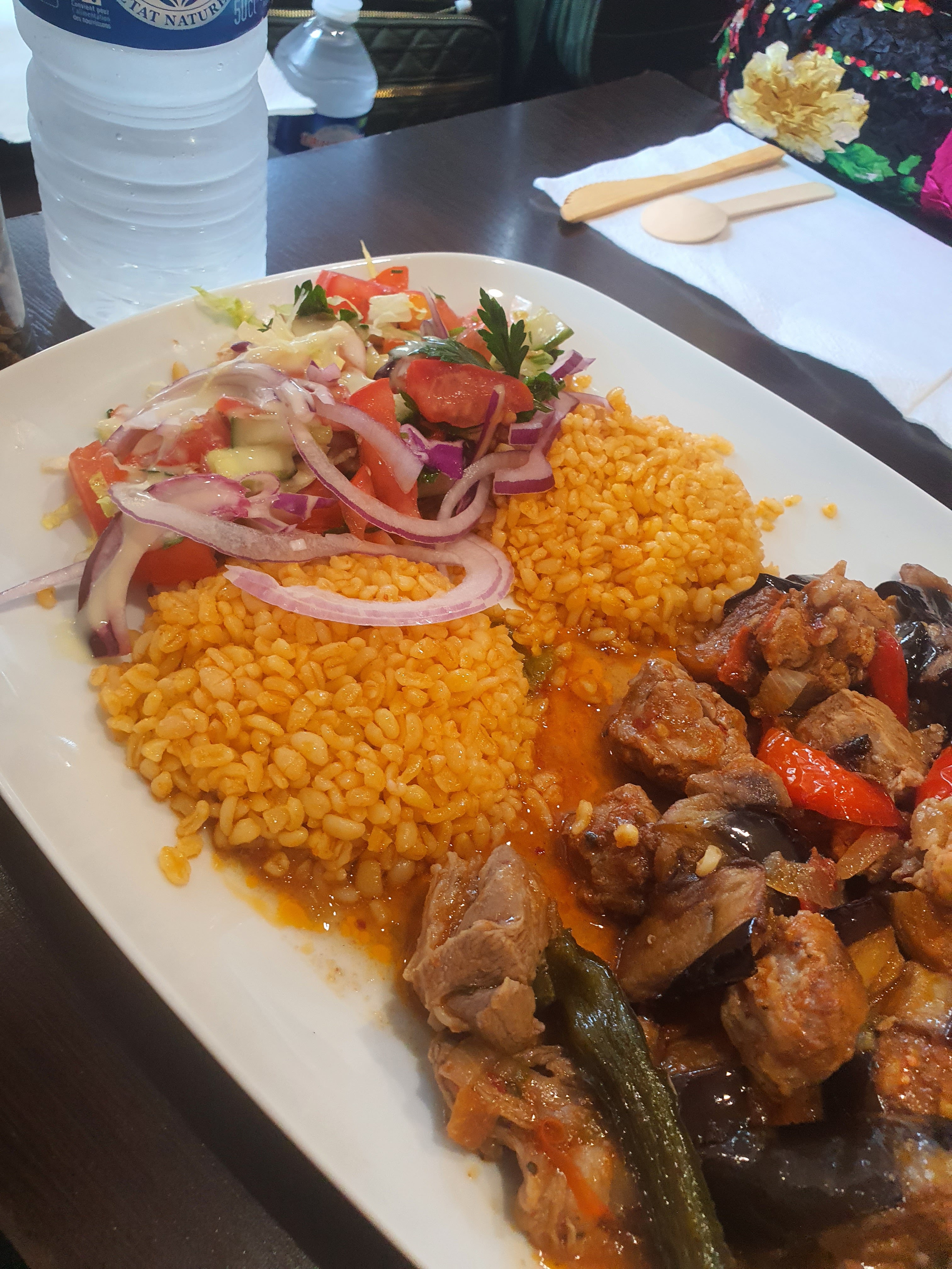 Délicieuse cuisine turque. Ma commande est un plat principal, il contient des lampes grill, de la salade, du quinoa (très bon) et des frites. Bon service et le personnel souriant et serviable.