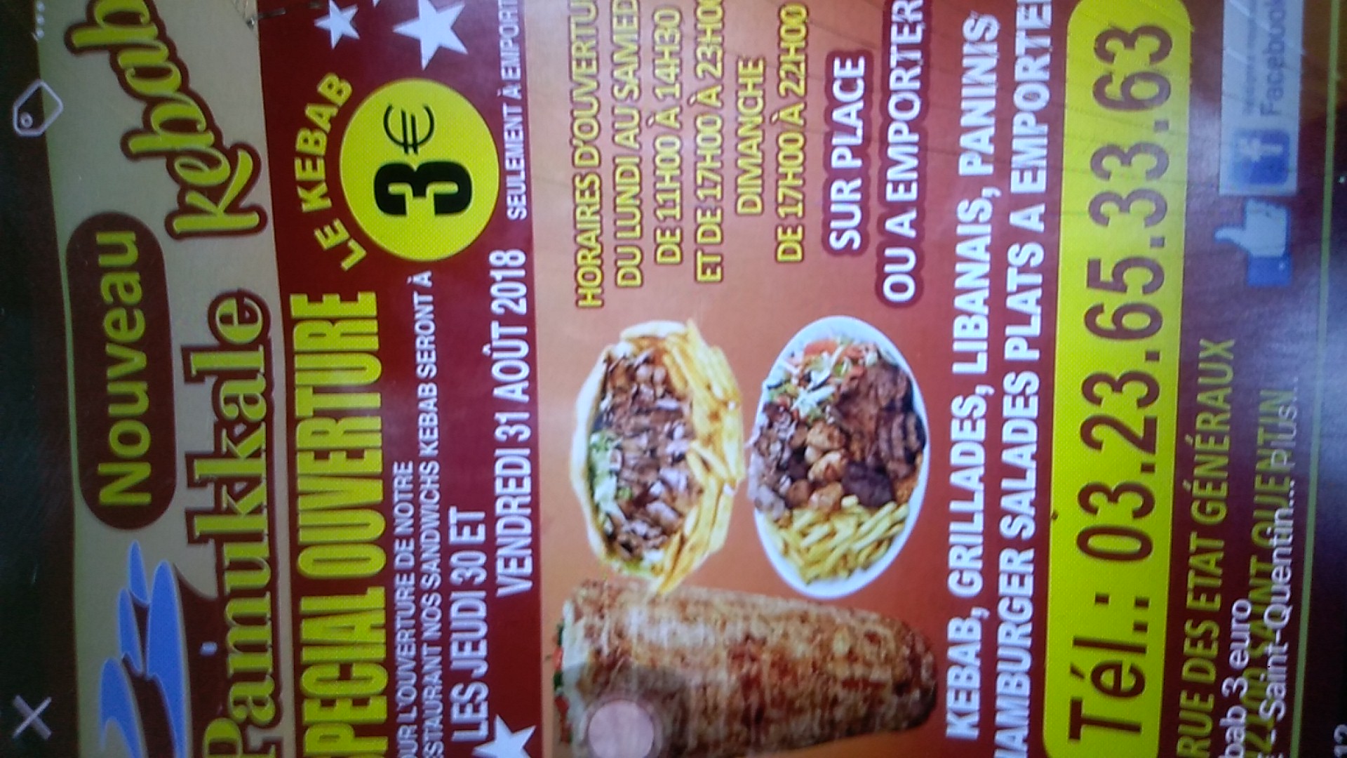 Voici toutes les informations sur le Restaurant turc Pamukkale qui ce trouve au 26 Rue des États Généraux, 02100 Saint-Quentin (02). Sur cette fiche vous trouverez les photos, l'adresse, les horaires d'ouverture, le numero de téléphone et les avis clients.Vous pouvez églement rédiger un avis si vous le souhaitez en bas de page.