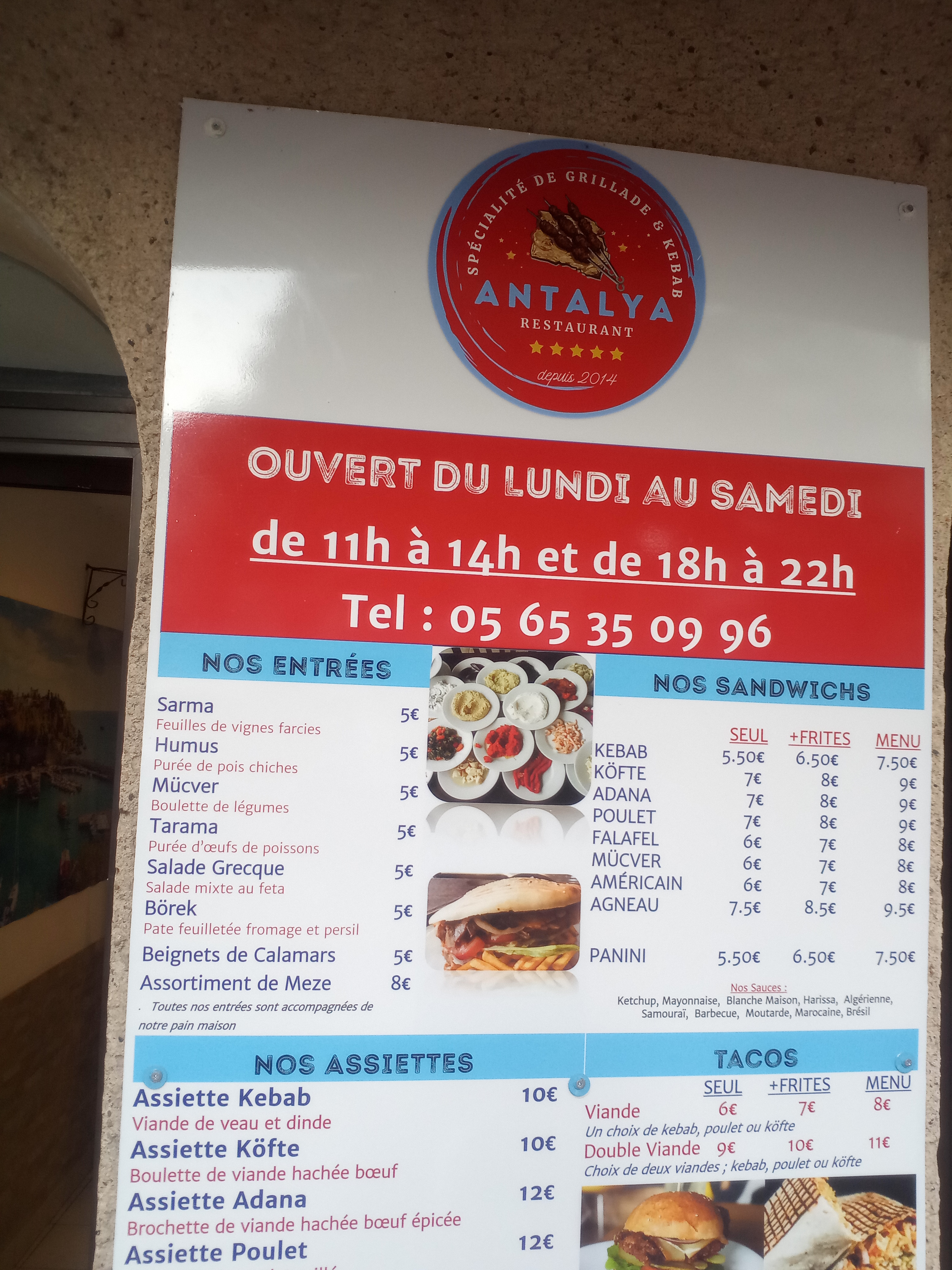 L'Antalya est un établissement de restauration rapide type kebab,ouvert du lundi au vendredi uniquement en plat à emporter de 12h à 14h et de 18h à 21h pendant la période du confinement.Ces informations sont valables jusqu'au 11 mai et seront actualisées à cette échéance.Prenez soin de vous,protégez vous.