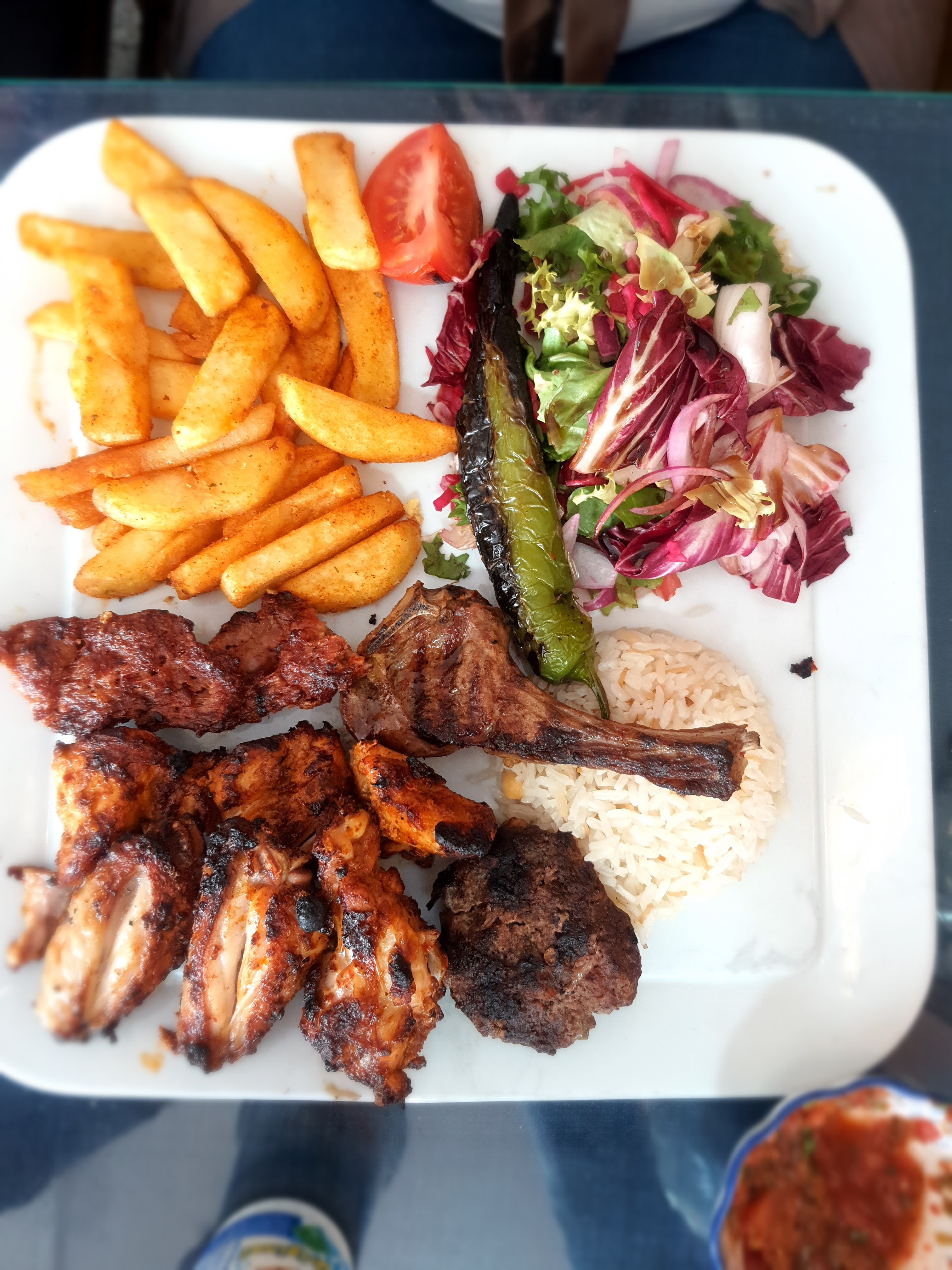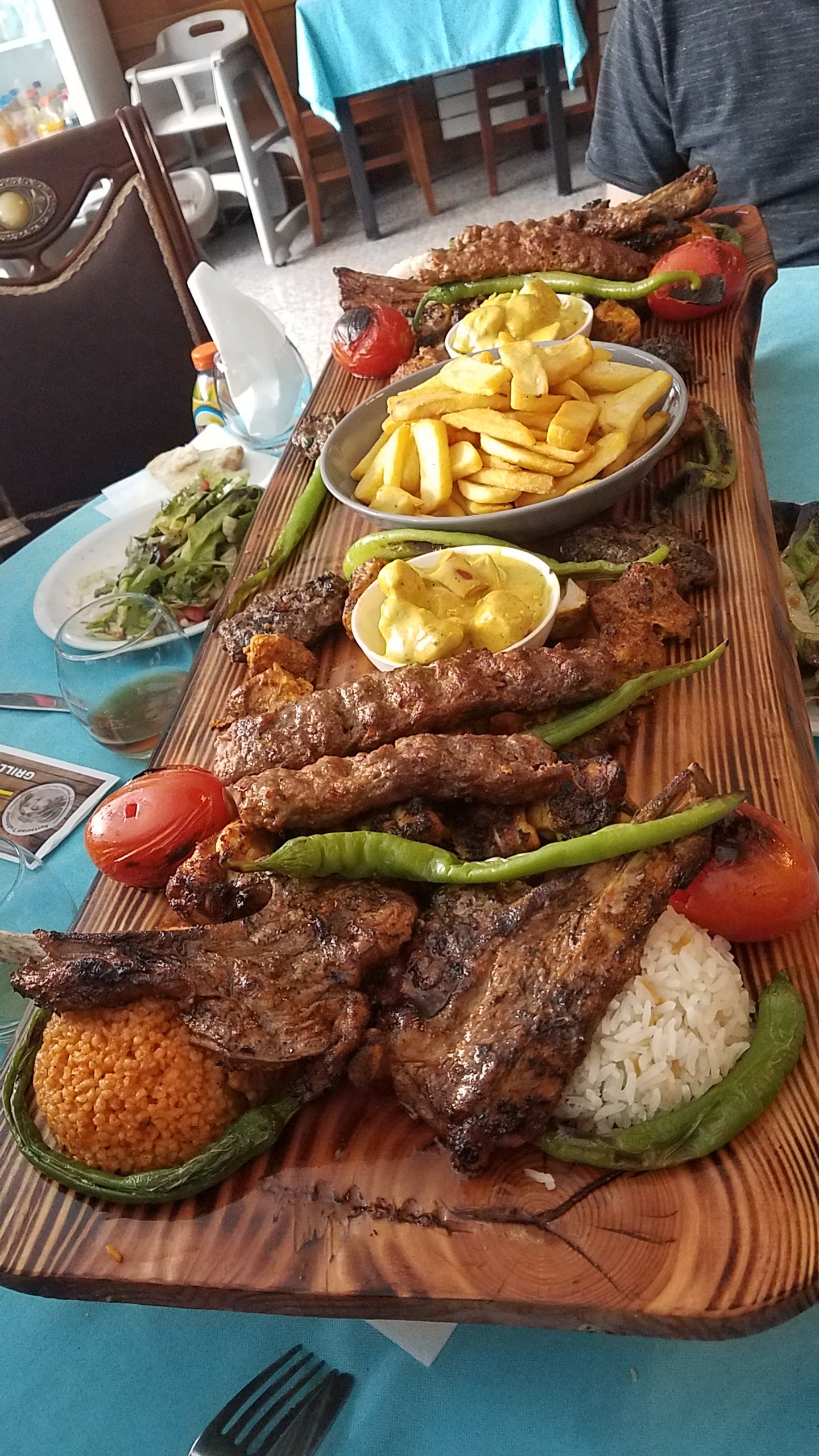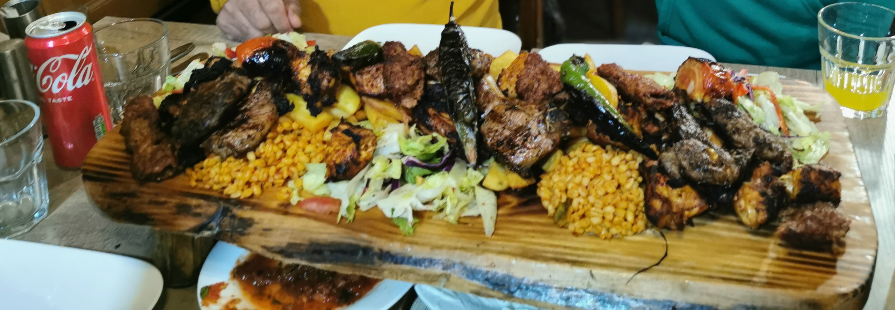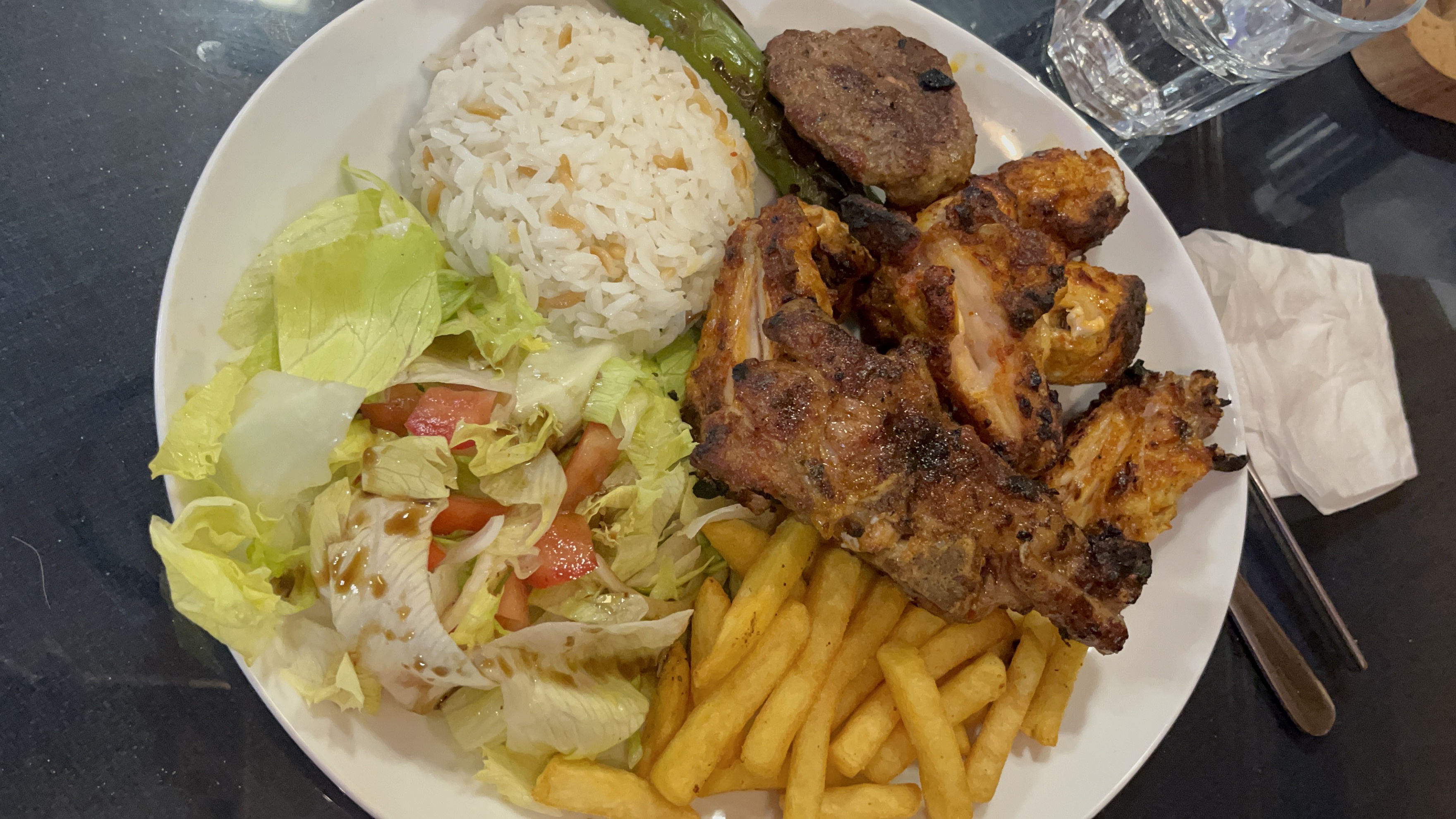 Une 1er pour moi dans ce restaurant Turc. J'ai bien apprécié la planche de grillades de viandes servies avec du riz façon Turc, frites et salade.