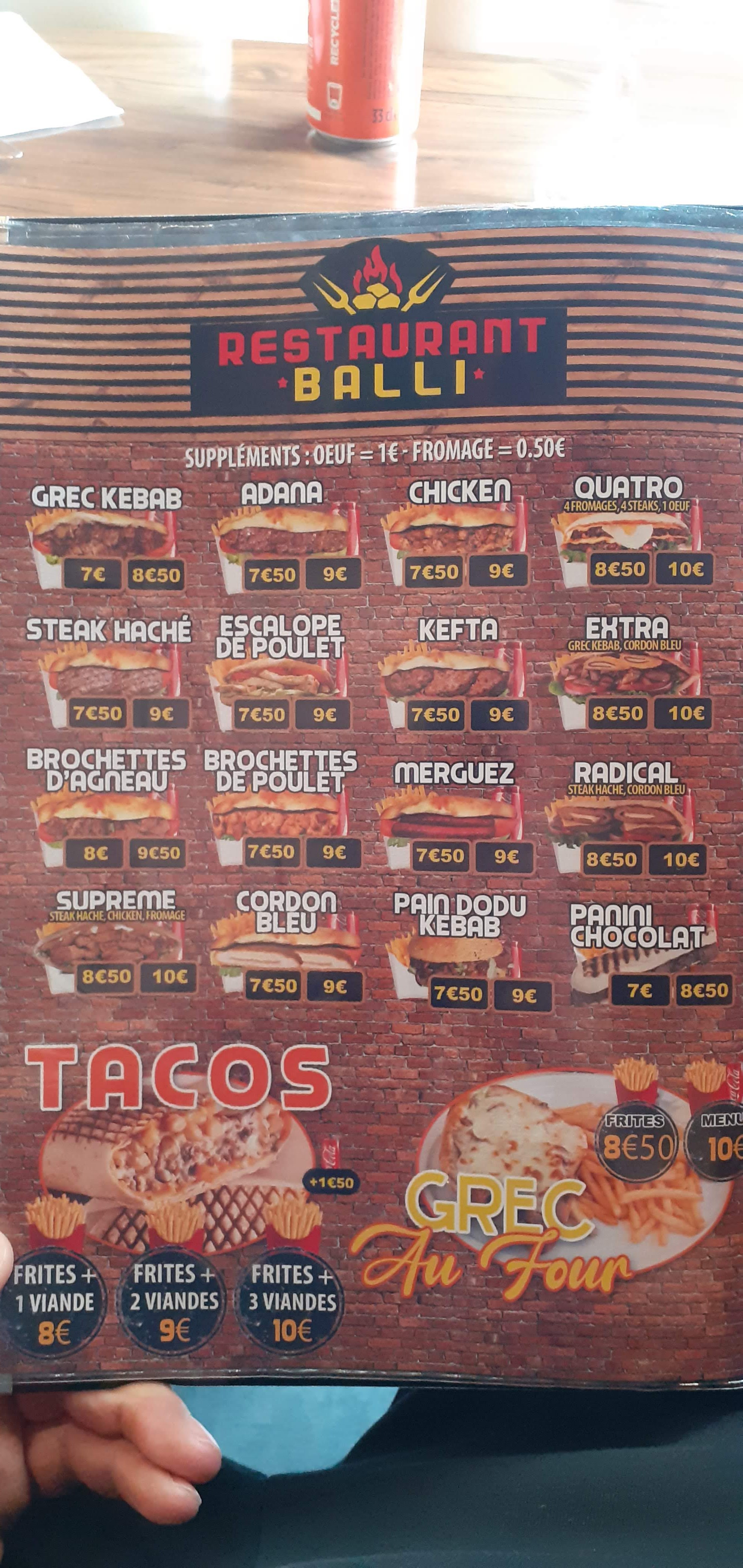 Première expérience dans ce nouveau restaurant Ze Balli... Premièrement la nouvelle configuration du restaurant est plutôt sympa surtout la terrasse abritée qui n'existait pas lorsque c'était Family pizza ... L'accueil est simple et cordial, la patronne discute sans soucis mais le patron reste plutôt discret ...😉 Au niveau du menu, vous aurez le choix entre 6 sandwich et 4 burger et 2 pizza simple ou kebab 🥙 De plus 8 assiettes différentes rempliront toutes vos envies de viandes accompagnées de frites 🍟, blé 🌾 ou salade mixte... Pour les plus jeunes, vous trouverez un menu enfant avec 6 nuggets accompagnés de 🍟 frites... Pour finir votre repas vous aurez le choix entre deux desserts (tiramisu ou tarte 🥧 au Daim) ou un café ☕ Côte boisson la canette à l'unité est à 1€50 et la bouteille à 3€00 Les assiettes vont de 8€00 à 12€50, les sandwich 5€50 à 6€00 et les menus de 6€50 à 7€00 Pour finir les barquettes sont généreusement remplies et goûteuses... 😉 😋 En 2022, l'expérience est toujours aussi agréable... L'accueil est toujours sympa et les sandwichs toujours aussi généreux 👍