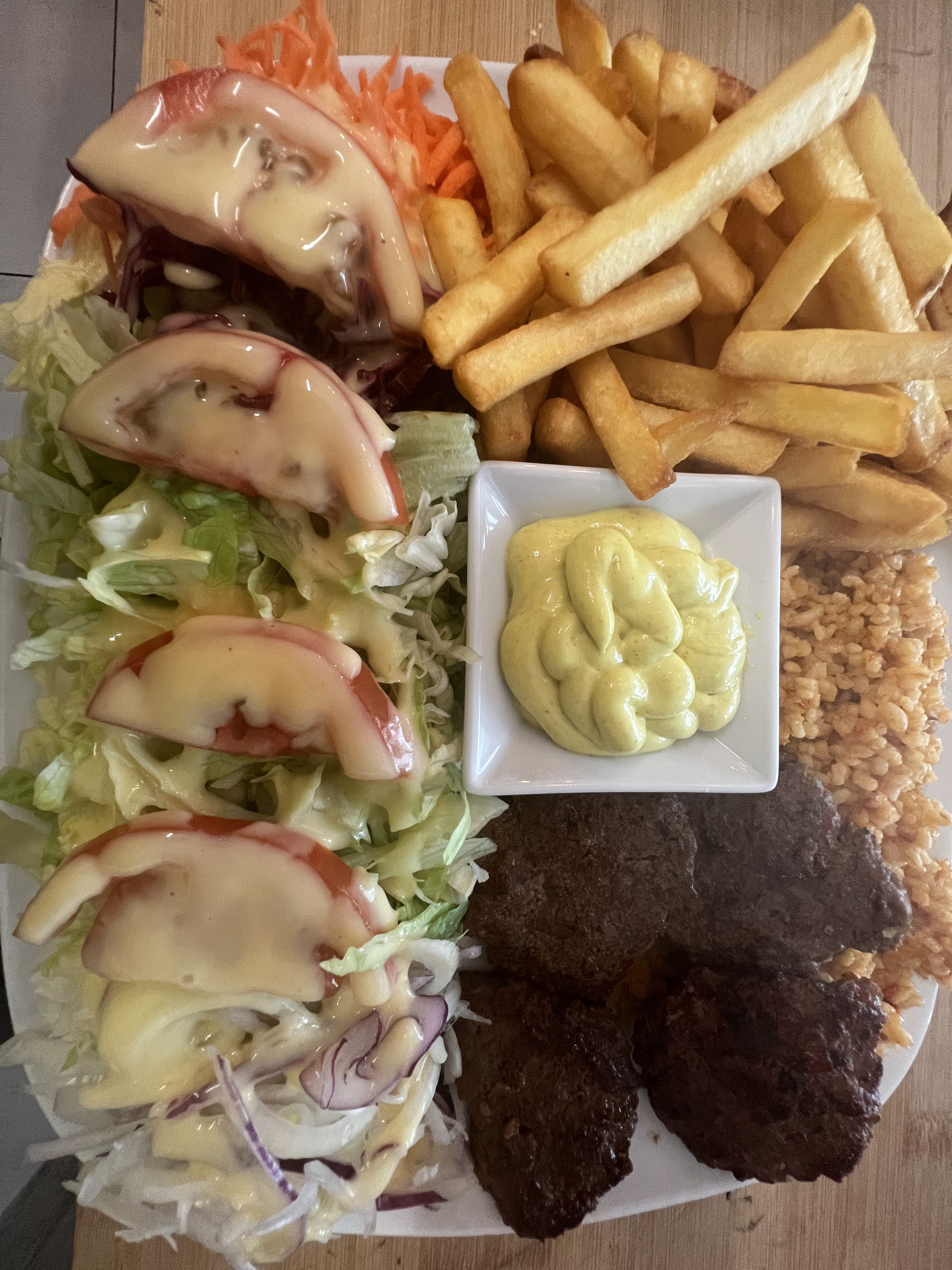Foutage de G...... sauce dégoûtante.... Servi avec 5 frites .... salade tomate oignon j’ai vu que les oignons !!!!! Pour un nouveau restaurant pas cool