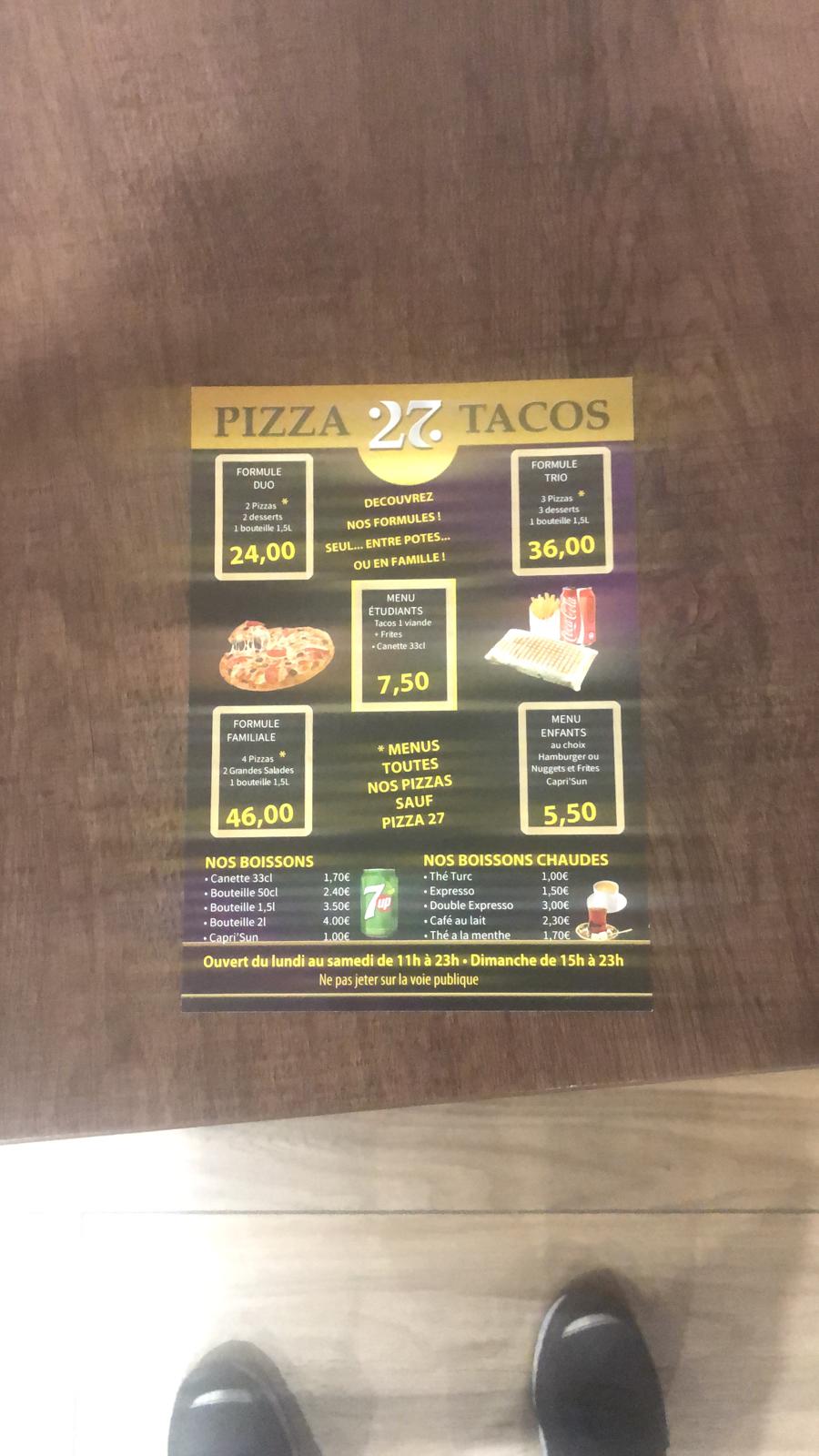 Pizza27 ; J'ai pris mon temps pour vous partager mon avis mon expérience j'ai commander un tacos , il était assez original mais un délice . La cuisine c'est de l'art et il faut oser . Un autre fois des pizzas , elle était savoureuse 😋👍🏿... Et puis , On dit souvent quand les toilettes sont propres on peut manger les yeux fermés , les toilettes sont bien entretenu super ! En plus accueillent et courtois . Cool 🤩