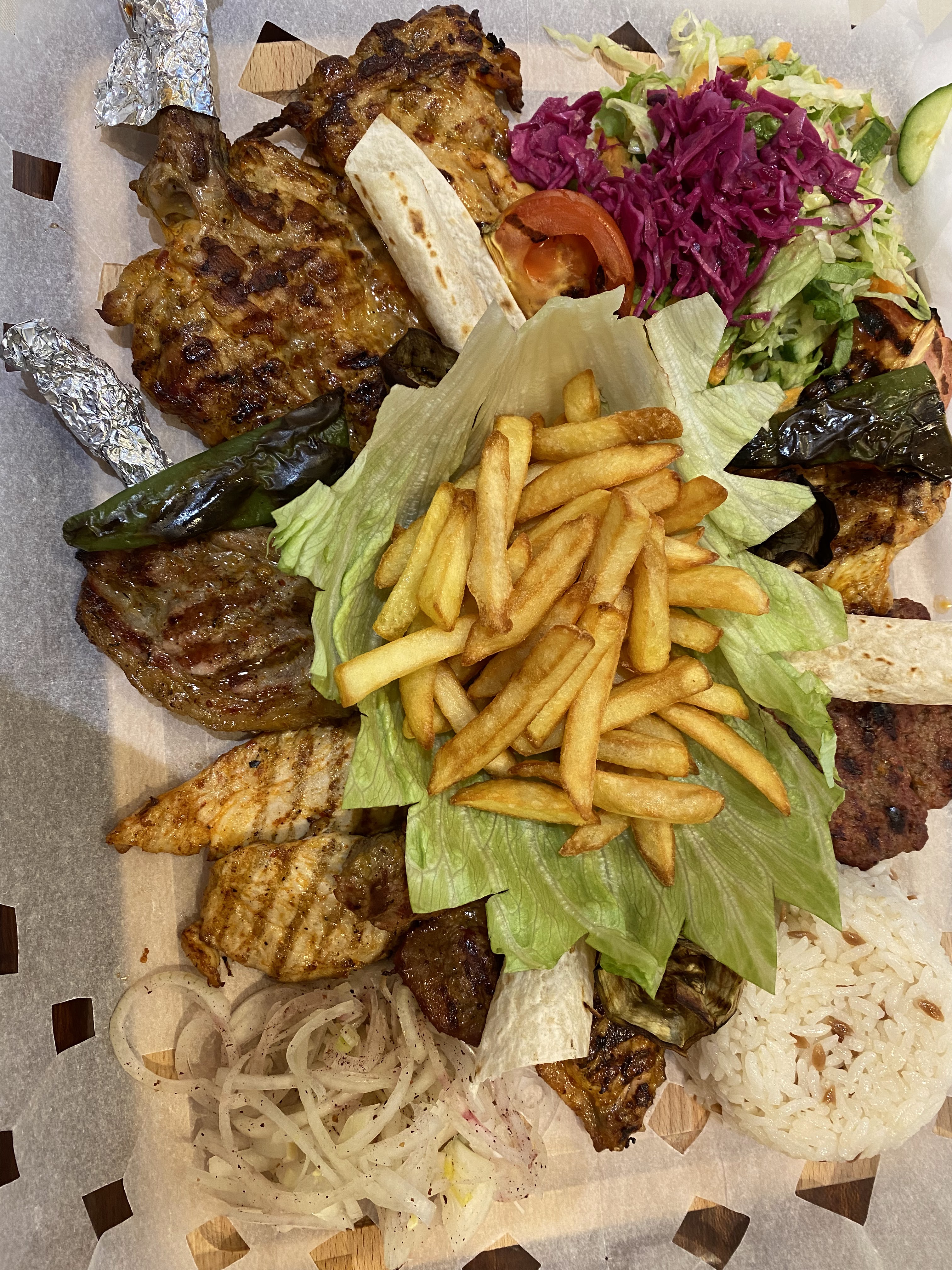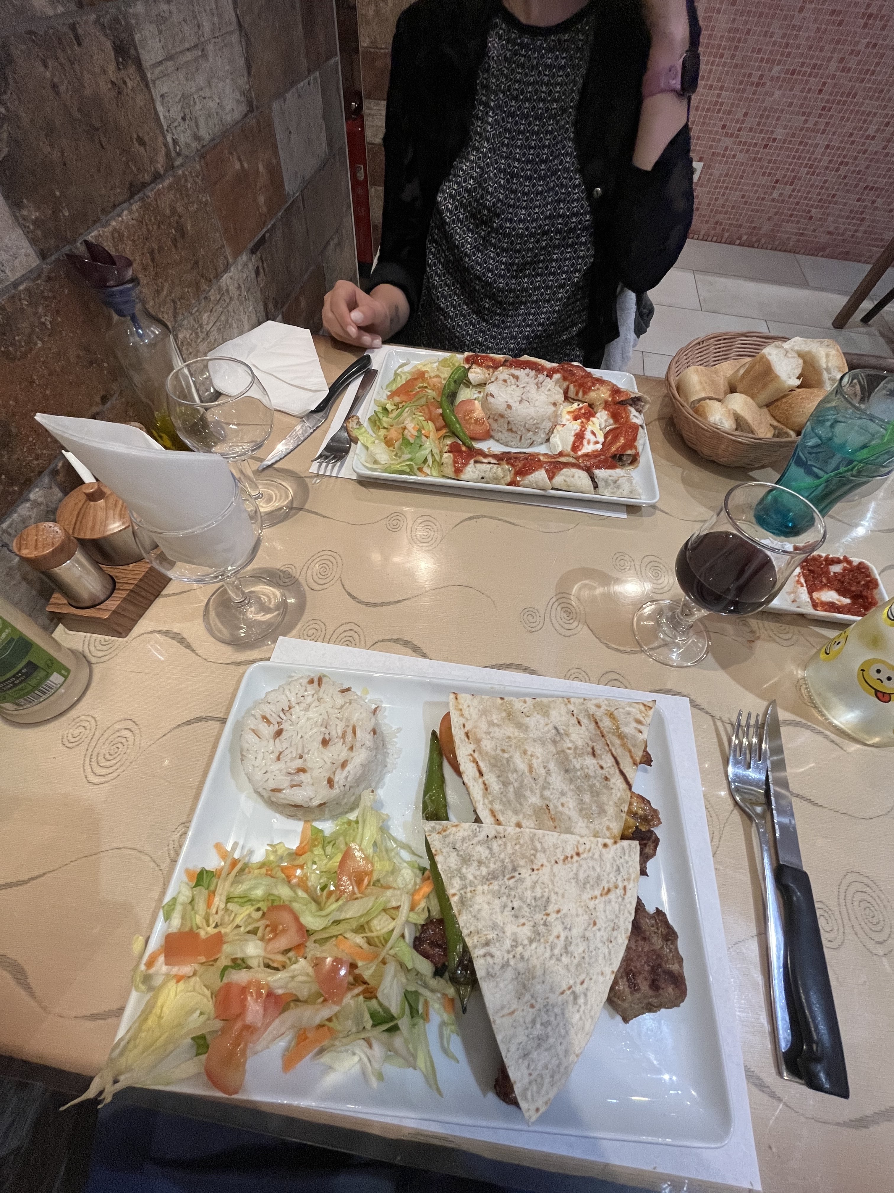Des plats copieux et excellent avec beaucoup de saveurs!! Le personnel super aimable qui nous ont fait découvrir et laisser goûter avant de commander, super patient et très gentils qui sont plusieurs fois venues voir si tout se passait bien. Je vous recommande fortement le Adana. Terrasse super mignonne bien aérée et grande.