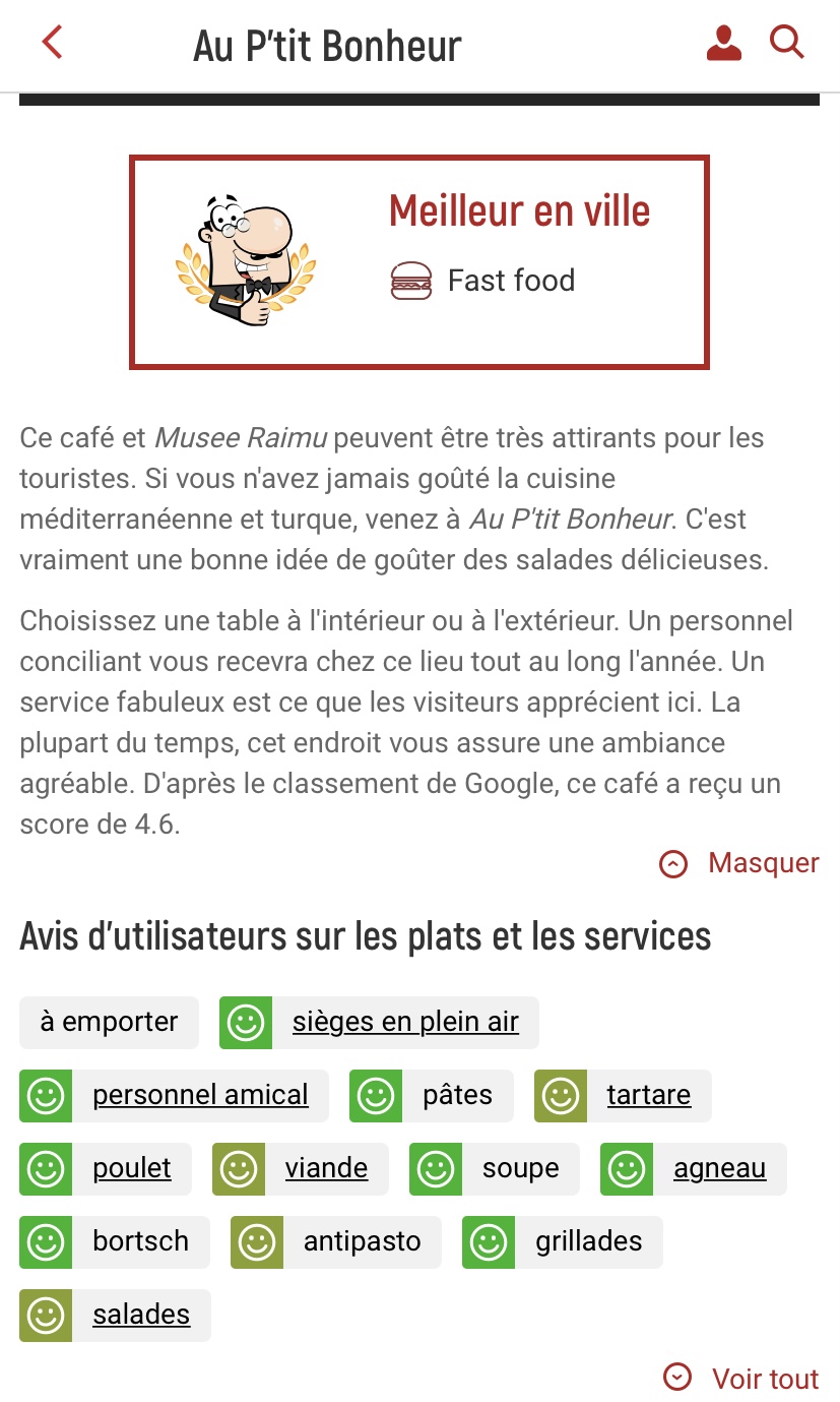 Le Ptit Bonheur c'est le bonheur dans l'assiette ! Patron et personnel très accueillants Cuisine..... les mots ne sont pas suffisants.... excellent n'est pas assez représentatif ! Ambiance authentique, sans chichi Je recommande à 10000% Proche de l'aéroport de Marseille.... ne mangez pas mcdo...faites vous plaisir au Ptit Bonheur !