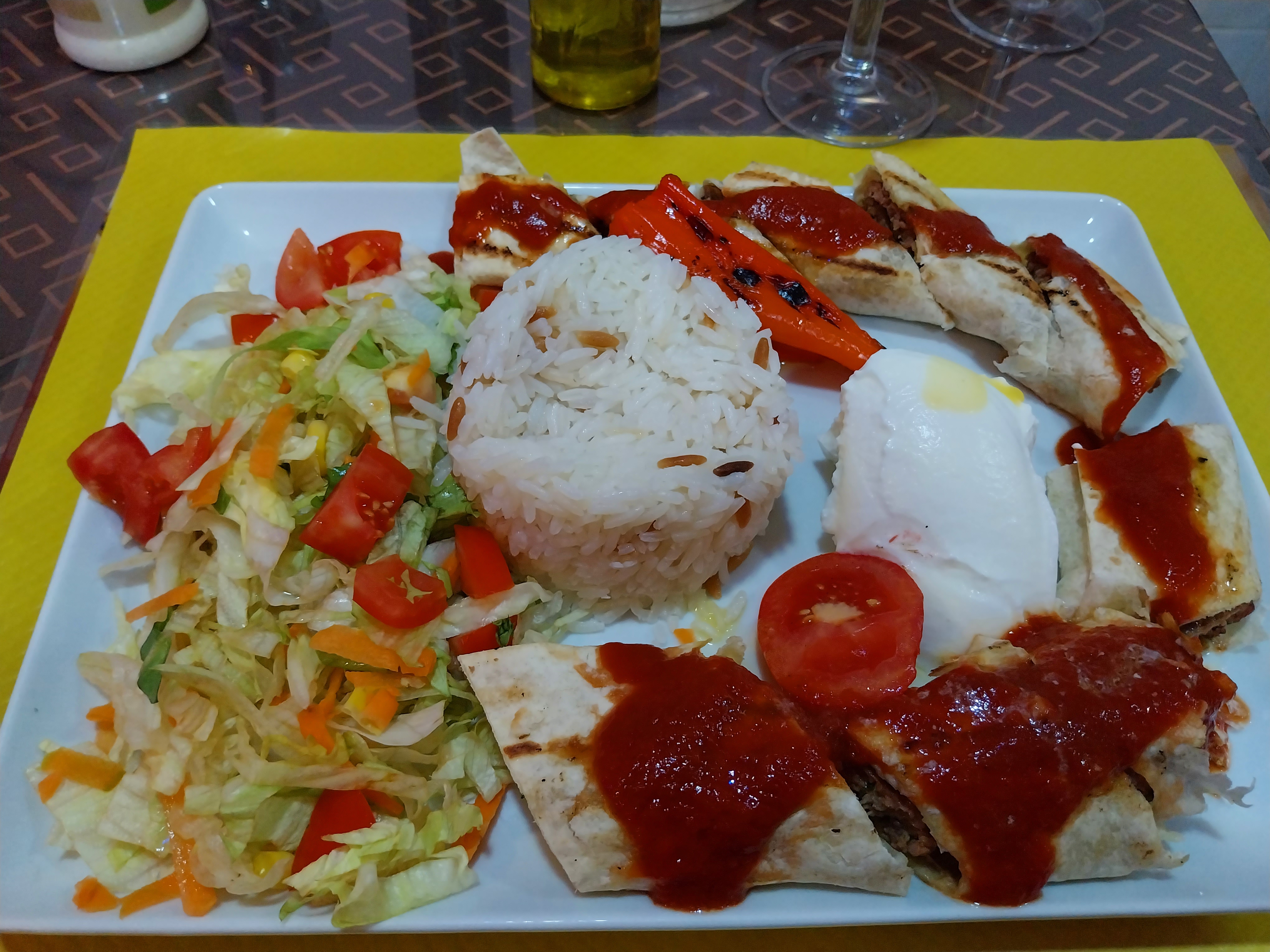 J'ai pris une assiette de brochettes de poulet, j'ai pu choisir mon accompagnement donc je suis super contente. Plats copieux, bons et un bon rapport qualité prix. L'accueil est toujours chaleureux, la nourriture est tres bonne ( specialités turques), une terrasse ombragée l'été 😀.
