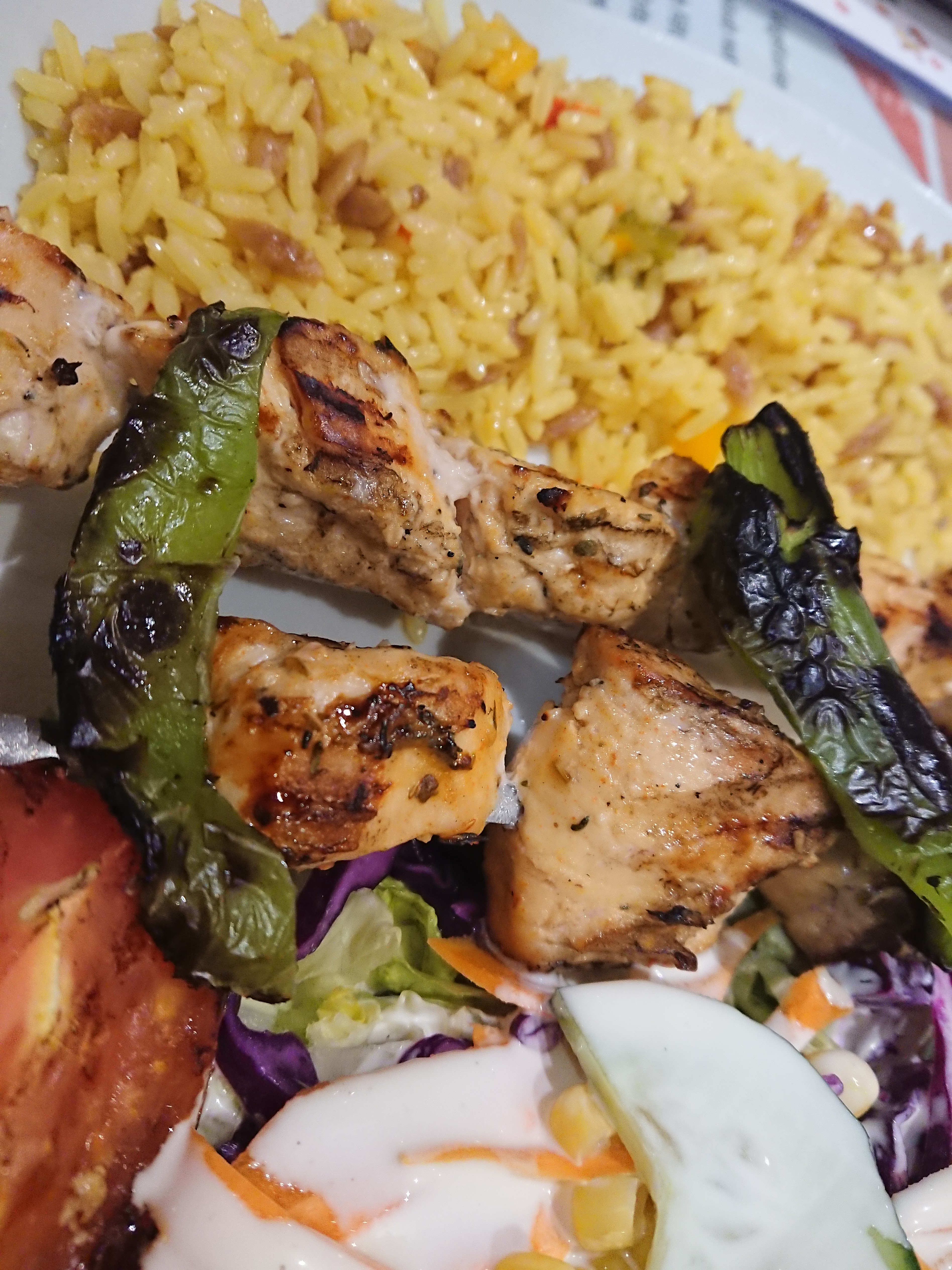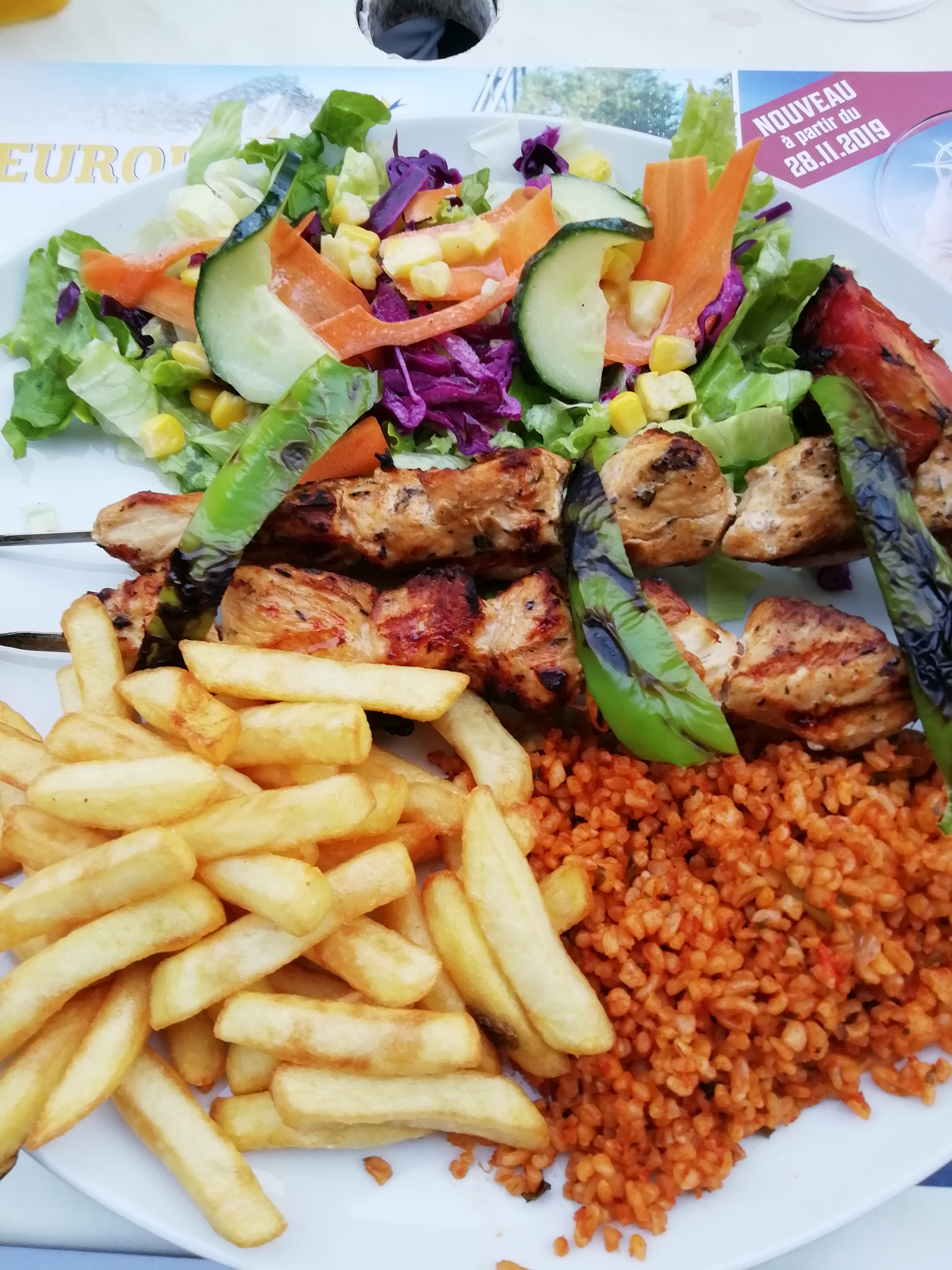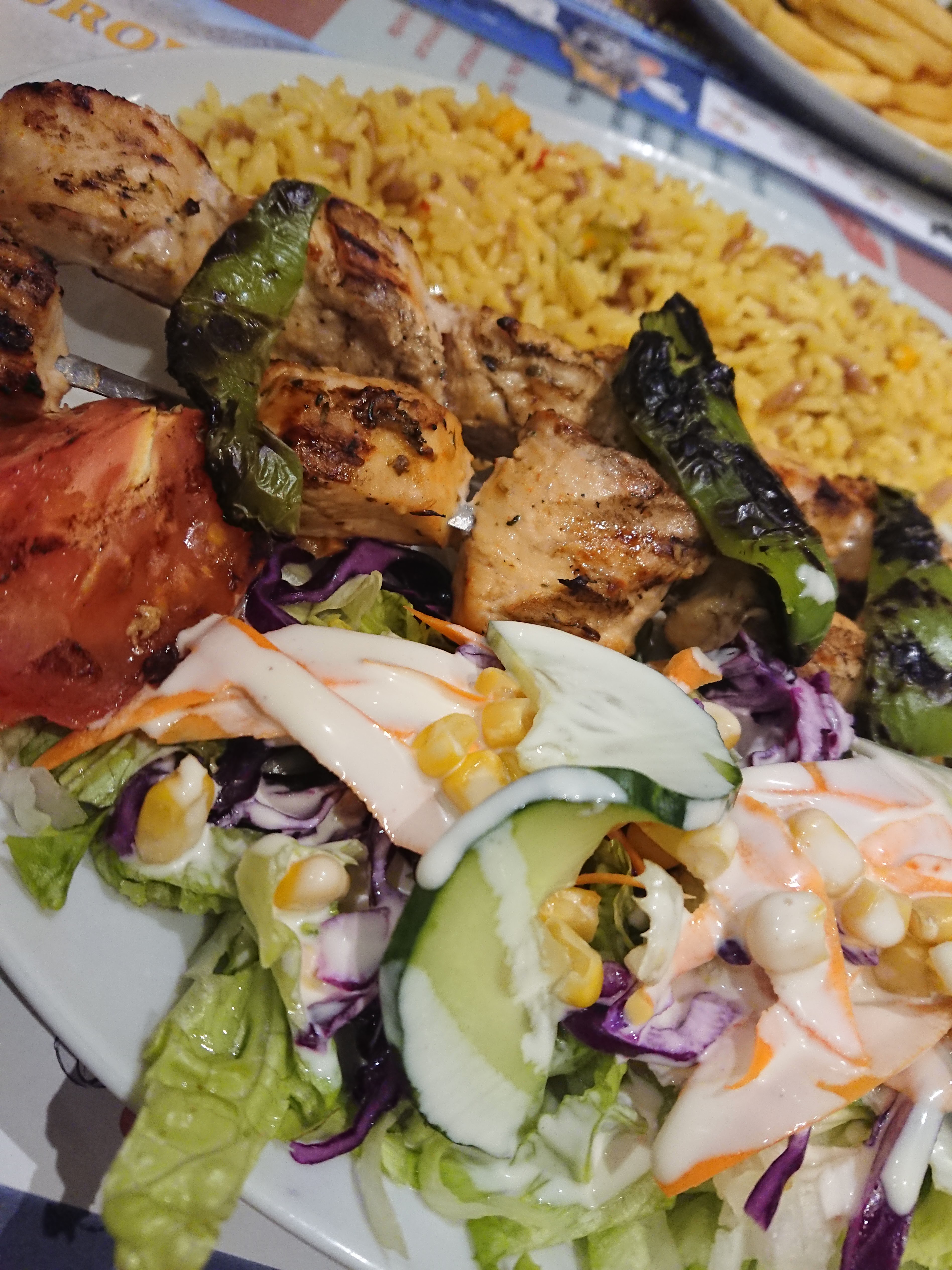 La chasse à la nourriture turque sur les critiques de Google est tombée sur celle-ci dans la vieille ville. Le personnel était très sympathique, je pense que c'était les propriétaires, ils servaient une très grande portion de nourriture par rapport à n'importe quel autre restaurant de Colmar, ce que je suis heureux de voir. La nourriture était fraîche et bien installée dans le ventre, vérifiez mes photos, alors voyez à quoi ça ressemble. Je commande des brochettes de poulet avec du riz.