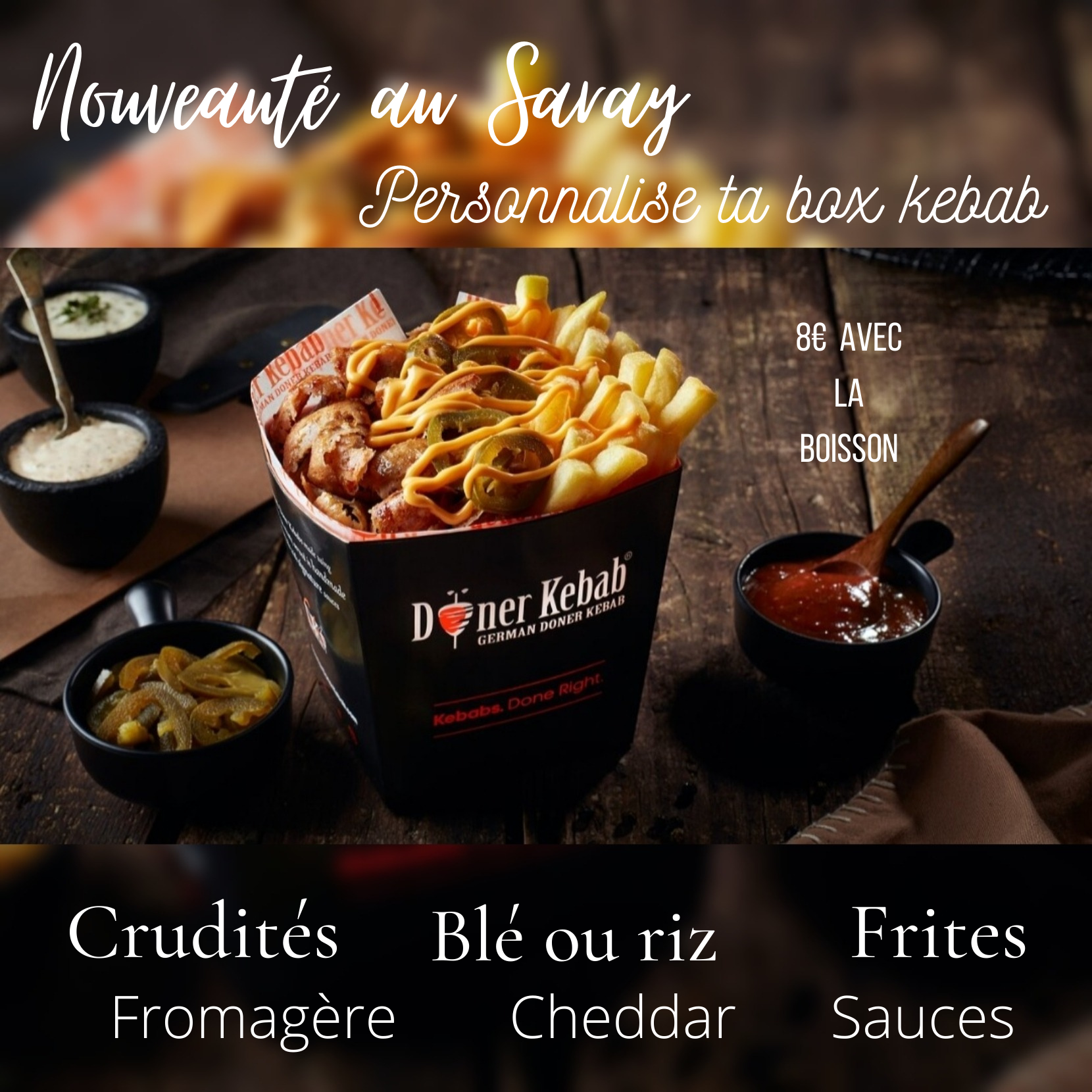 Repas à emporter : kebab box excellente ! Bonne quantité, prix très attractif. Personnel gentil et à l’écoute. Très propre et rapide. Je recommande et je reviendrai.