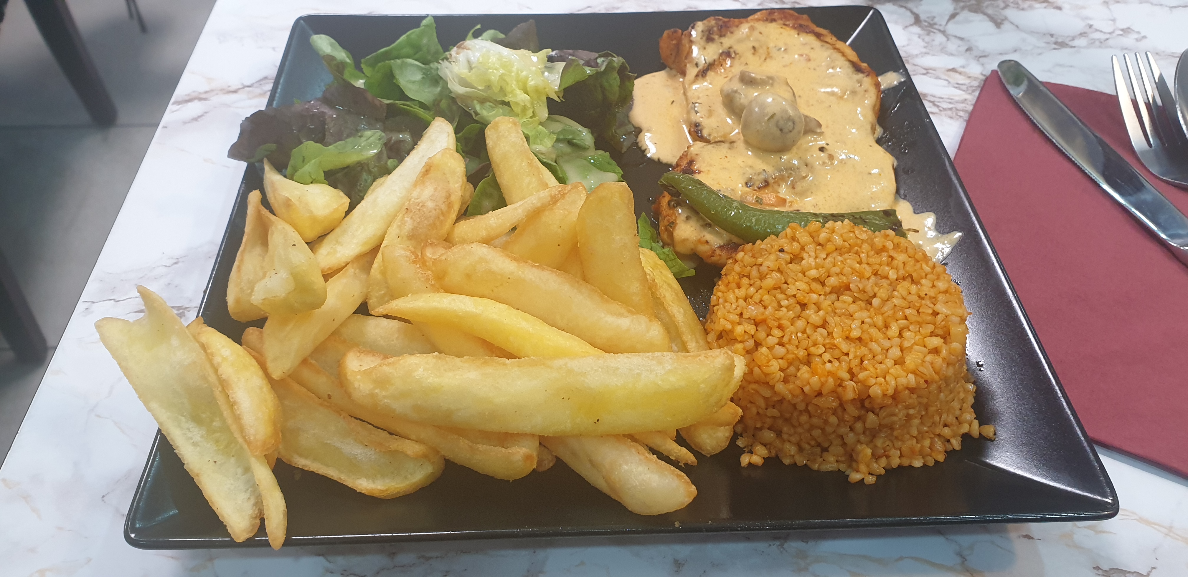 Plat bon mais escalope aux champignons avec 2 champignons.. un peu cher mais c'est bon en goût en tout cas.