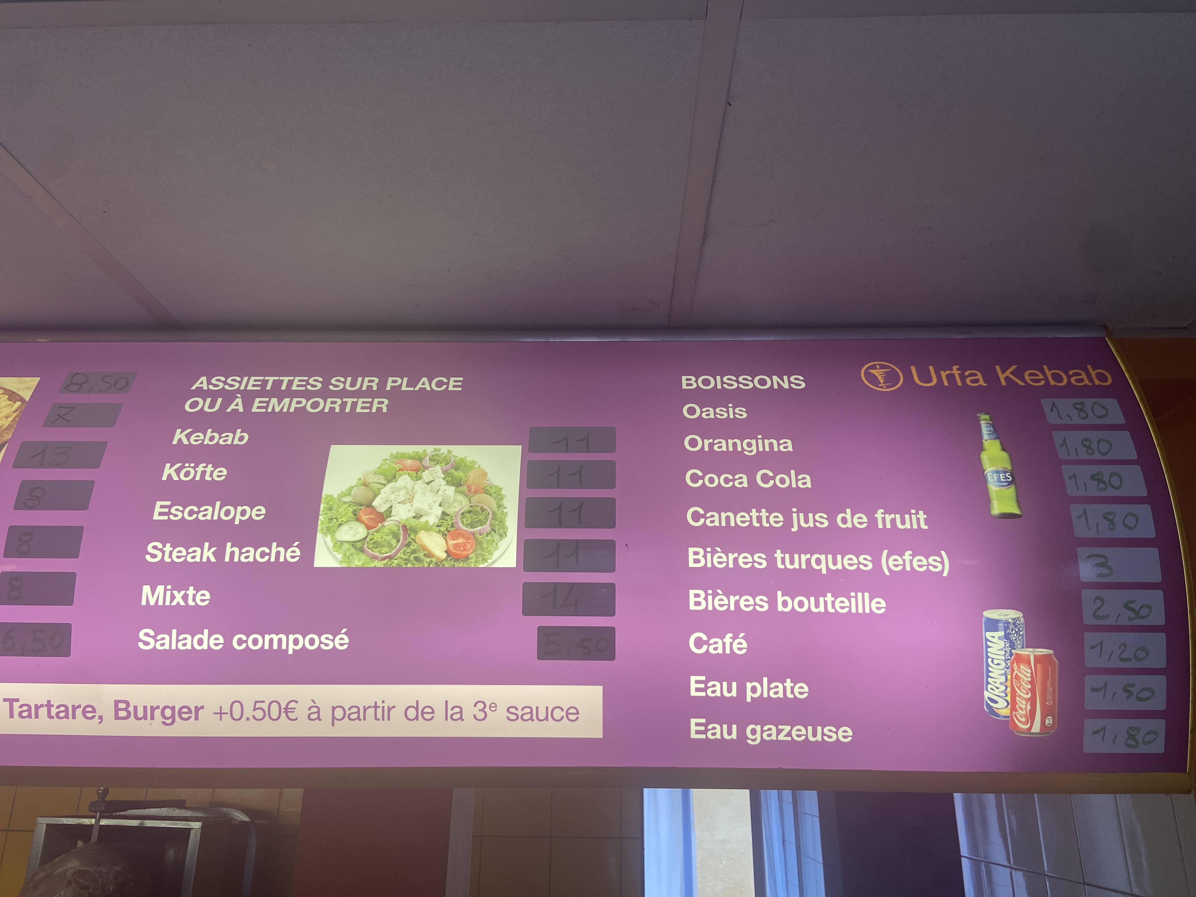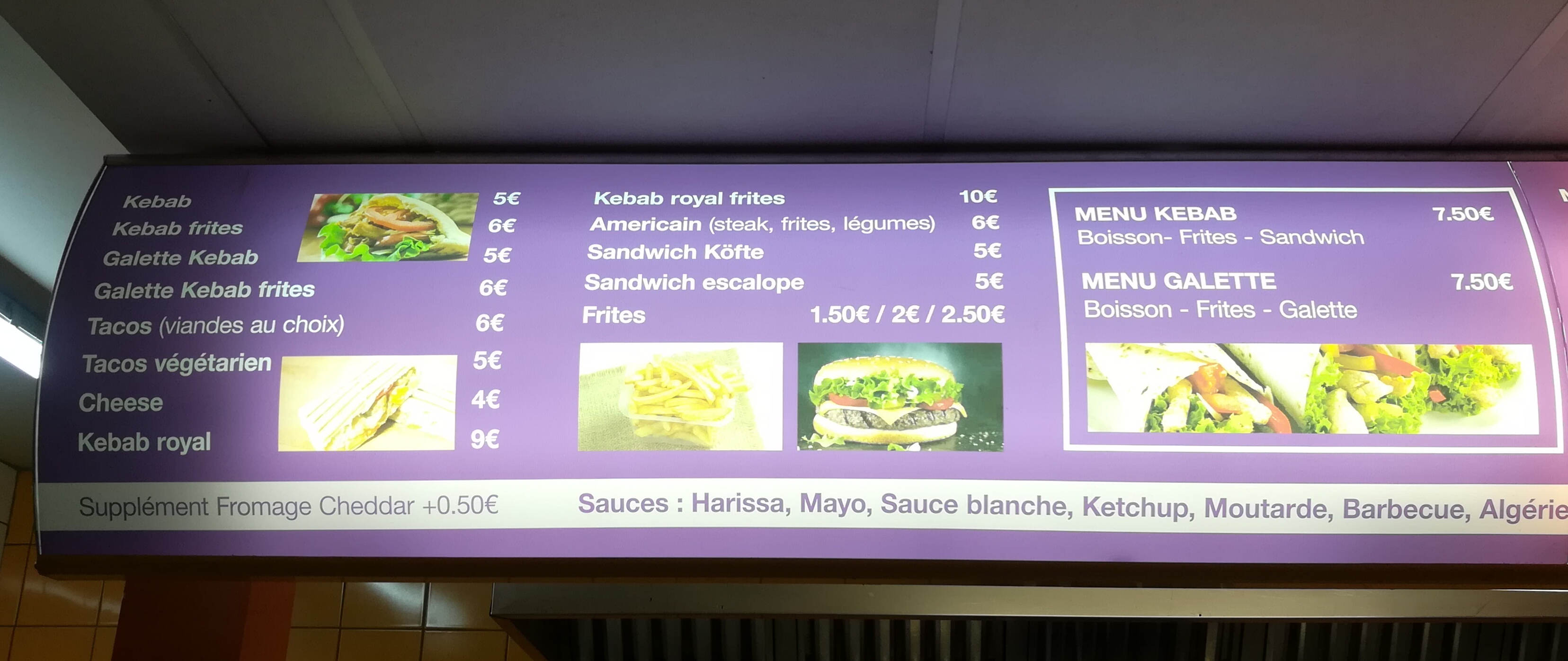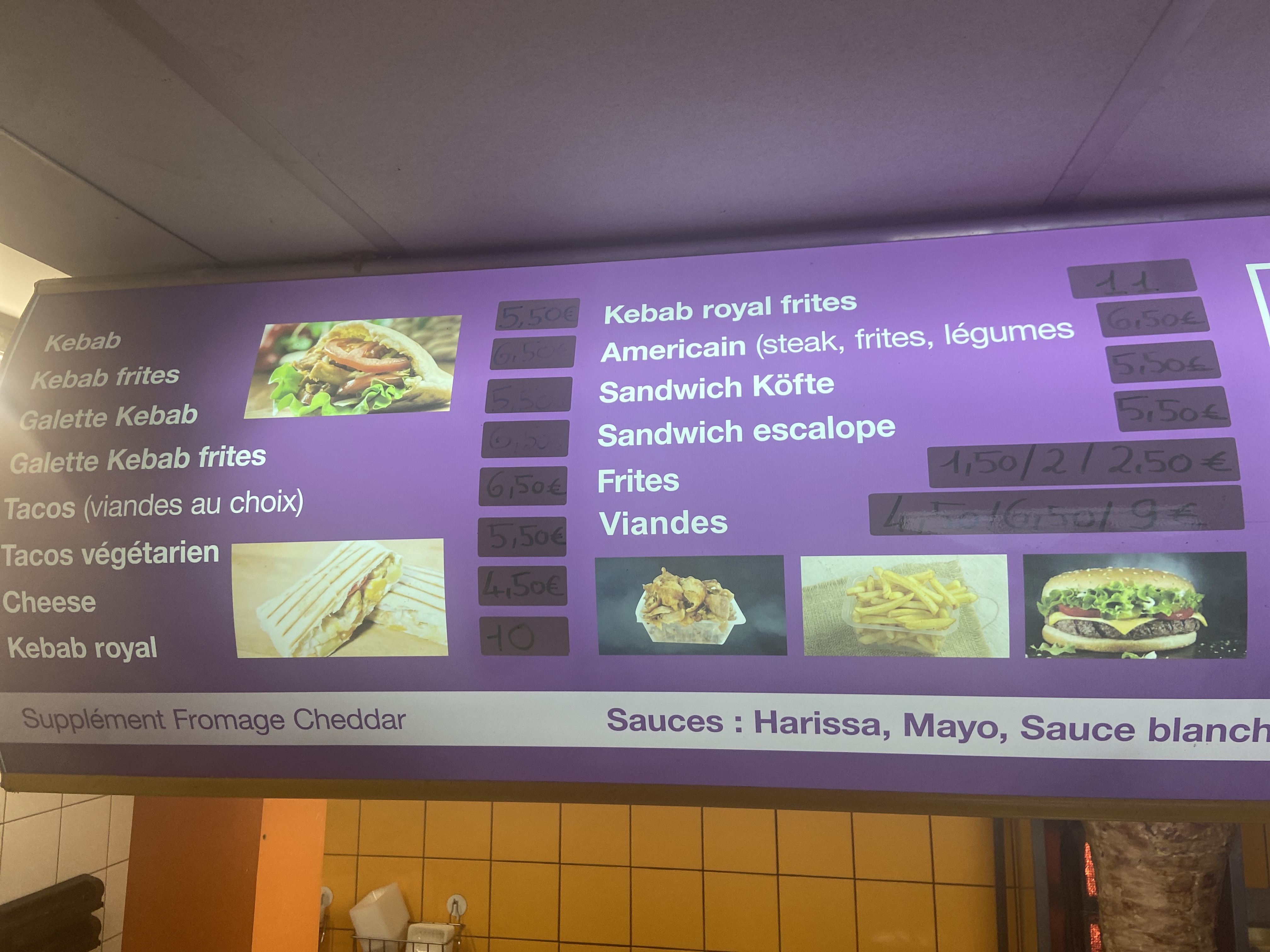 Étant arrivée à l'heure de fermeture (22h), il m'a tout de même proposé un kebab ou un tacos malgré le fait qu'il ne puisse plus me propose de viande steak ou escalope. Ce qui est compréhensible. Accueil chaleureux
