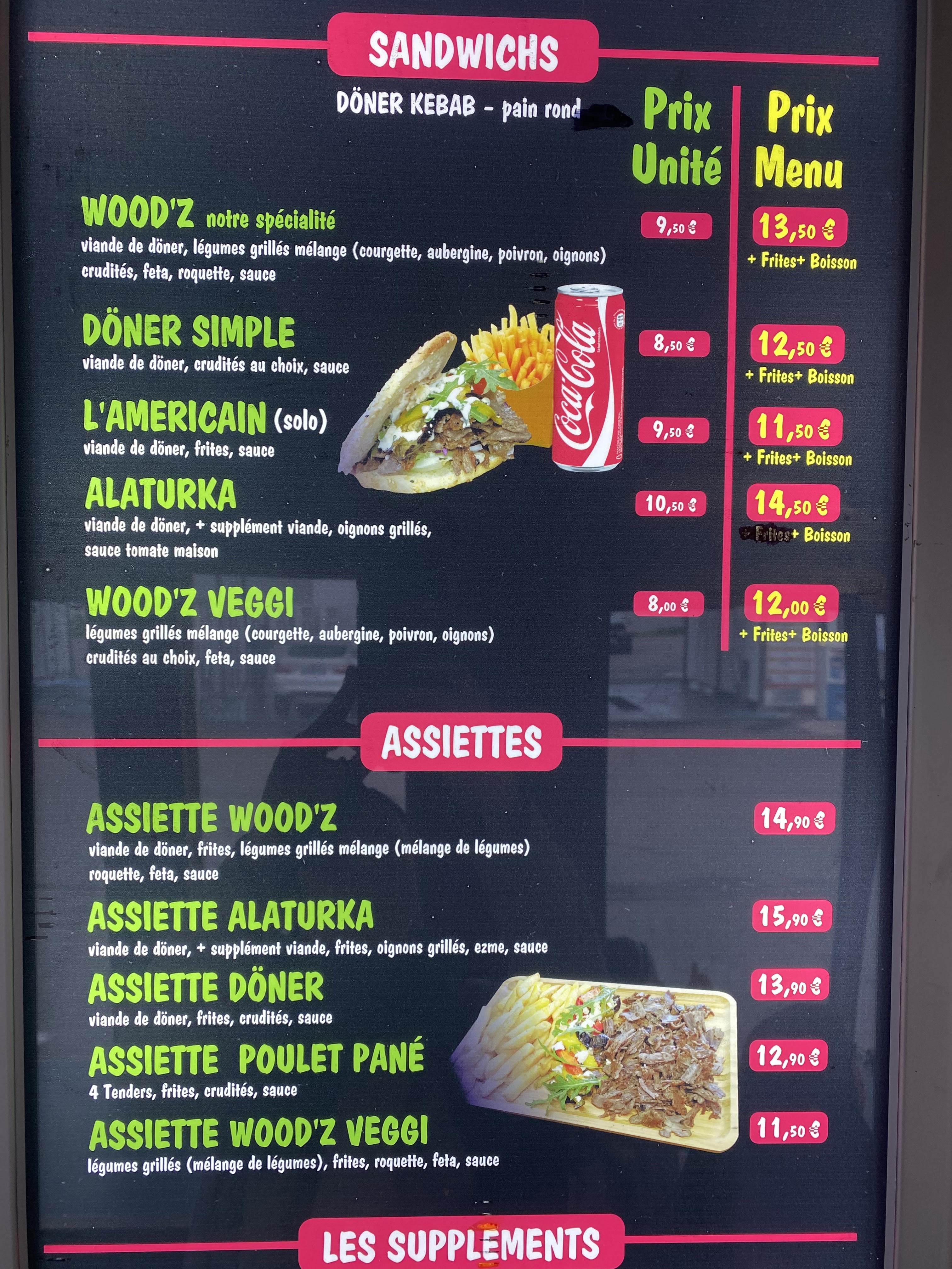 Nourriture plus que qualitative, service rapide et top moins de 5 minutes en général, encore ce soir, arrivé à 20h25 reparti à 20h28, alors oui plus cher que les autres (et encore) mais ne vous fiez pas aux prix, au moins au Woodz, on sait pourquoi on paye, et on mange largement à notre faim, que ce soit les assiettes ou les doners, jamais déçu. Allez-y les yeux fermés.